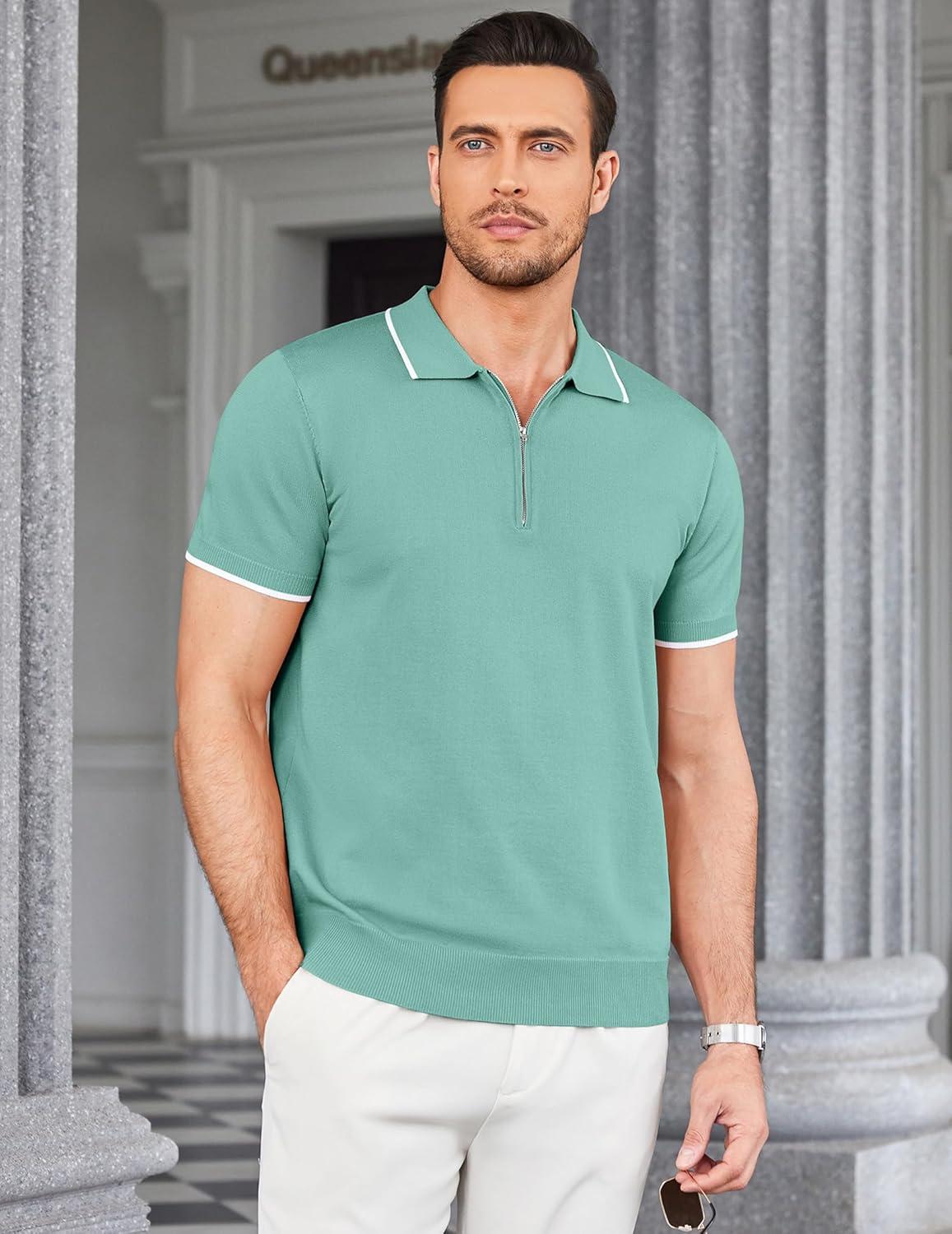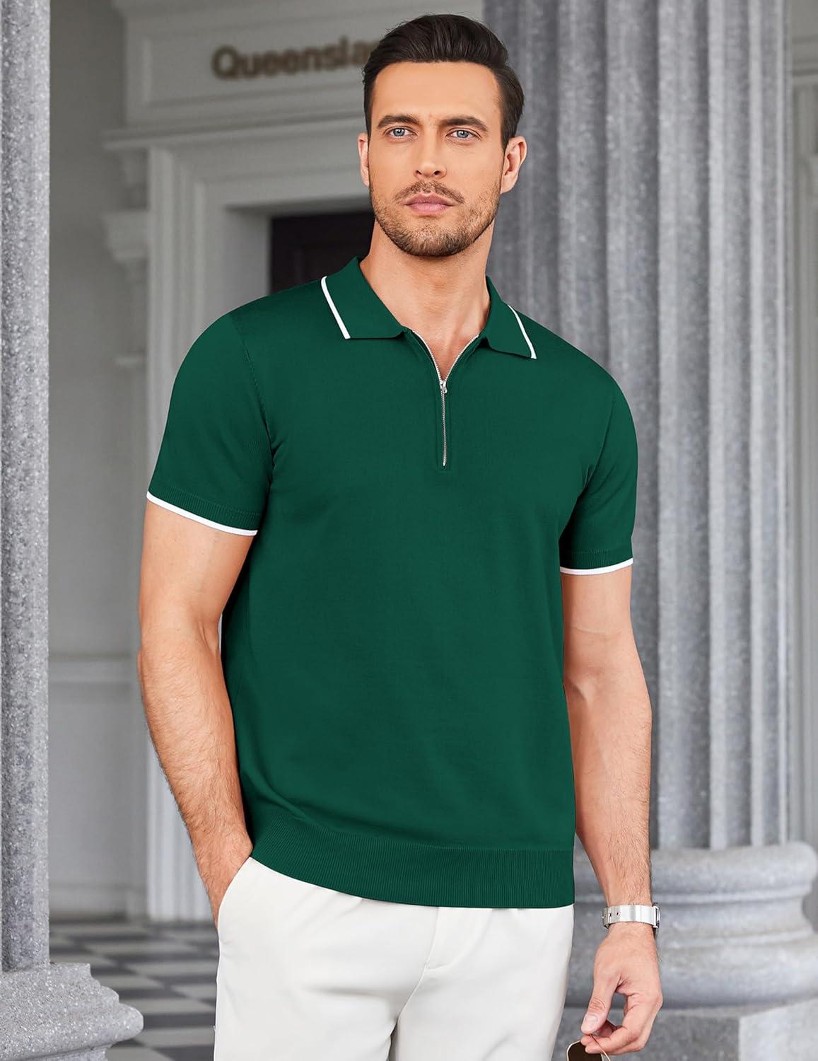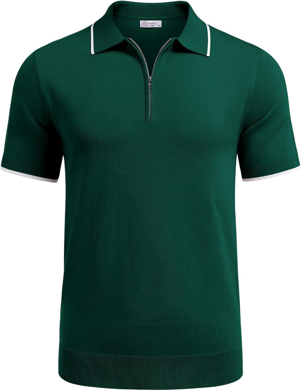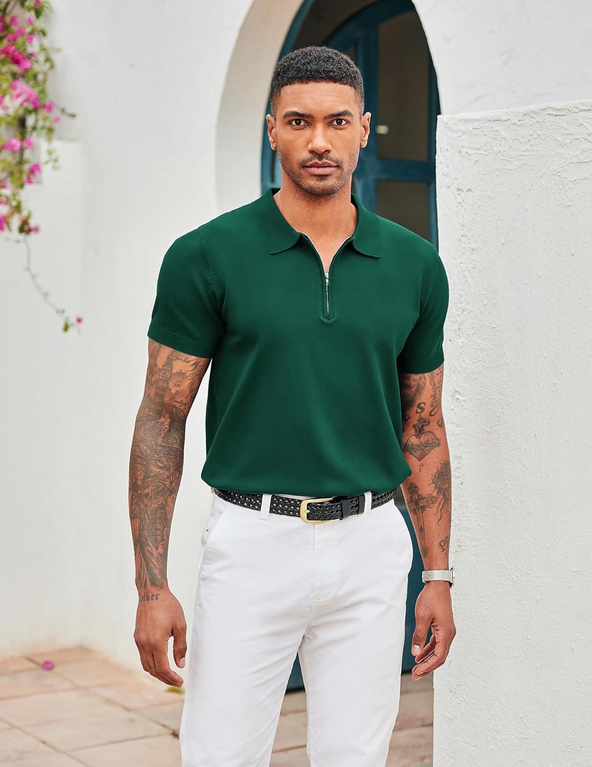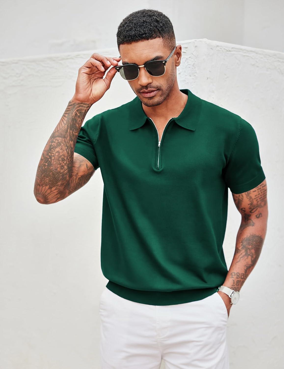 COOFANDY Men’s Zipper Polo Shirt Casual Knit Short Sleeve Polo T Shirt Classic Fit Shirts(Solid- Green)