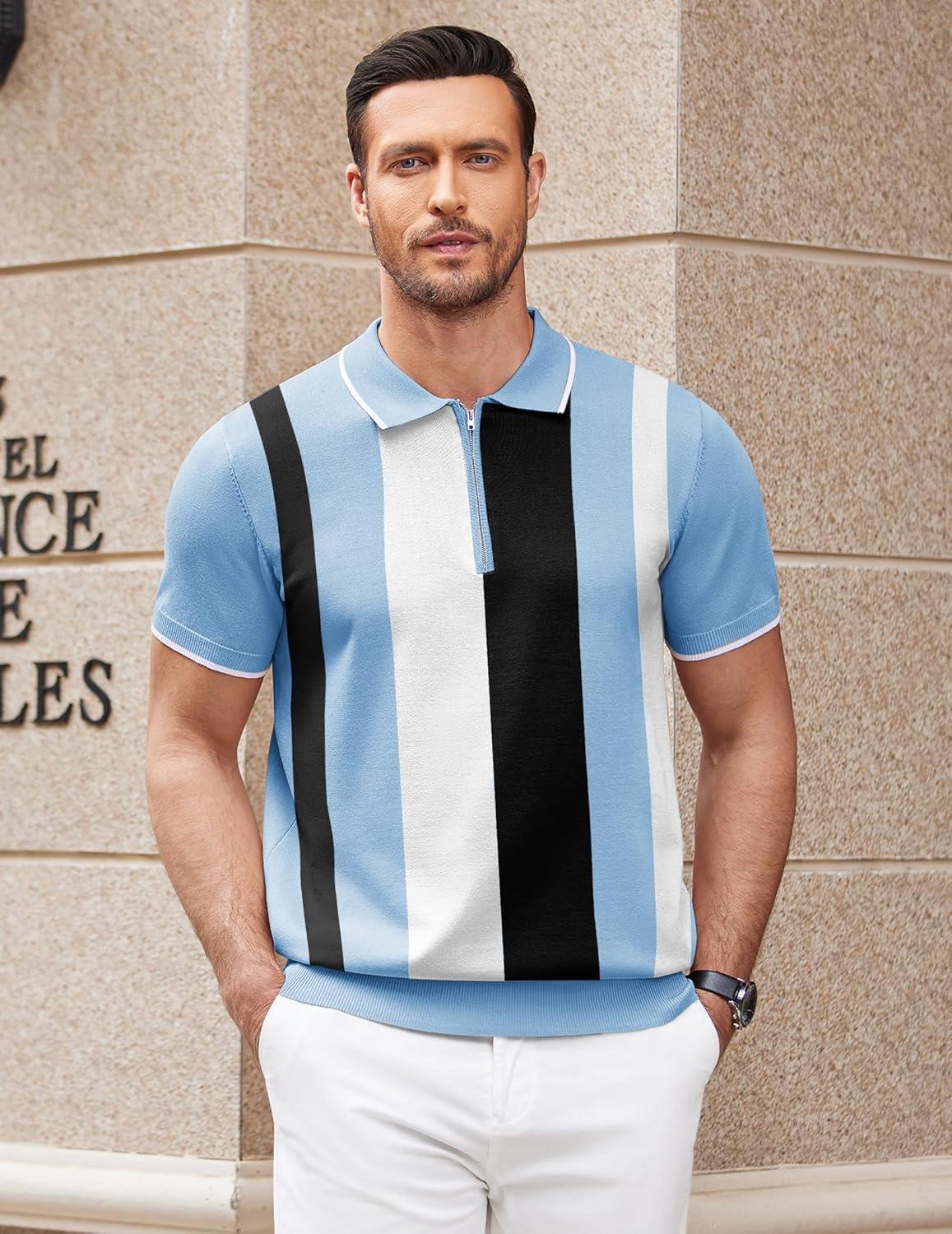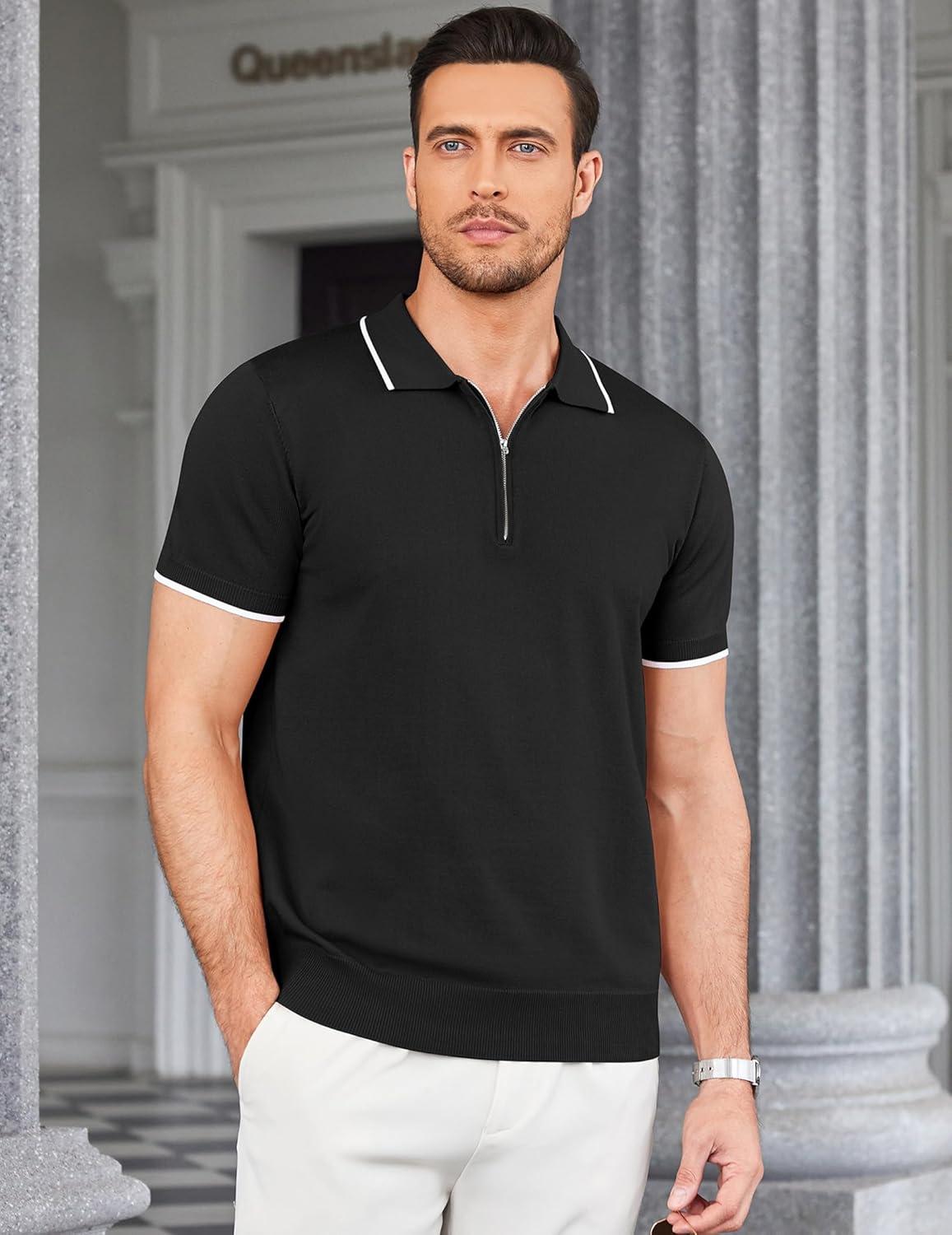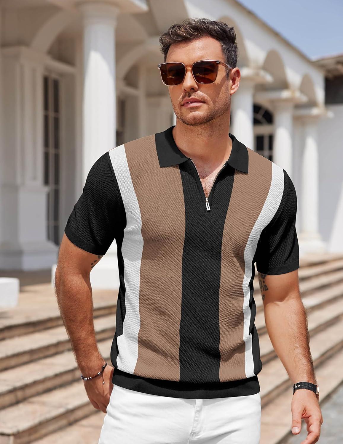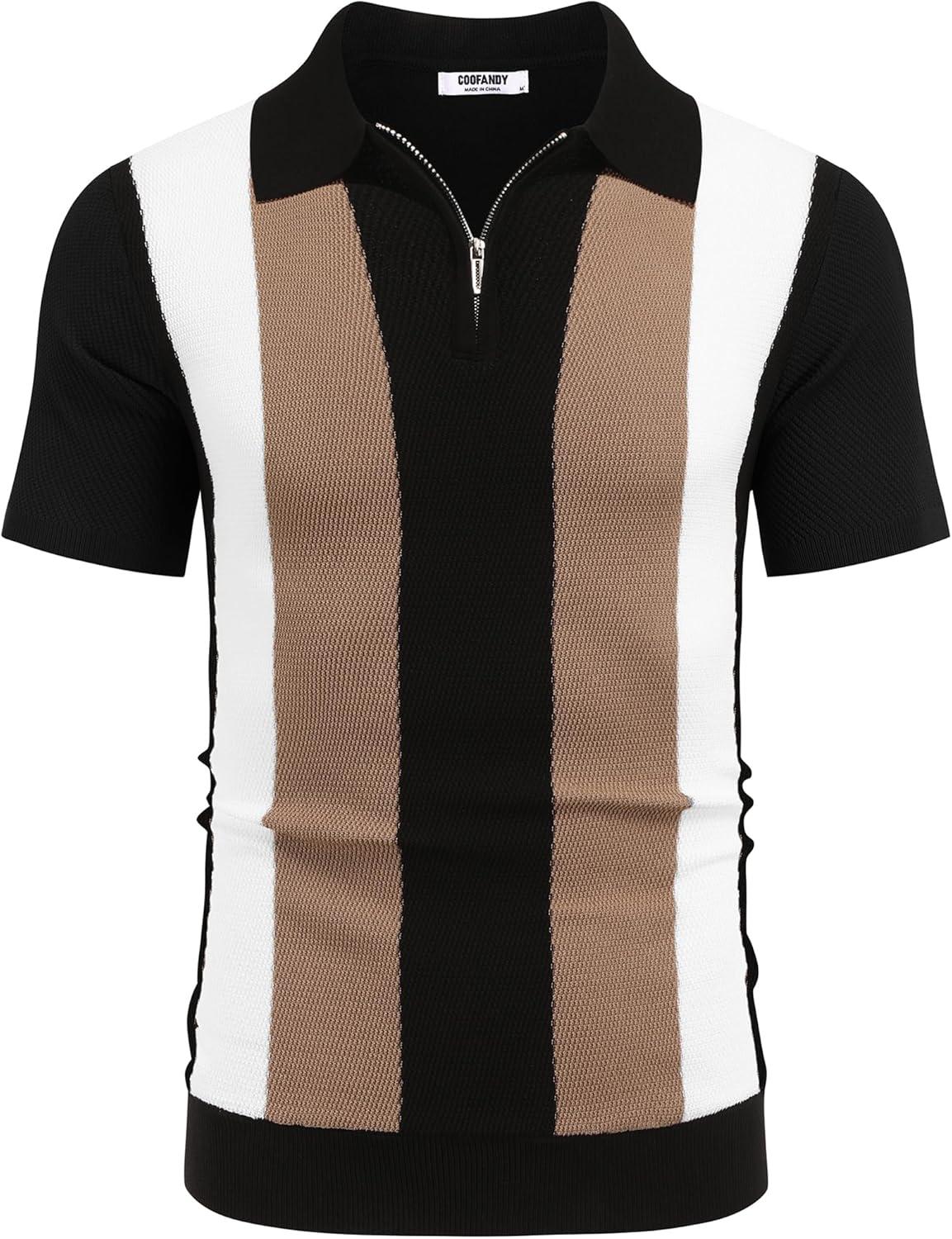 COOFANDY Men’s Zipper Polo Shirt Casual Knit Short Sleeve Polo T Shirt Classic Fit Shirts(Striped Black Striped)