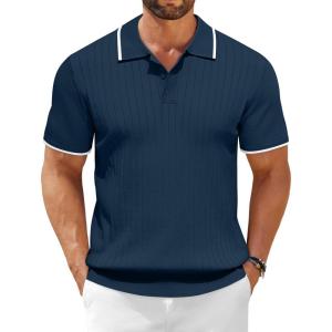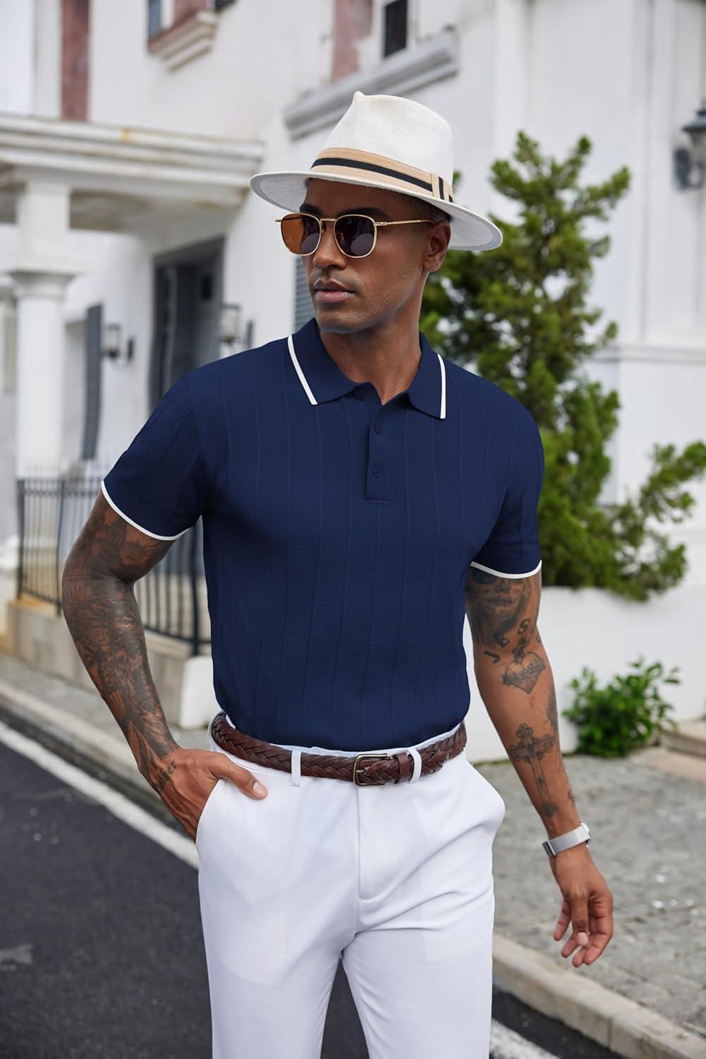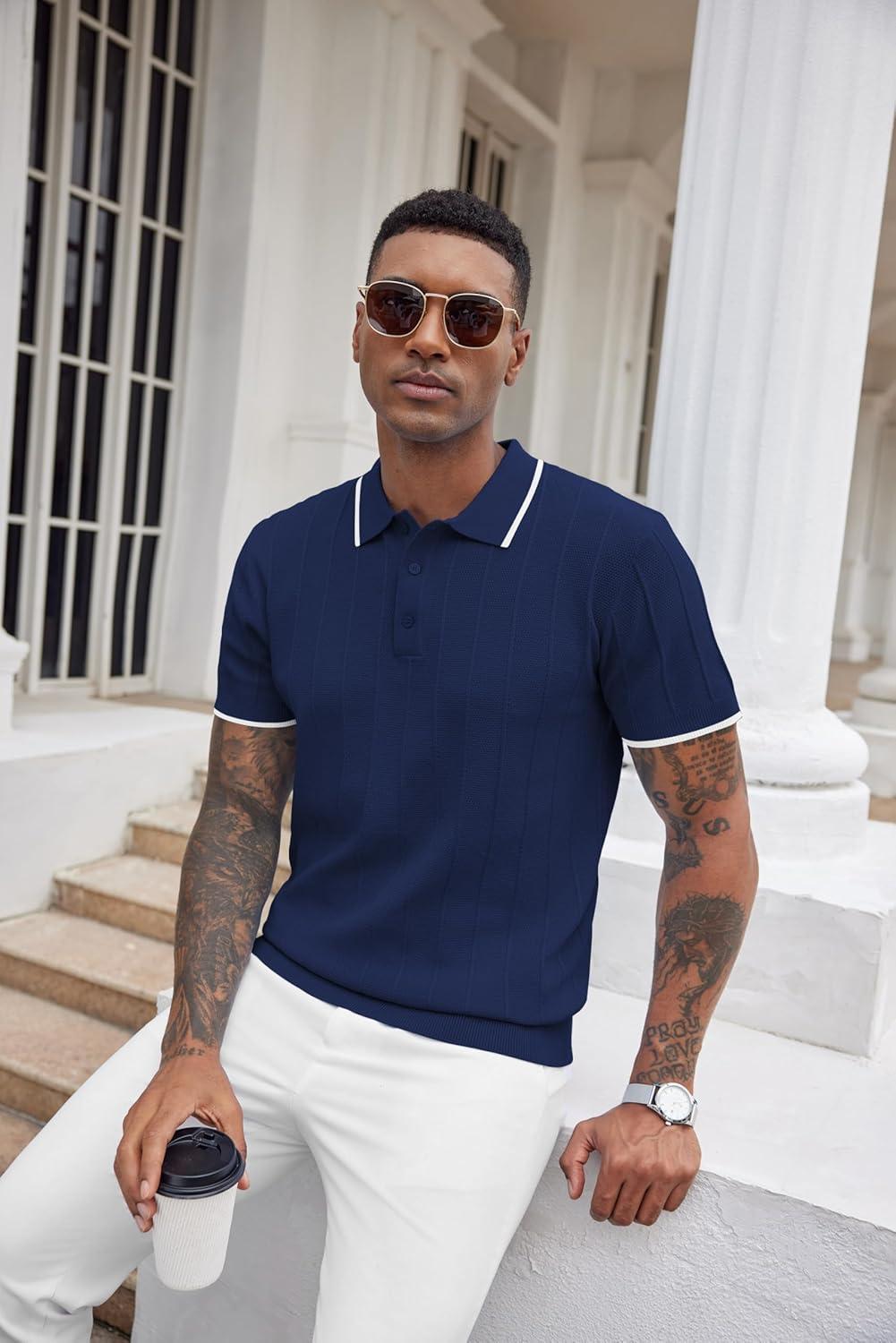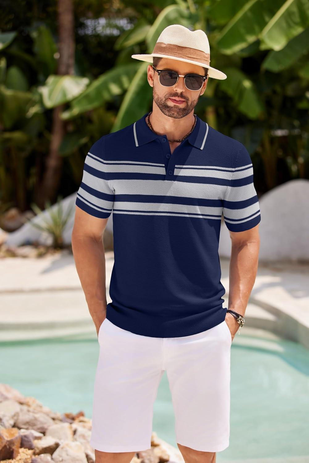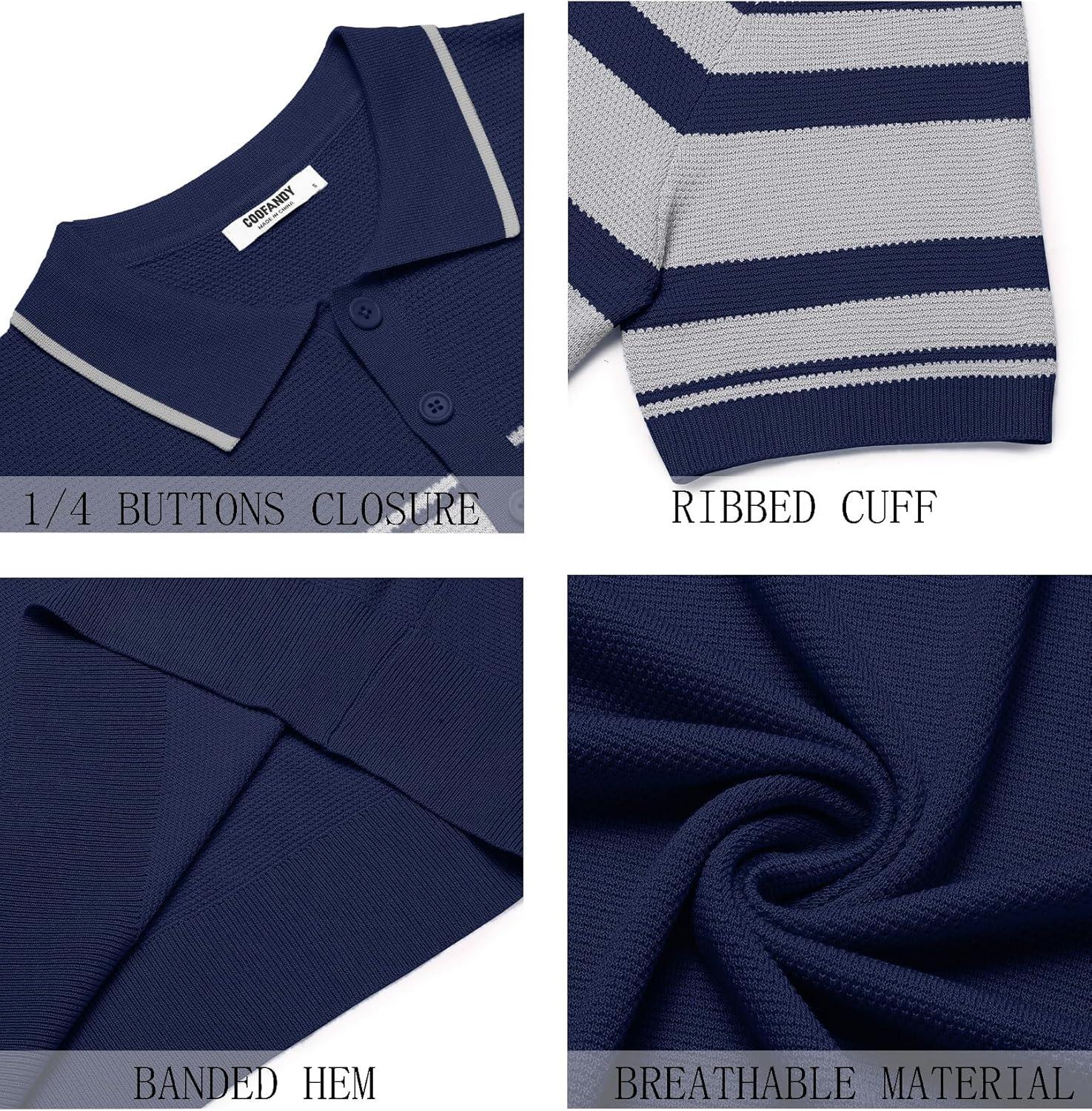 COOFANDY Men’s Zipper Polo Shirt Casual Knit Short Sleeve Polo T Shirt Classic Fit Shirts(Stripes Navy Blue Stripes)