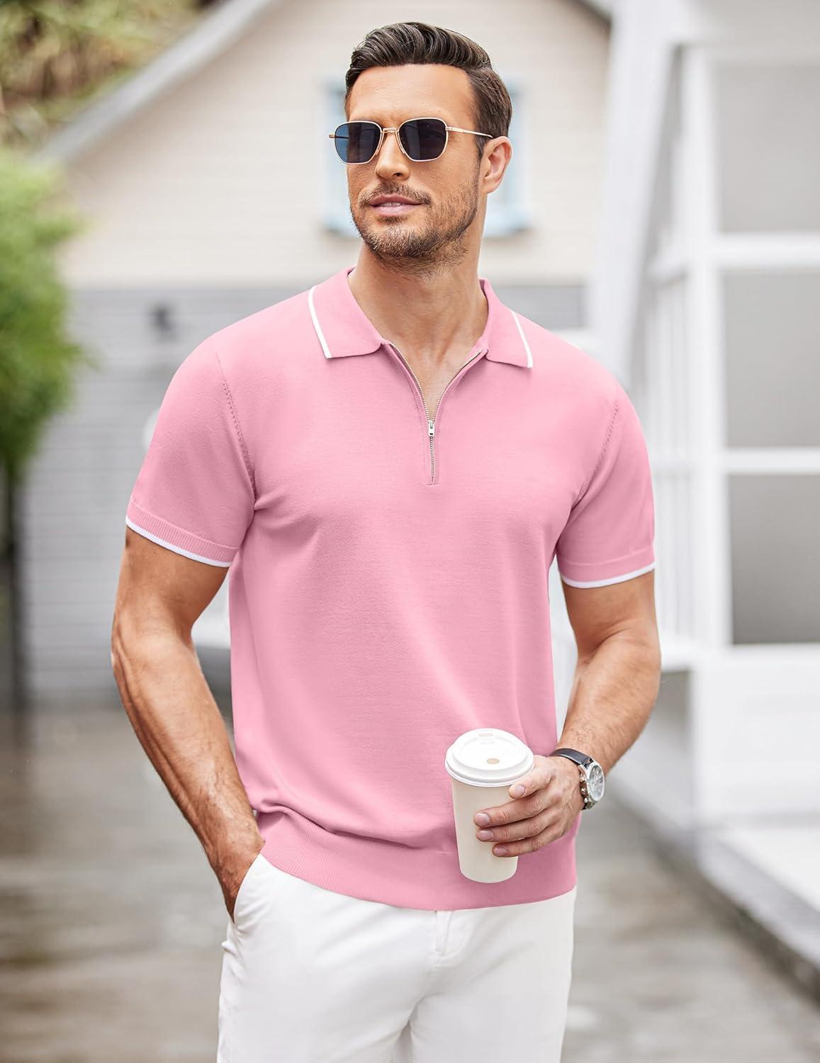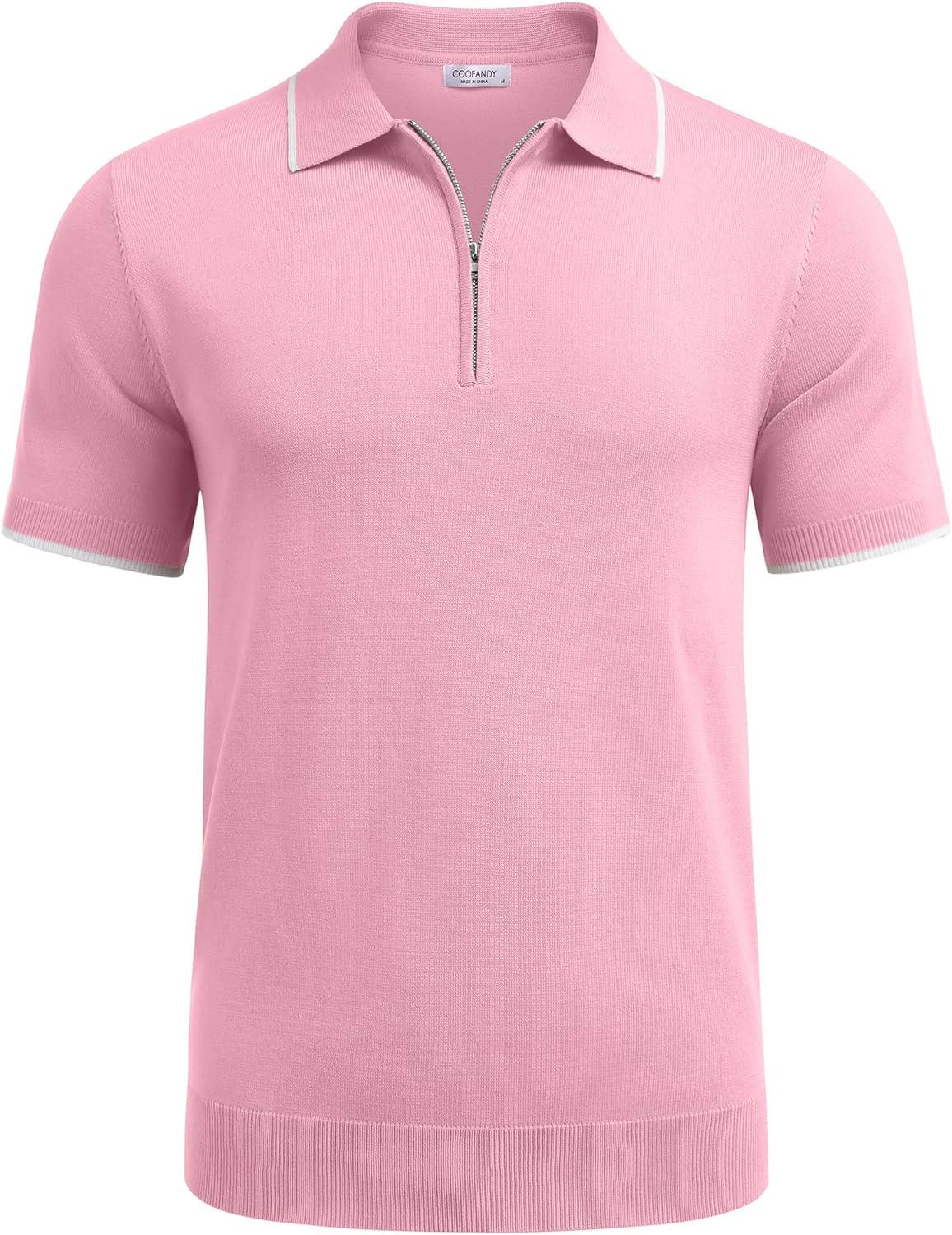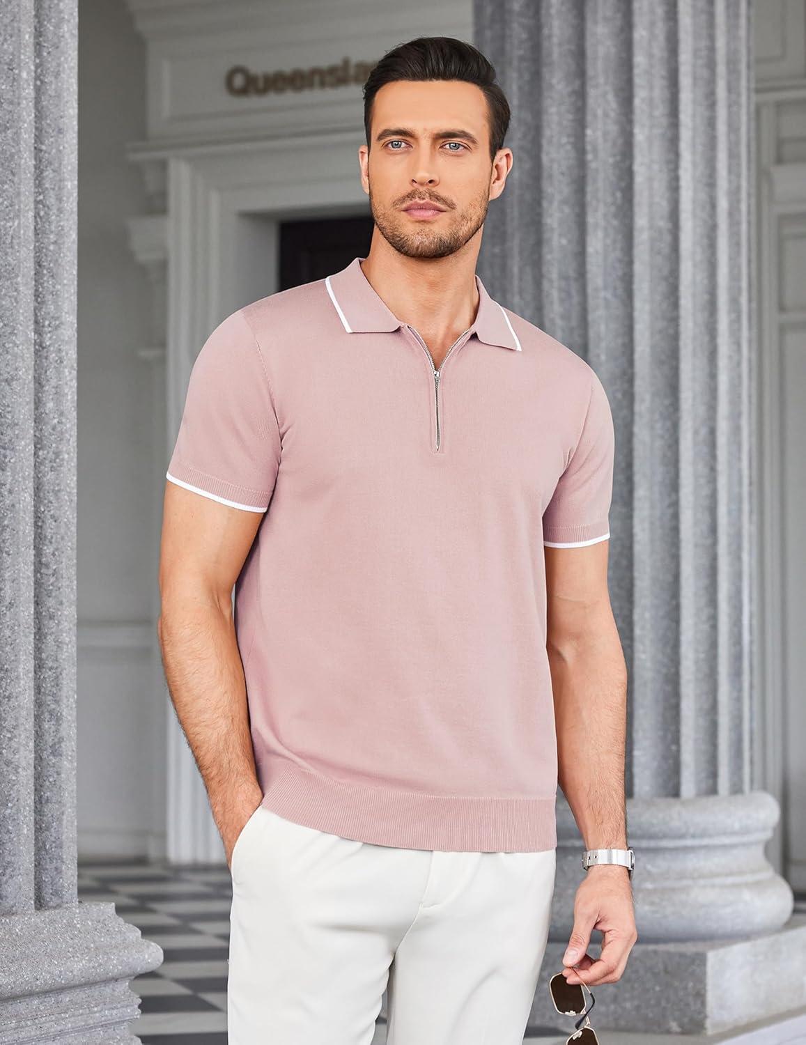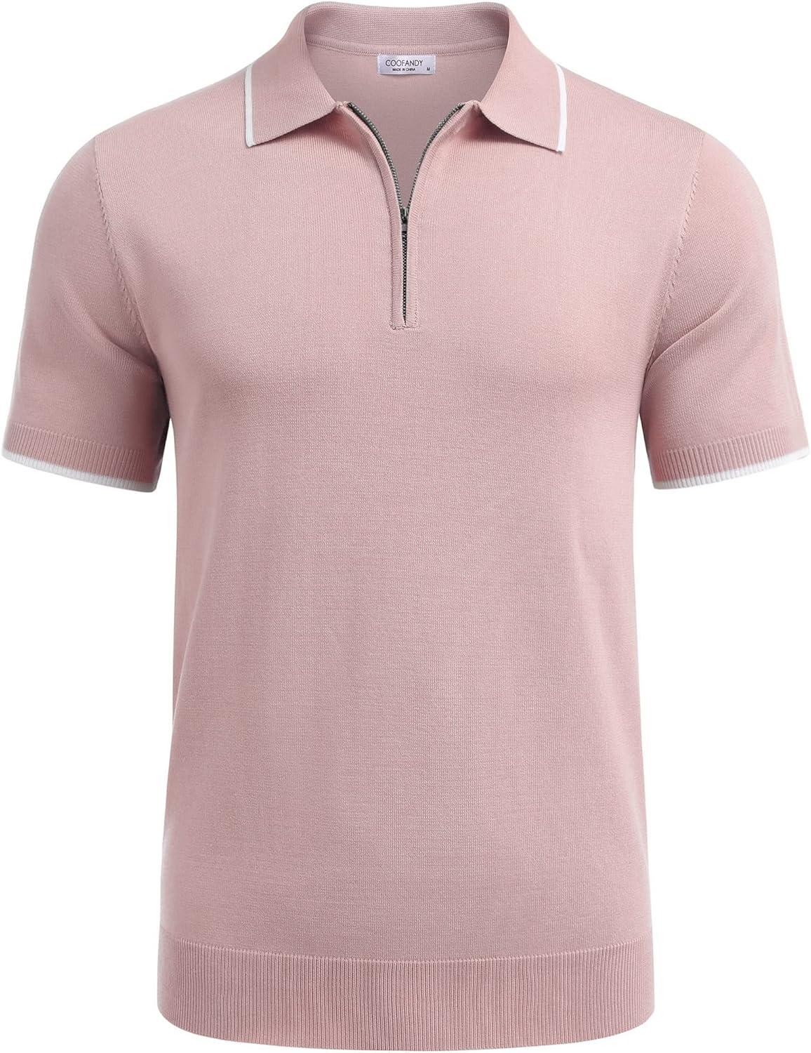 COOFANDY Men’s Zipper Polo Shirt Casual Knit Short Sleeve Polo T Shirt Classic Fit Shirts(Pink)