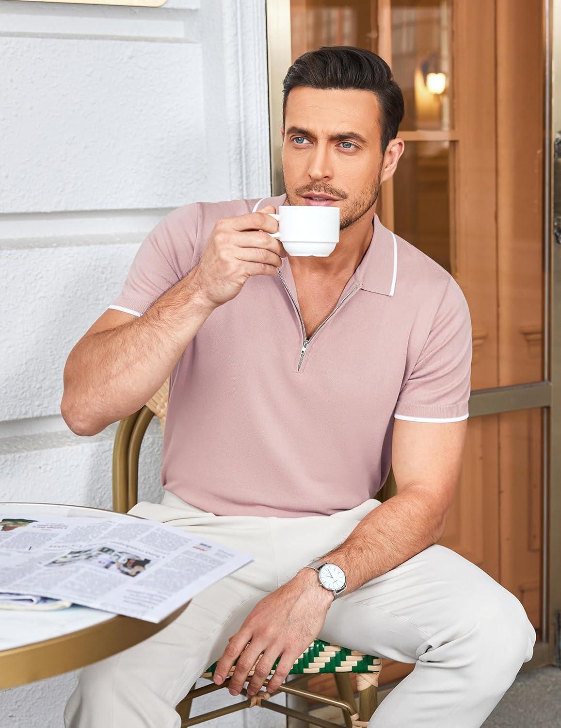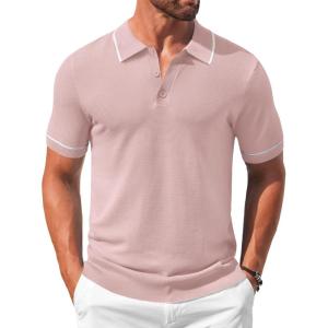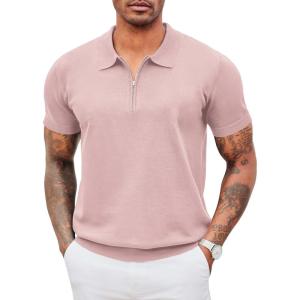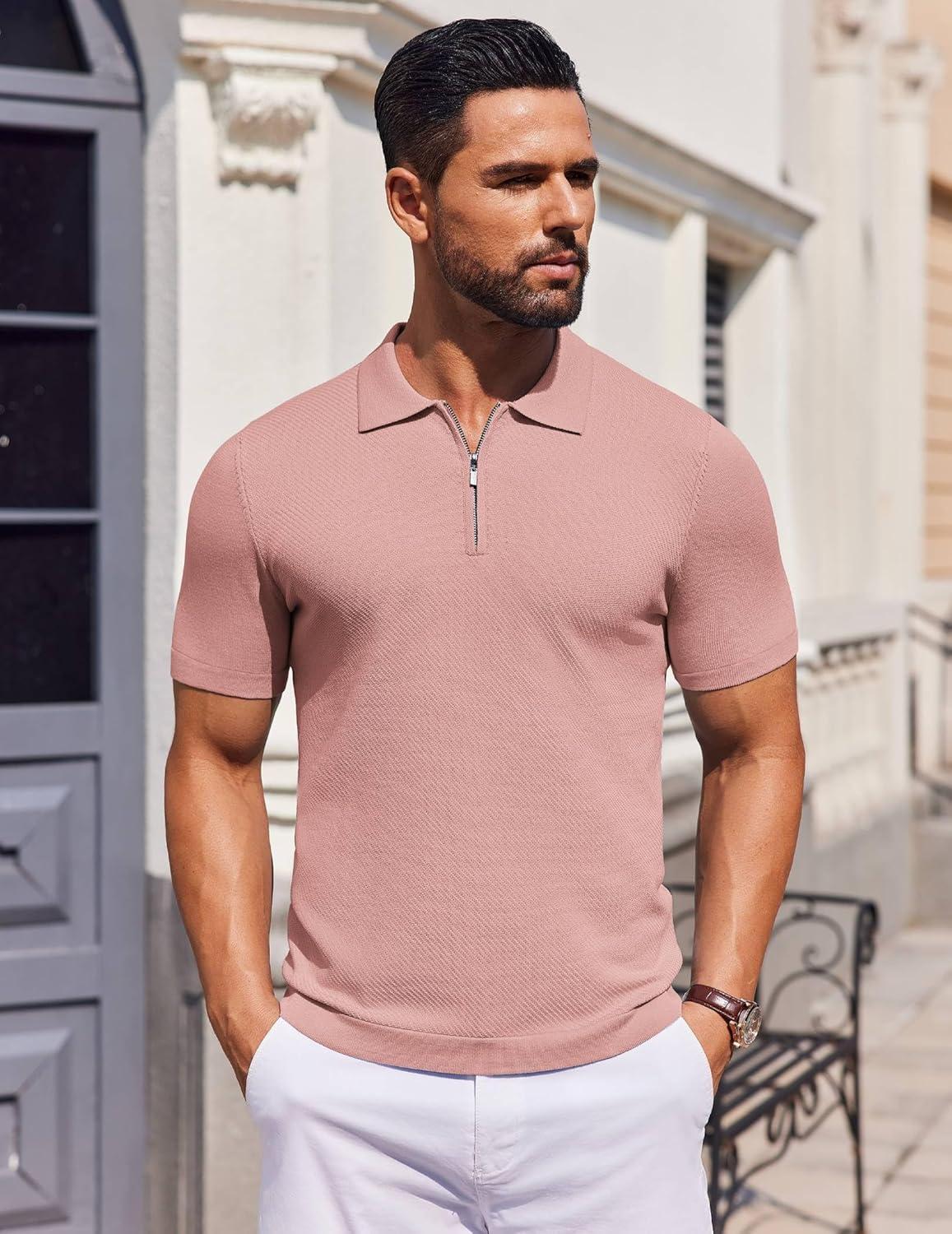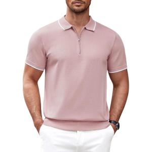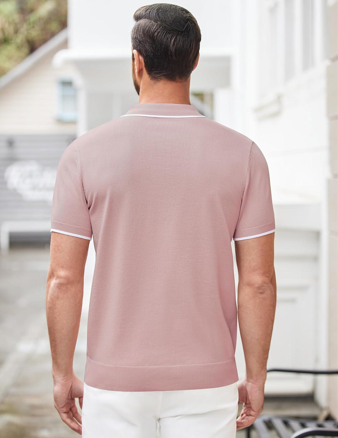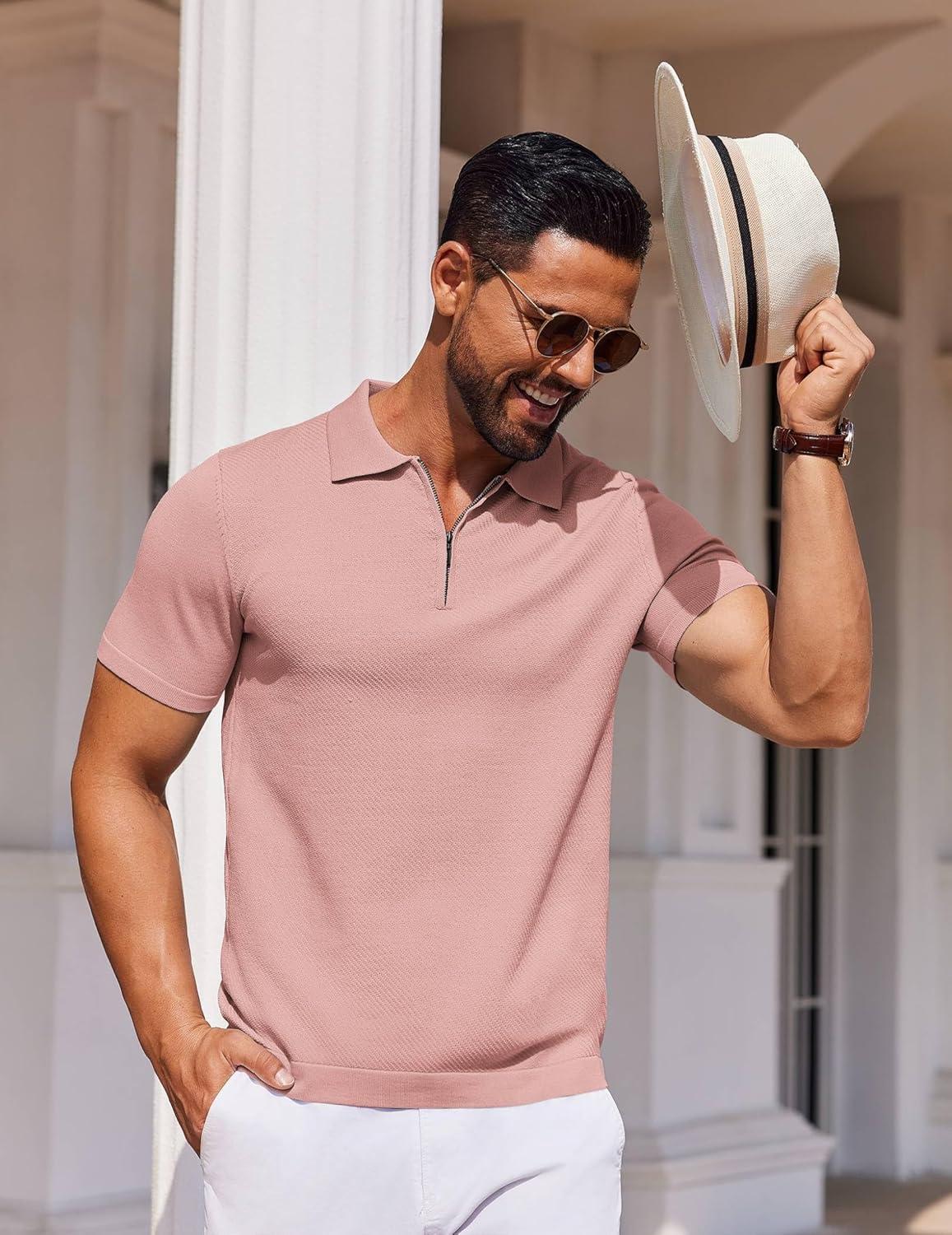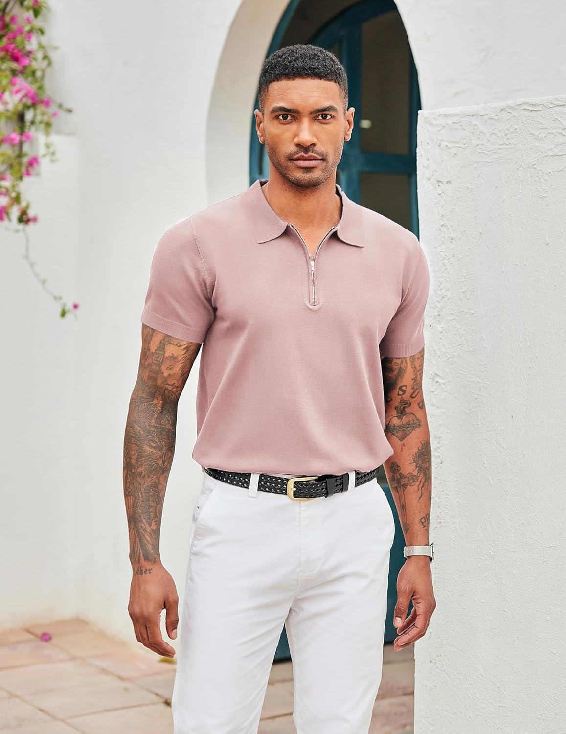 COOFANDY Men’s Zipper Polo Shirt Casual Knit Short Sleeve Polo T Shirt Classic Fit Shirts(Pink)