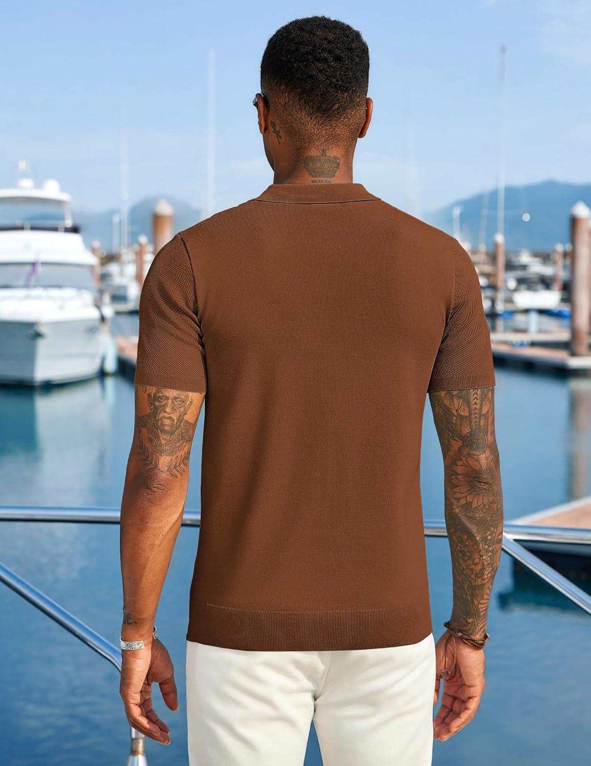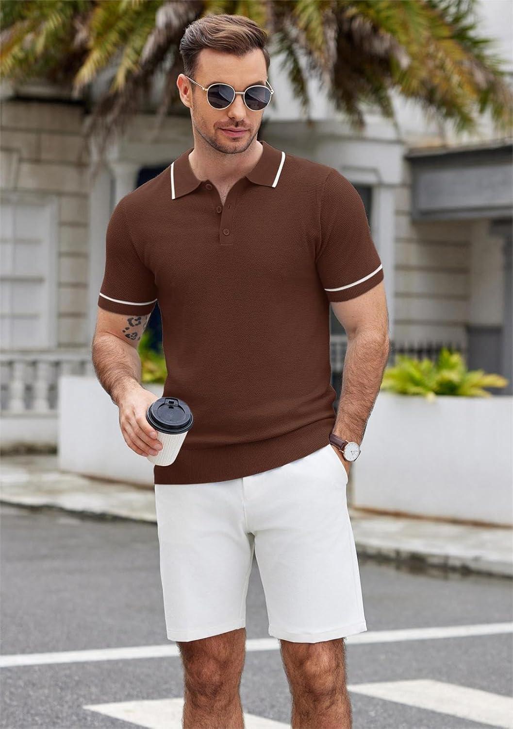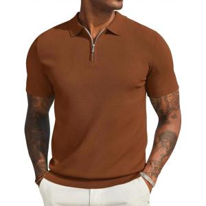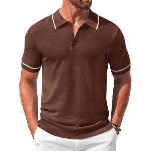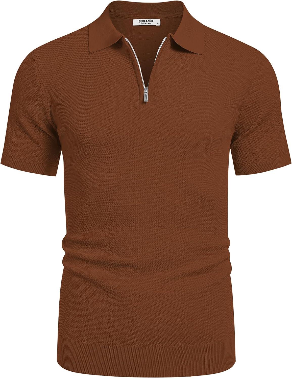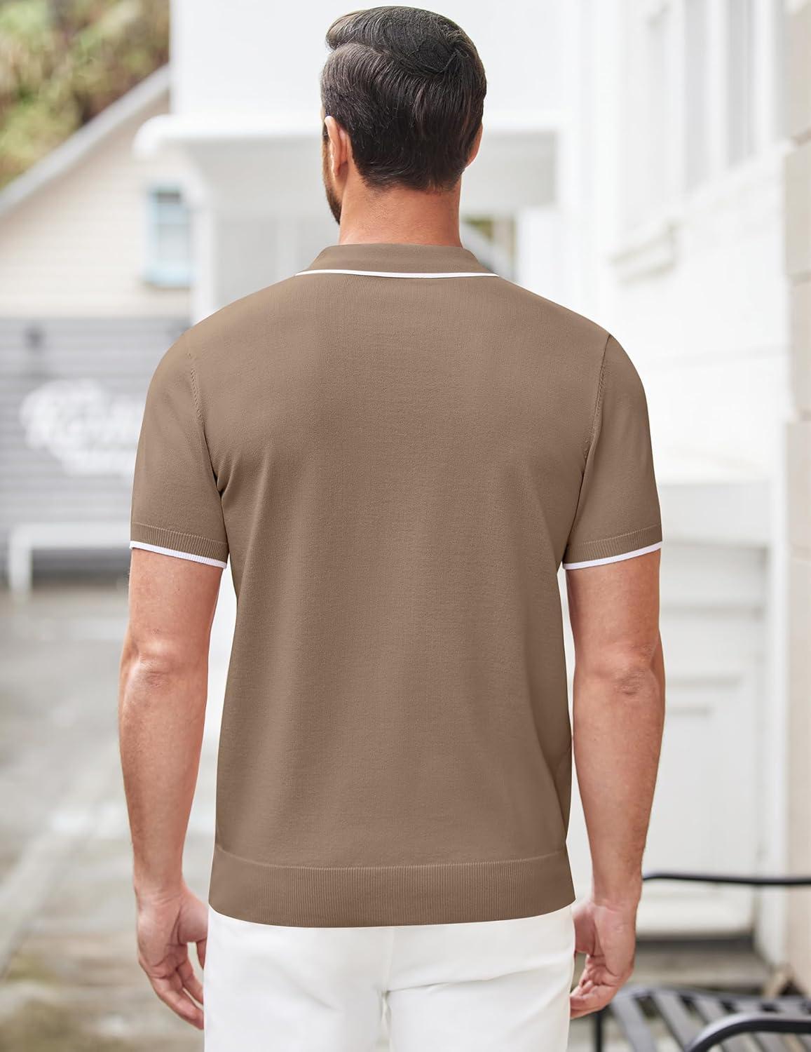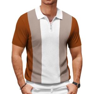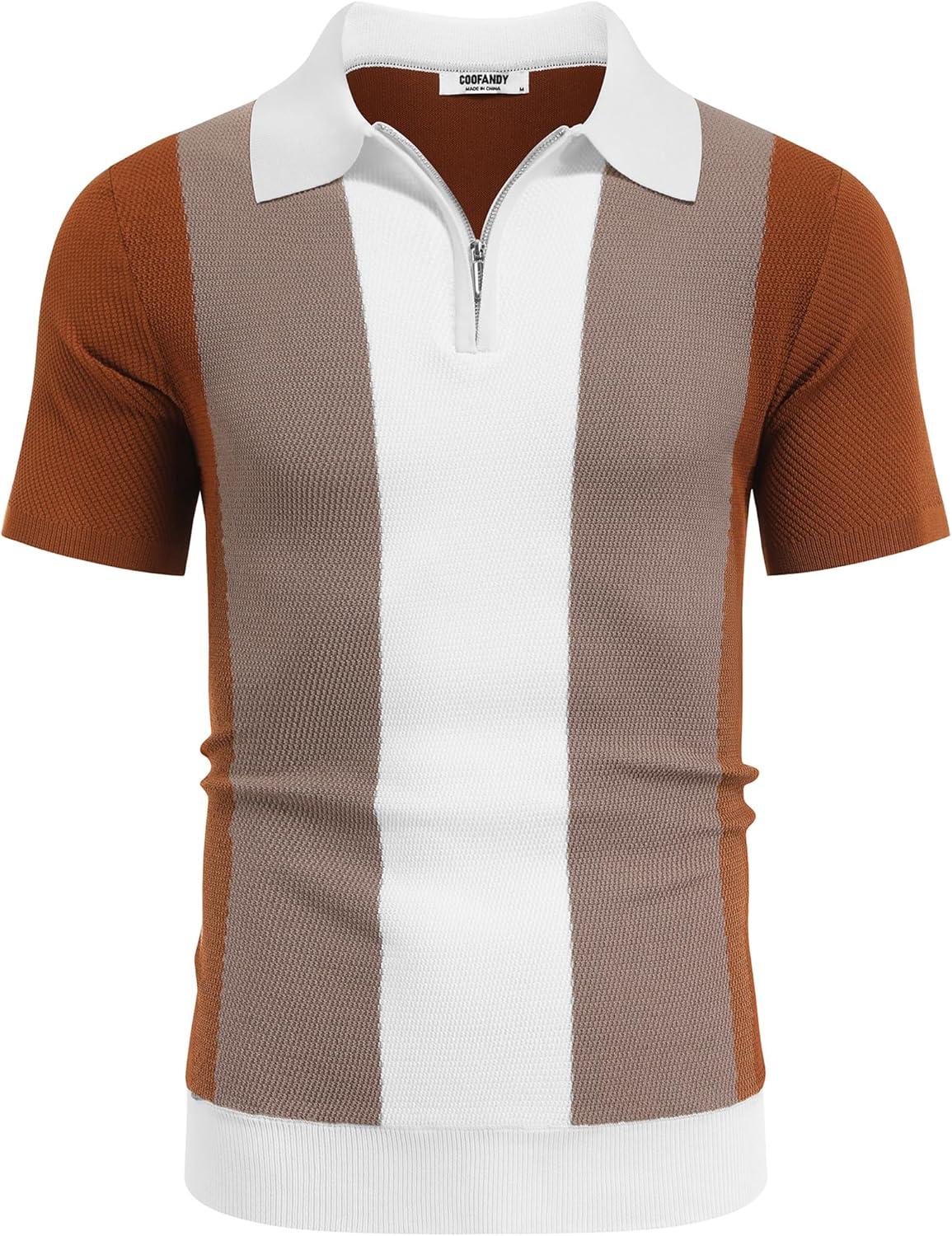 COOFANDY Men’s Zipper Polo Shirt Casual Knit Short Sleeve Polo T Shirt Classic Fit Shirts(Stripes – Brown & White)