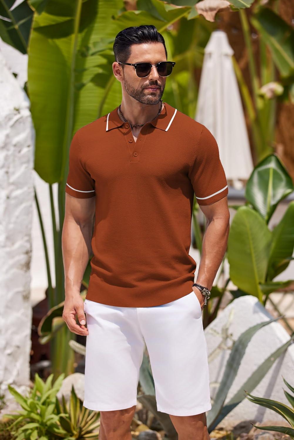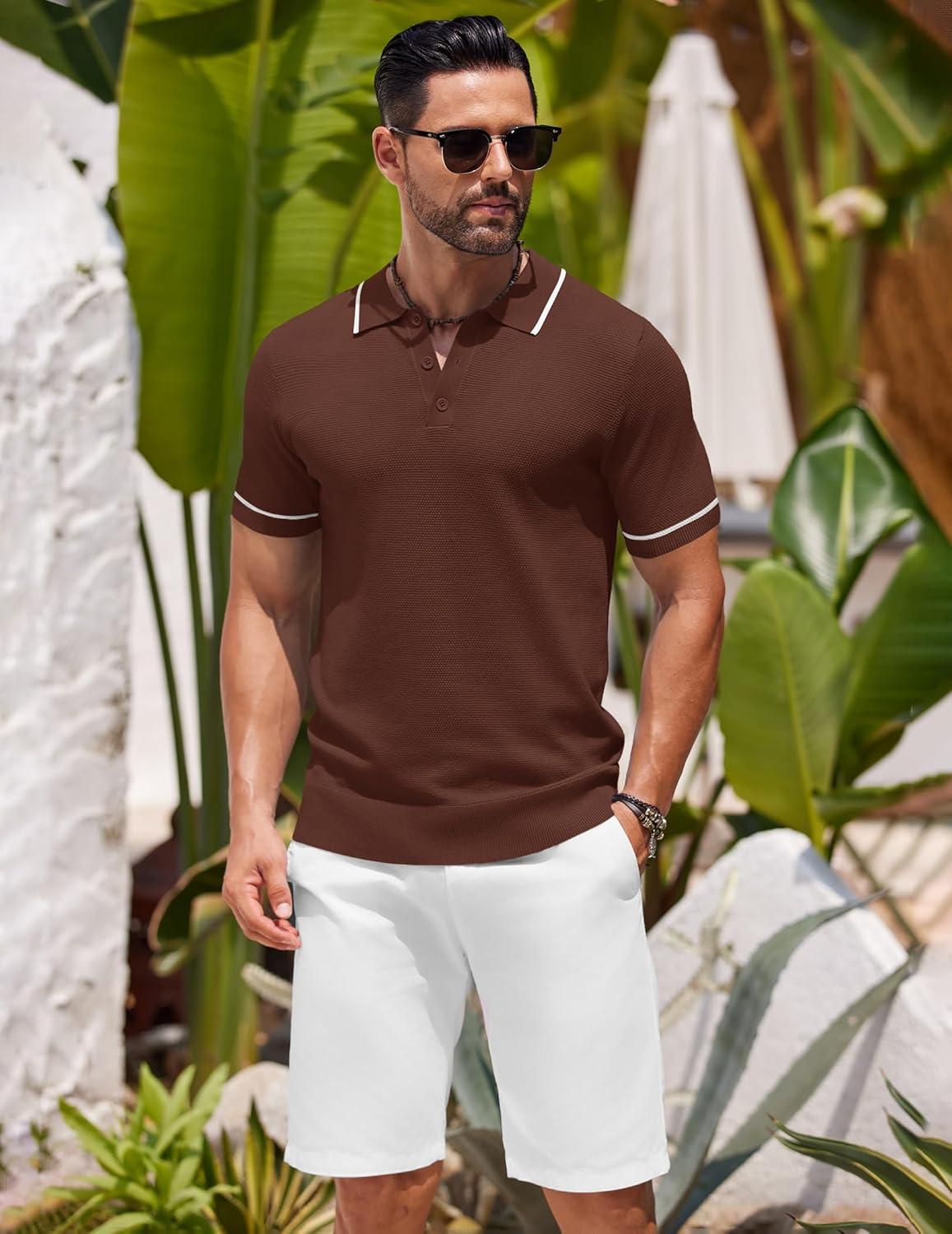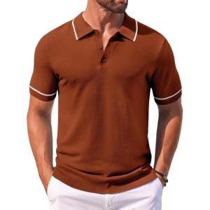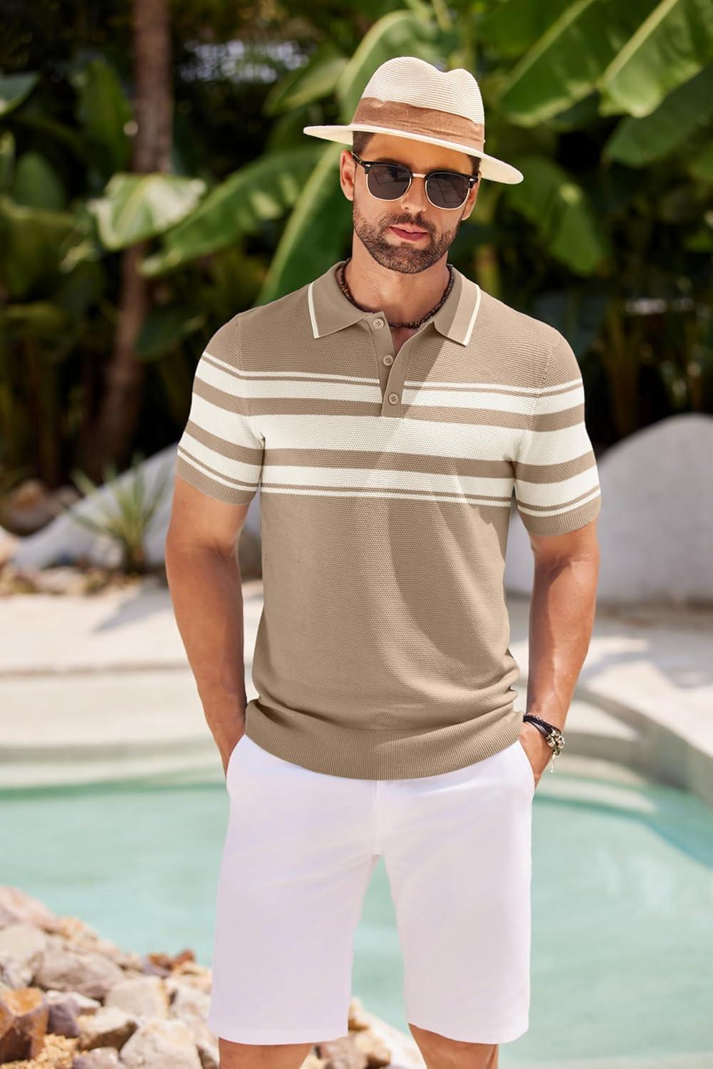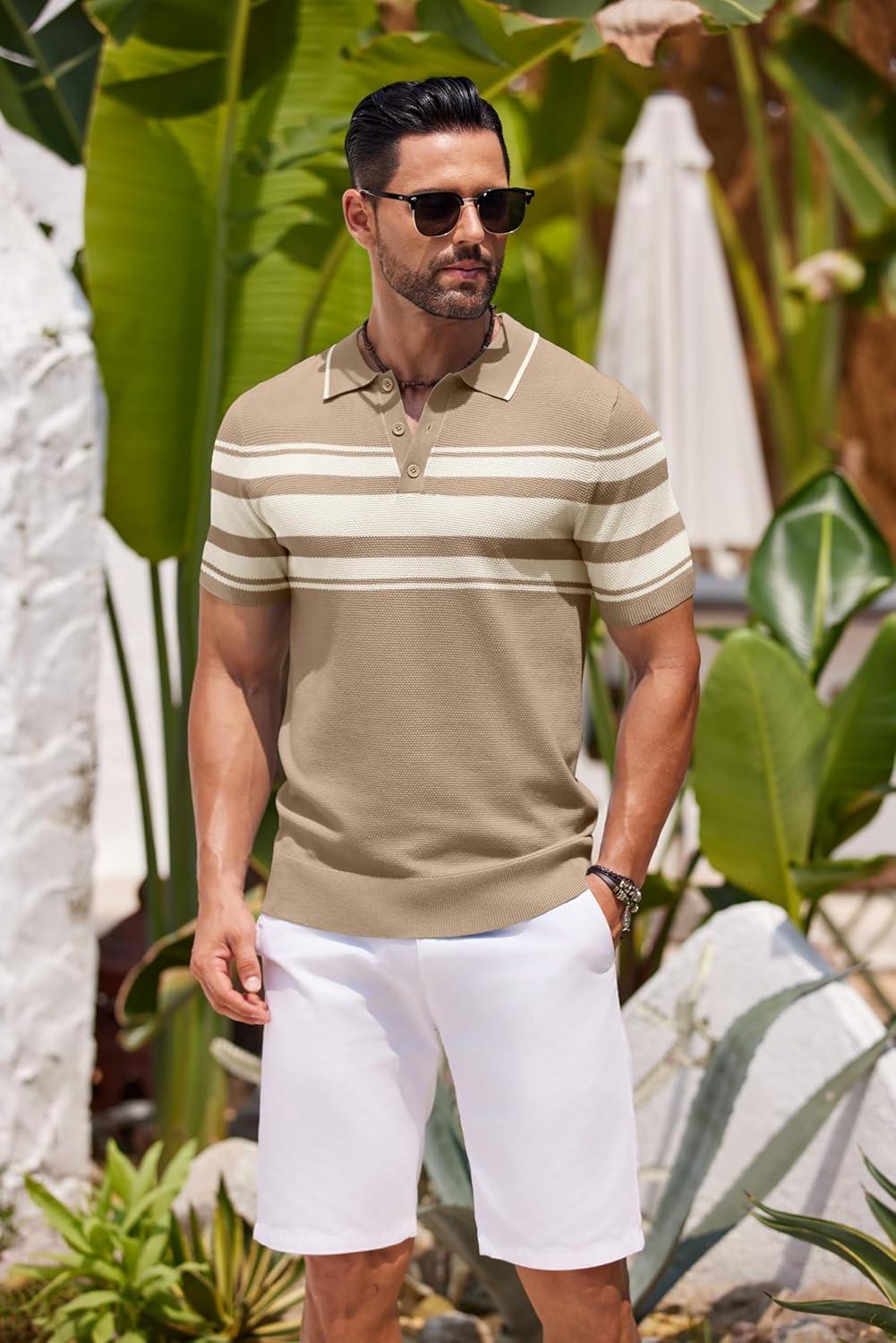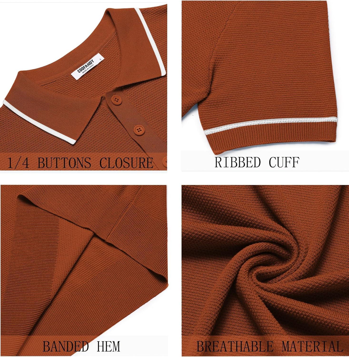 COOFANDY Men’s Zipper Polo Shirt Casual Knit Short Sleeve Polo T Shirt Classic Fit Shirts(Stripes – Brown & White)