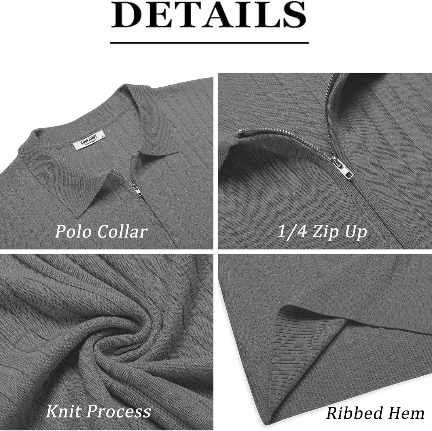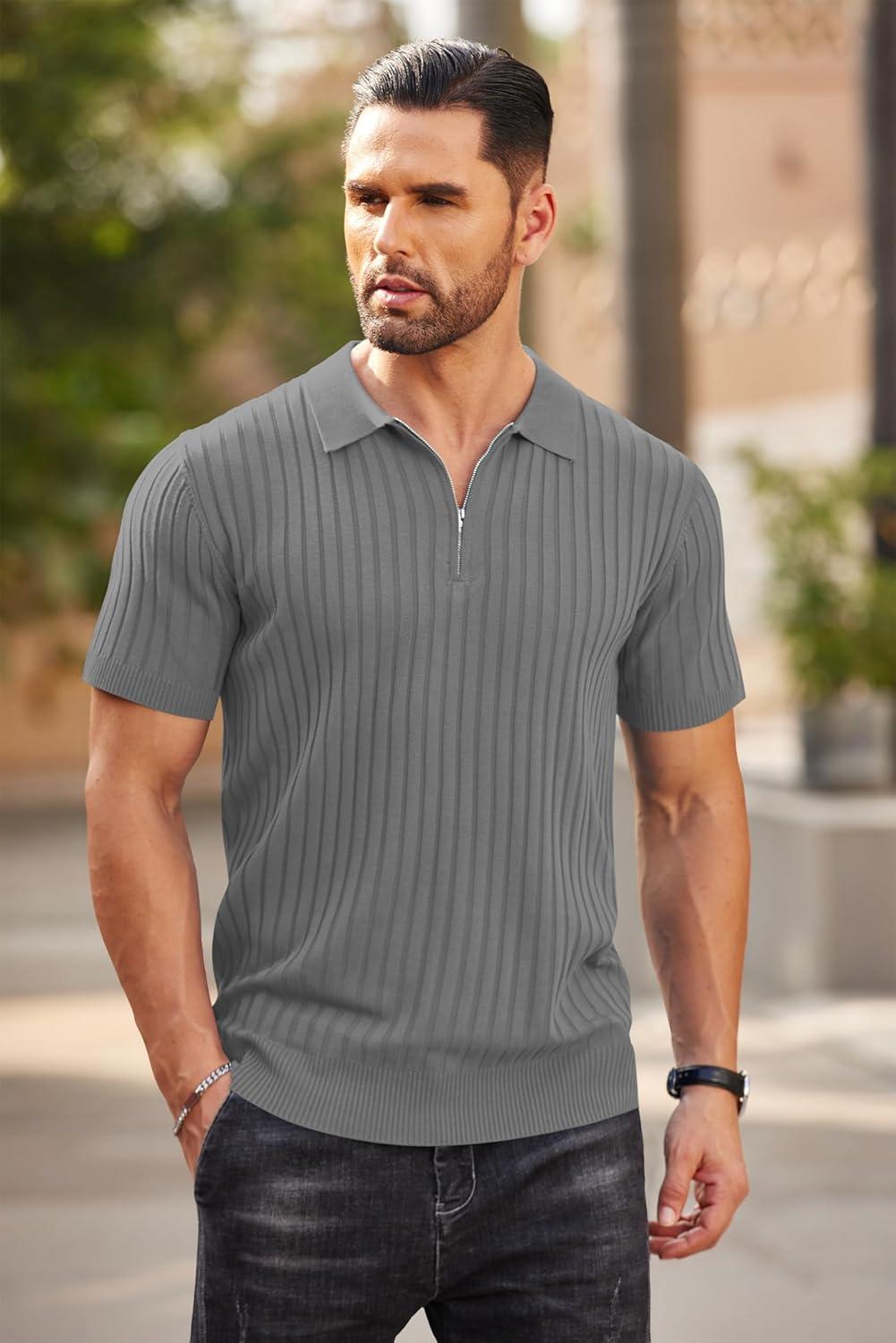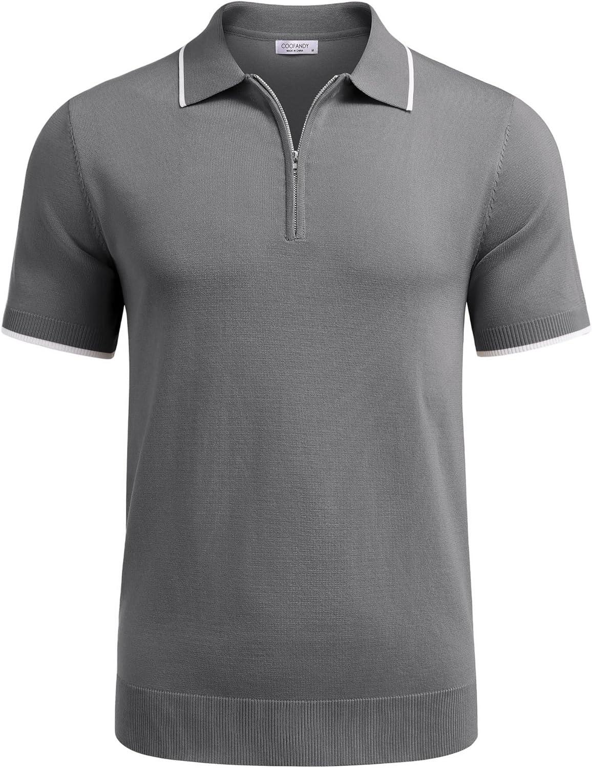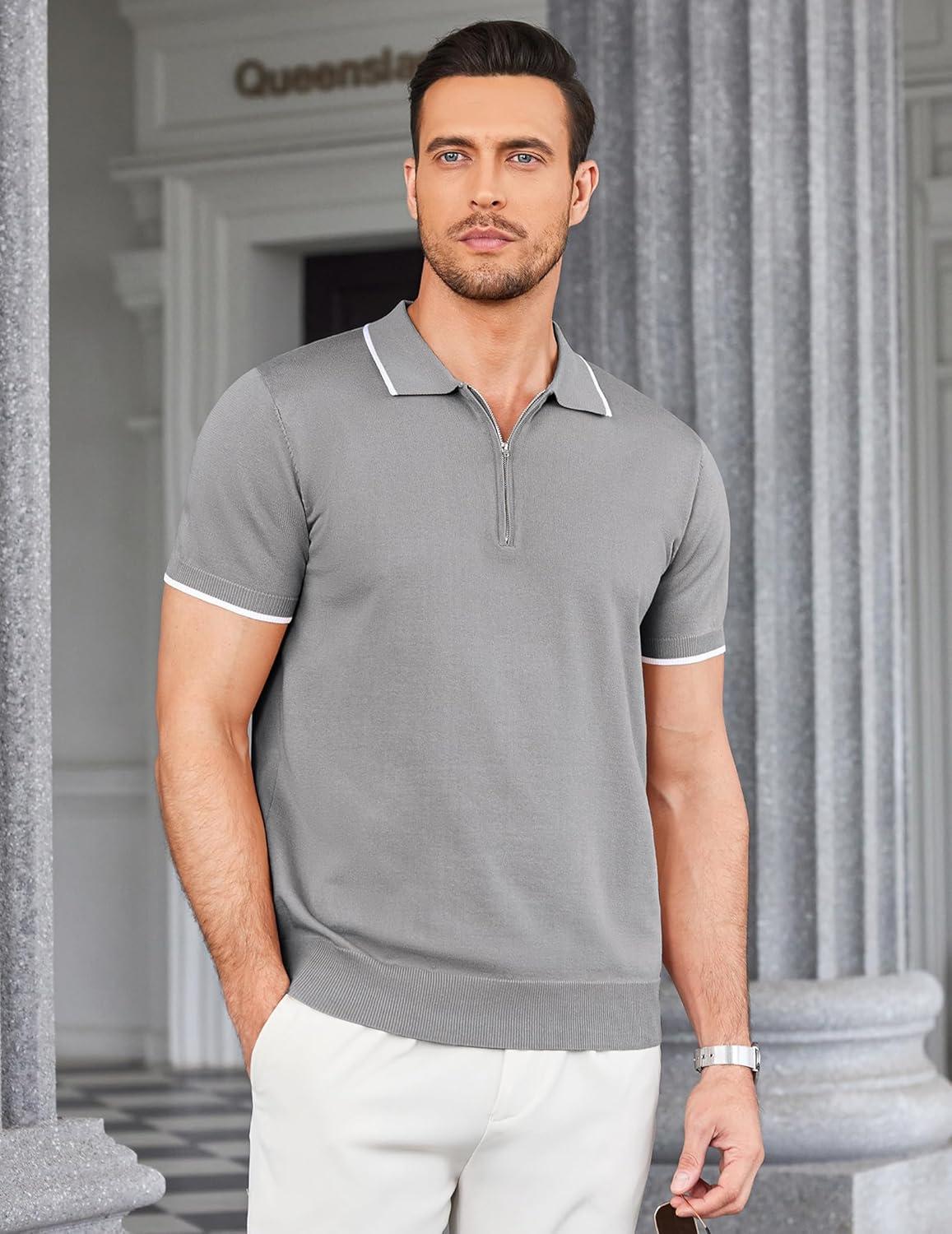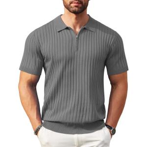 COOFANDY Men’s Zipper Polo Shirts Short Sleeve Ribbed Knit Polo T Shirts Fashion Casual Golf Shirts(Grey)