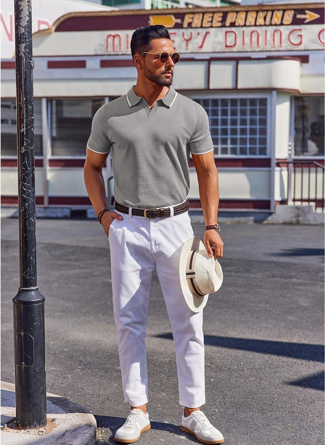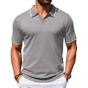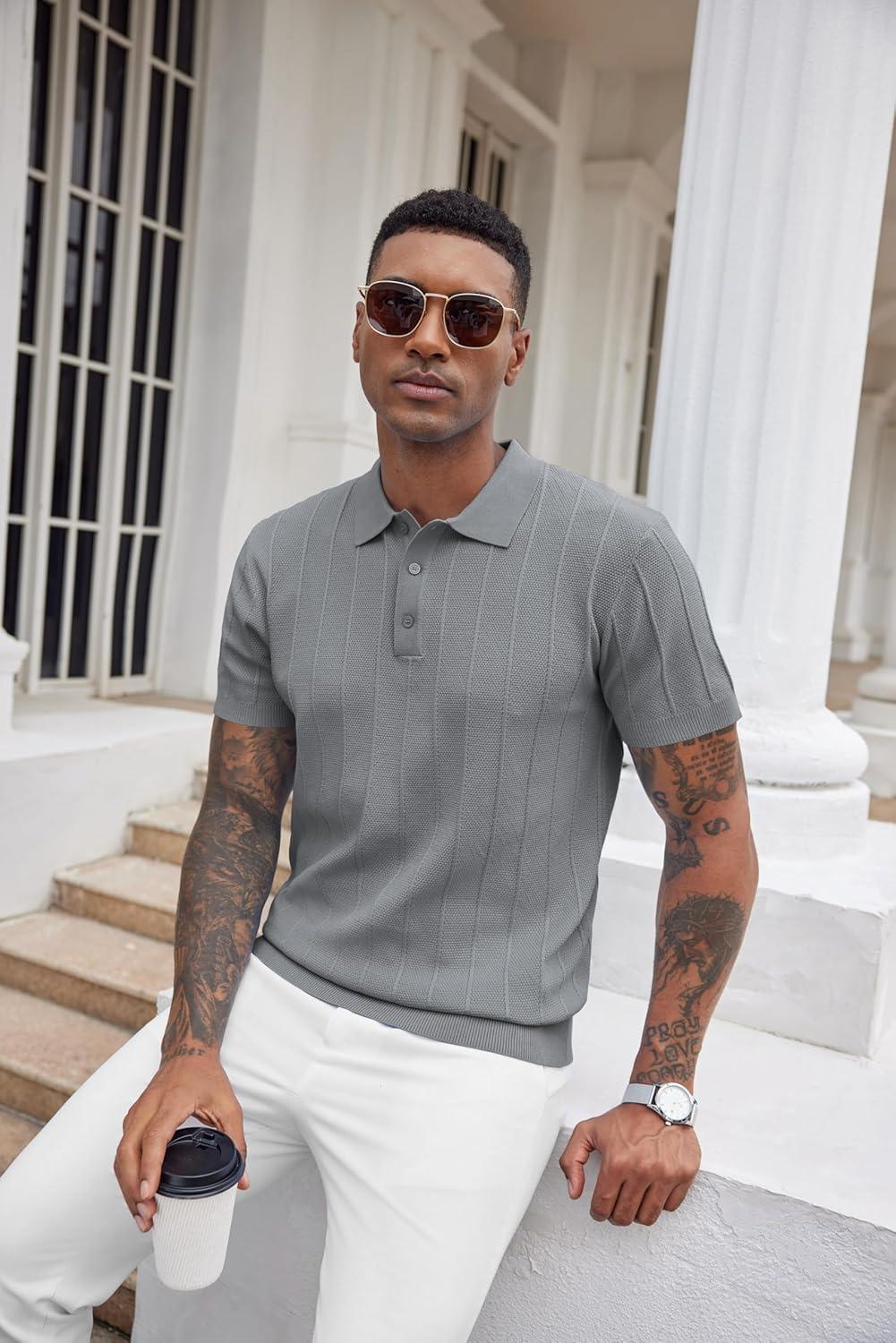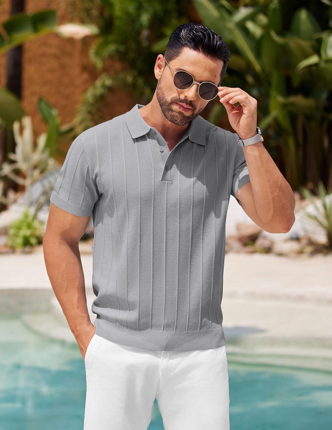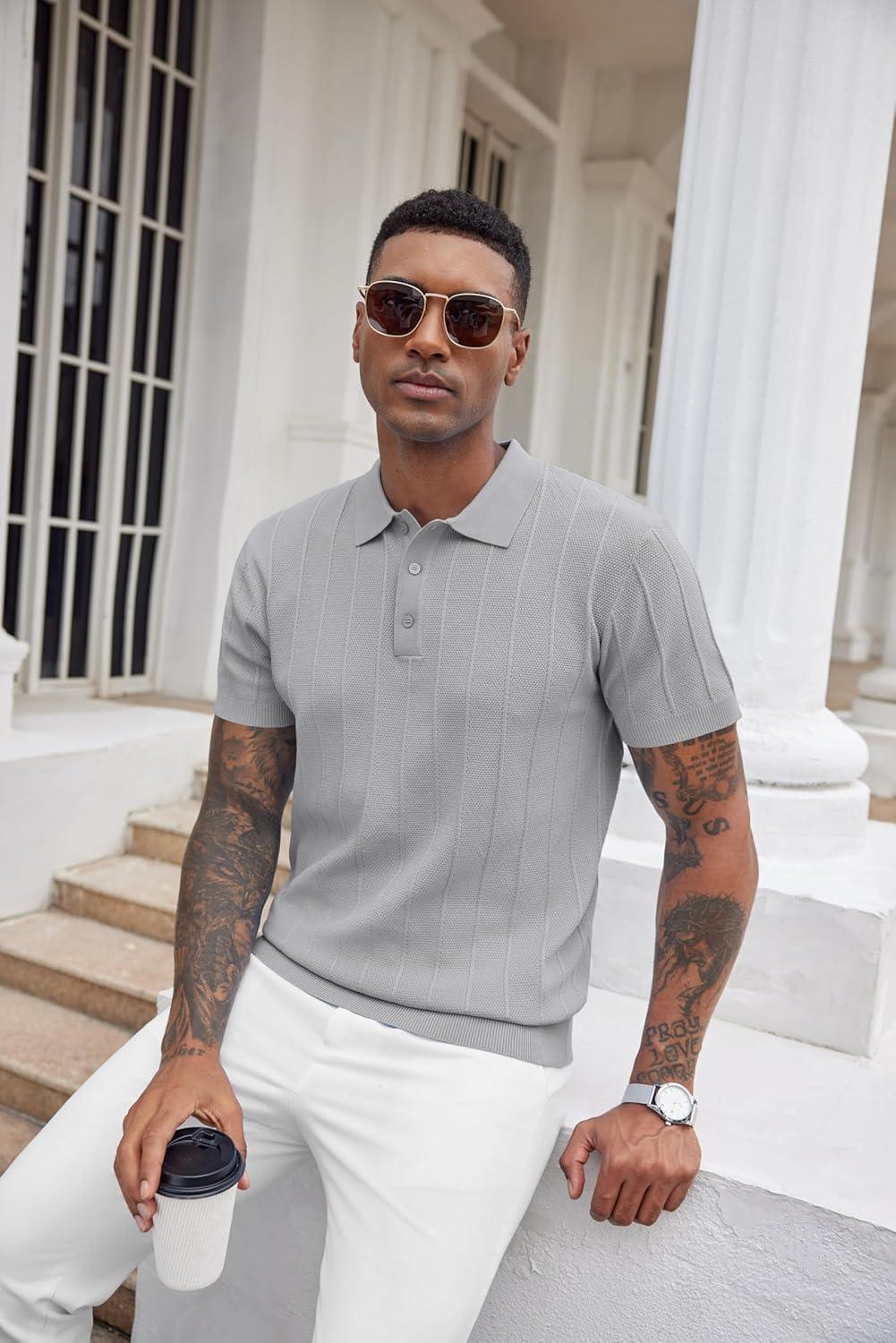 COOFANDY Men’s Zipper Polo Shirts Short Sleeve Ribbed Knit Polo T Shirts Fashion Casual Golf Shirts(Grey)