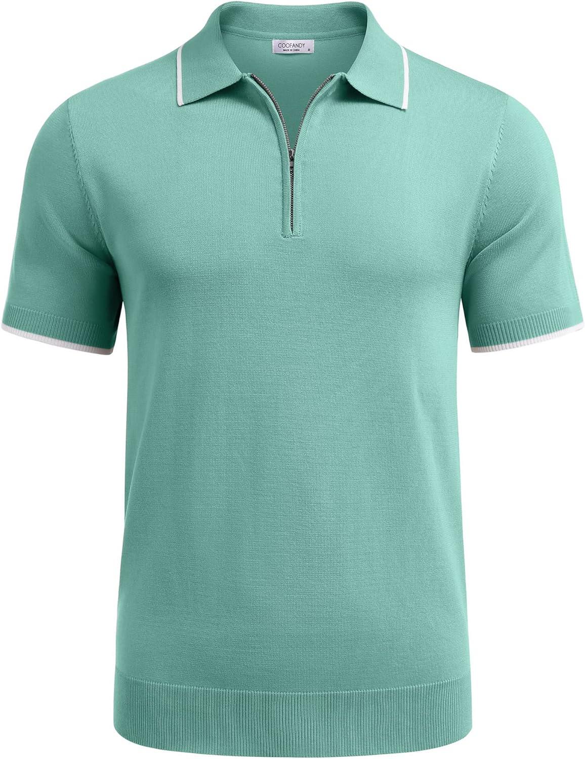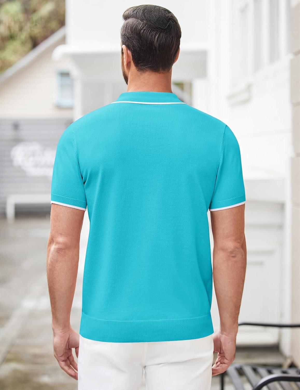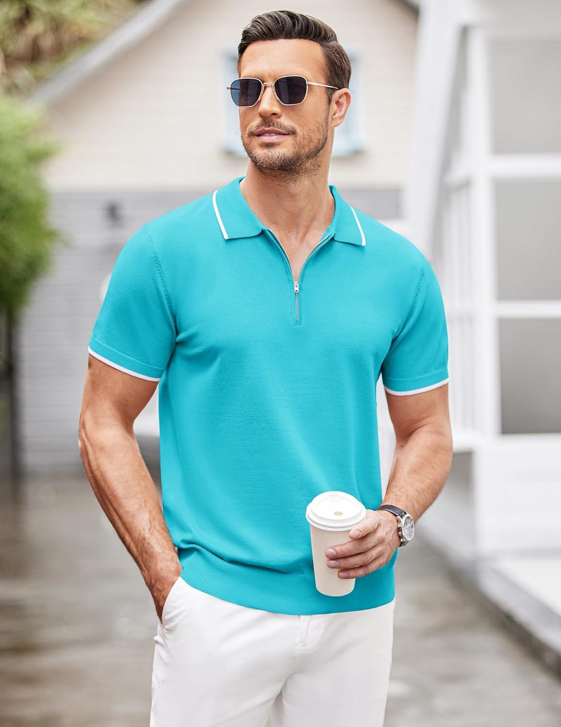 COOFANDY Men’s Zipper Polo Shirt Casual Knit Short Sleeve Polo T Shirt Classic Fit Shirts(Turquoise)