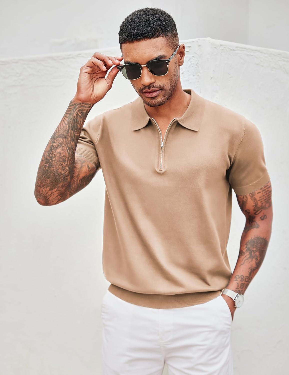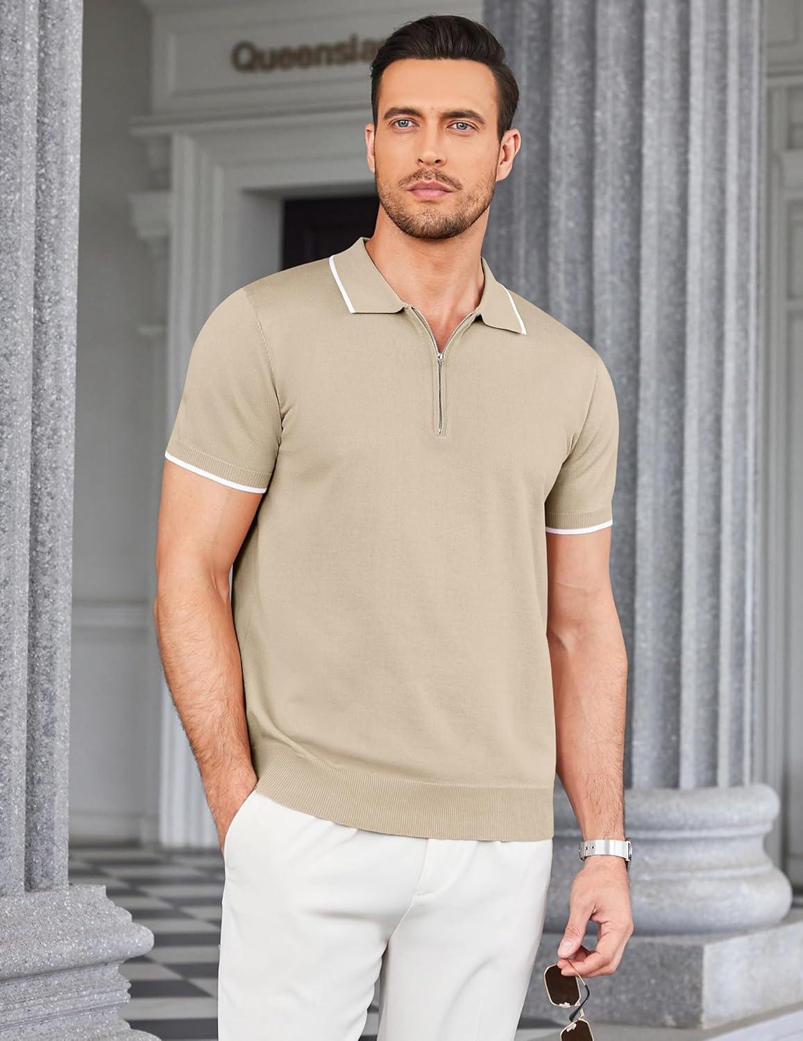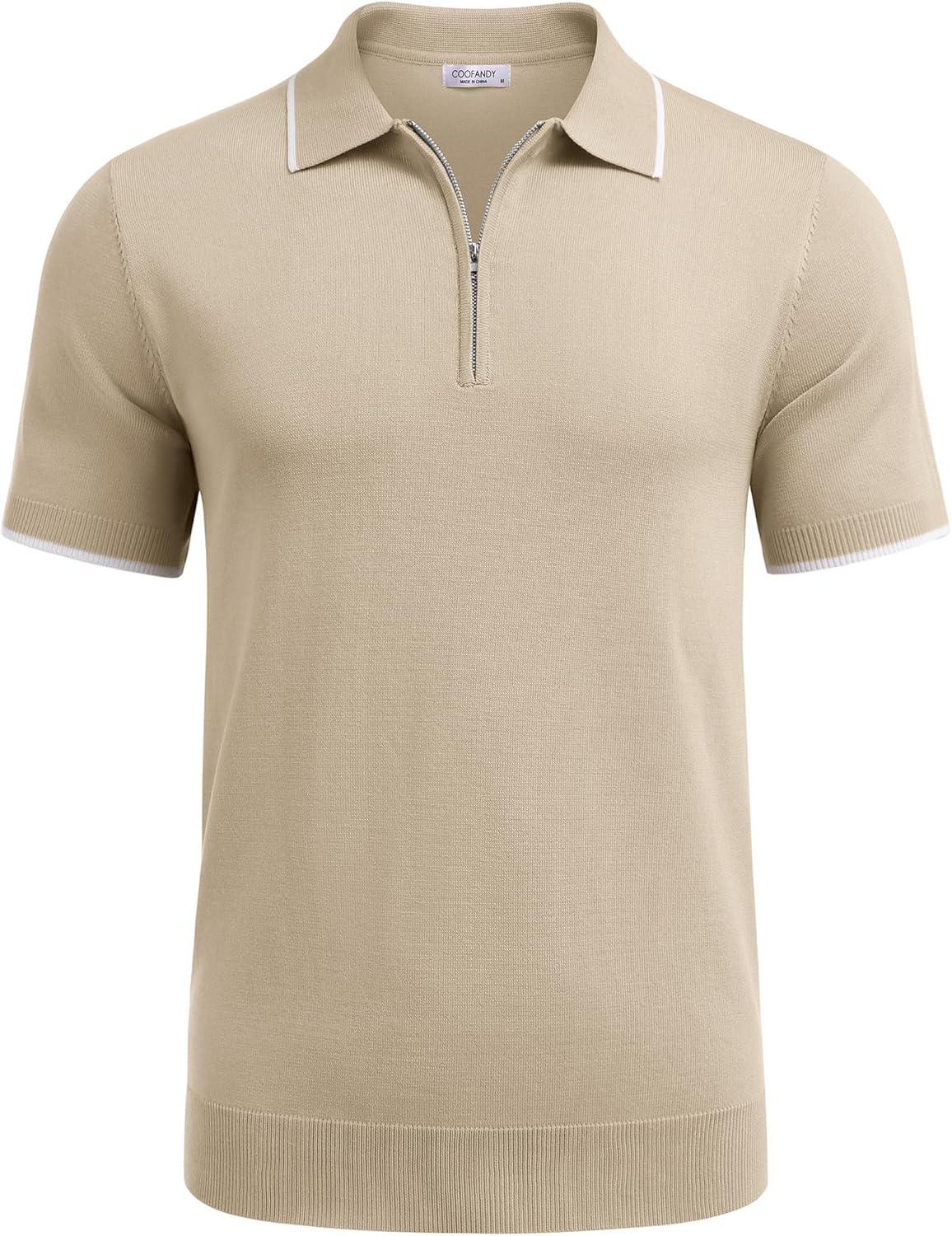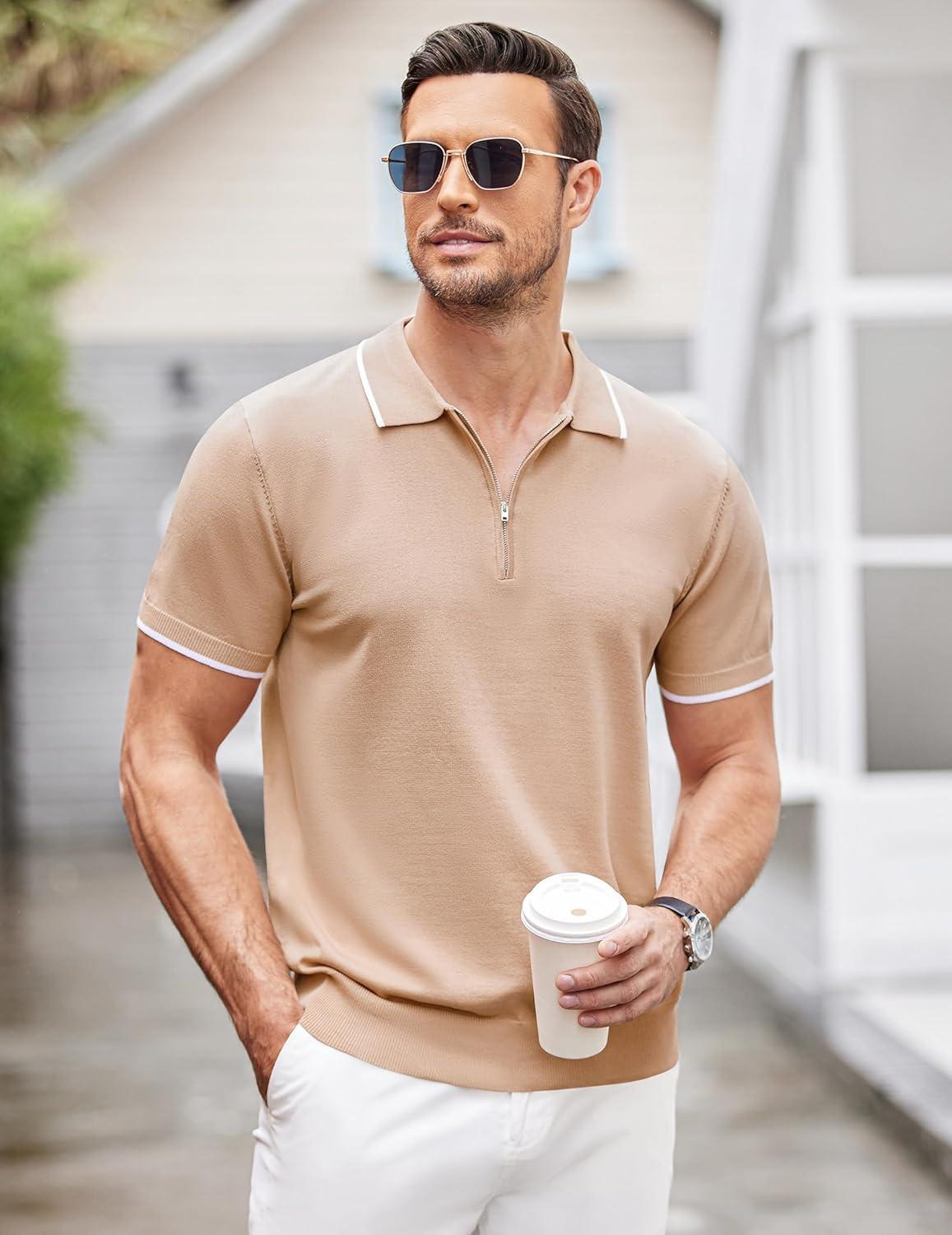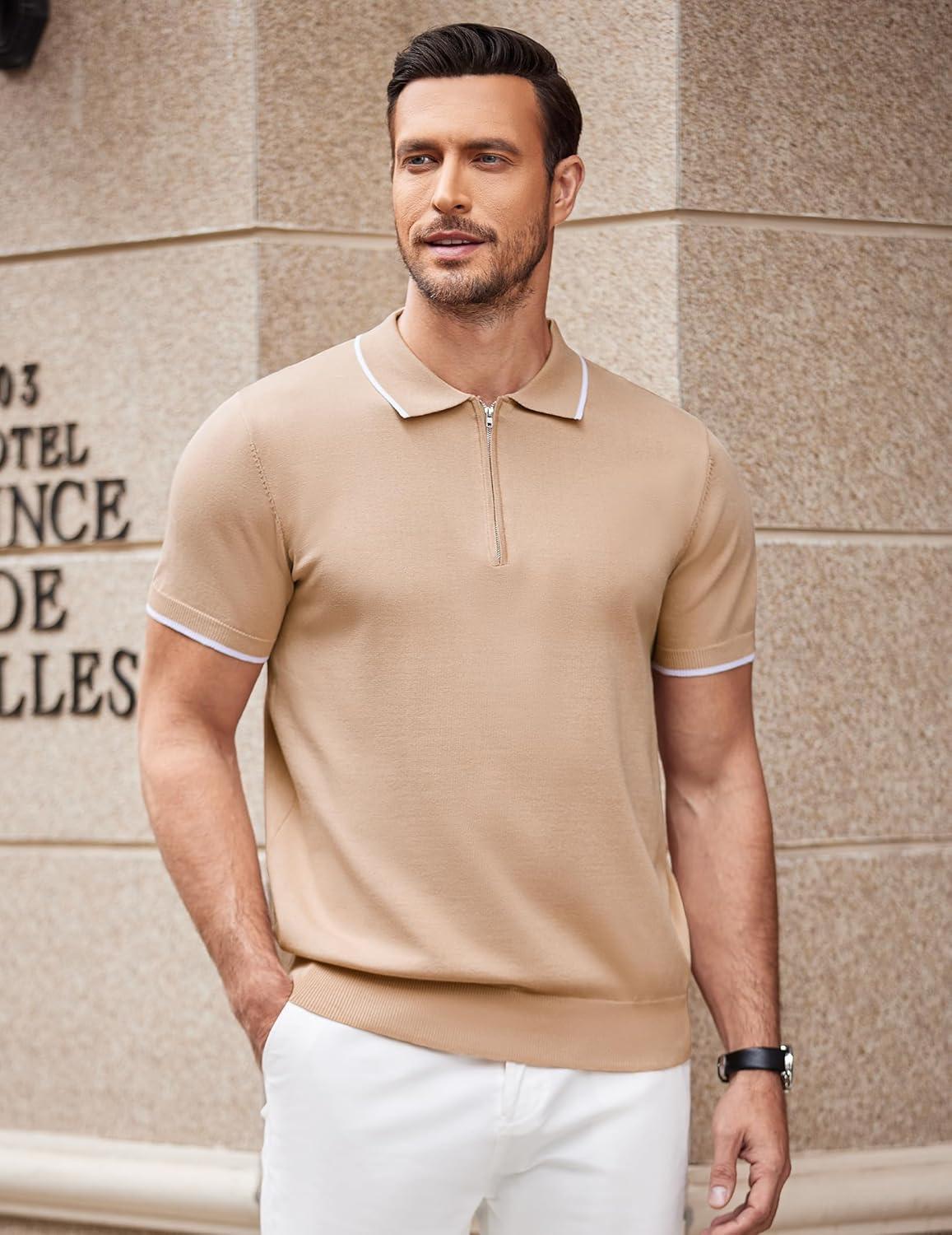 COOFANDY Men’s Zipper Polo Shirt Casual Knit Short Sleeve Polo T Shirt Classic Fit Shirts(Solid- Light Tan)