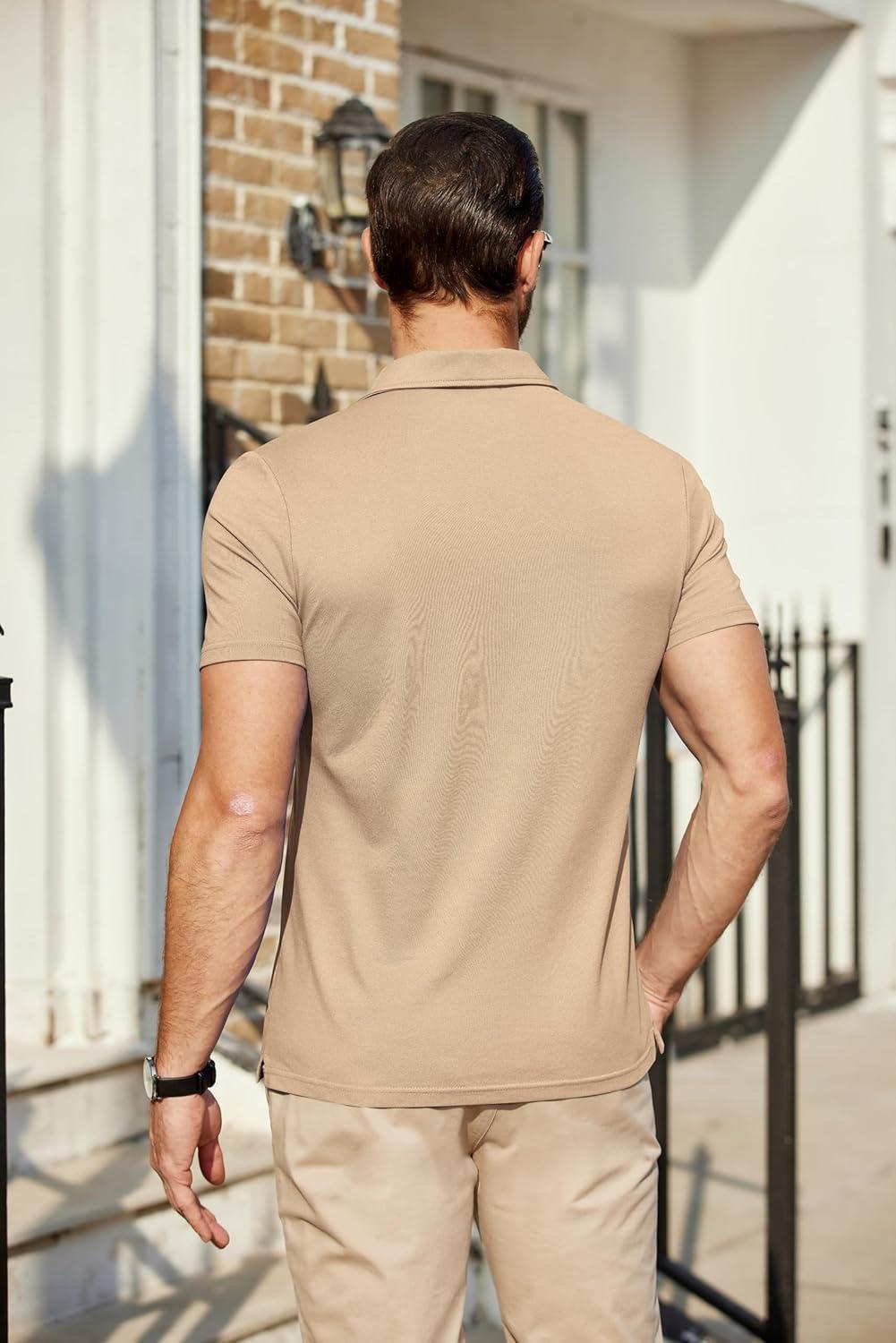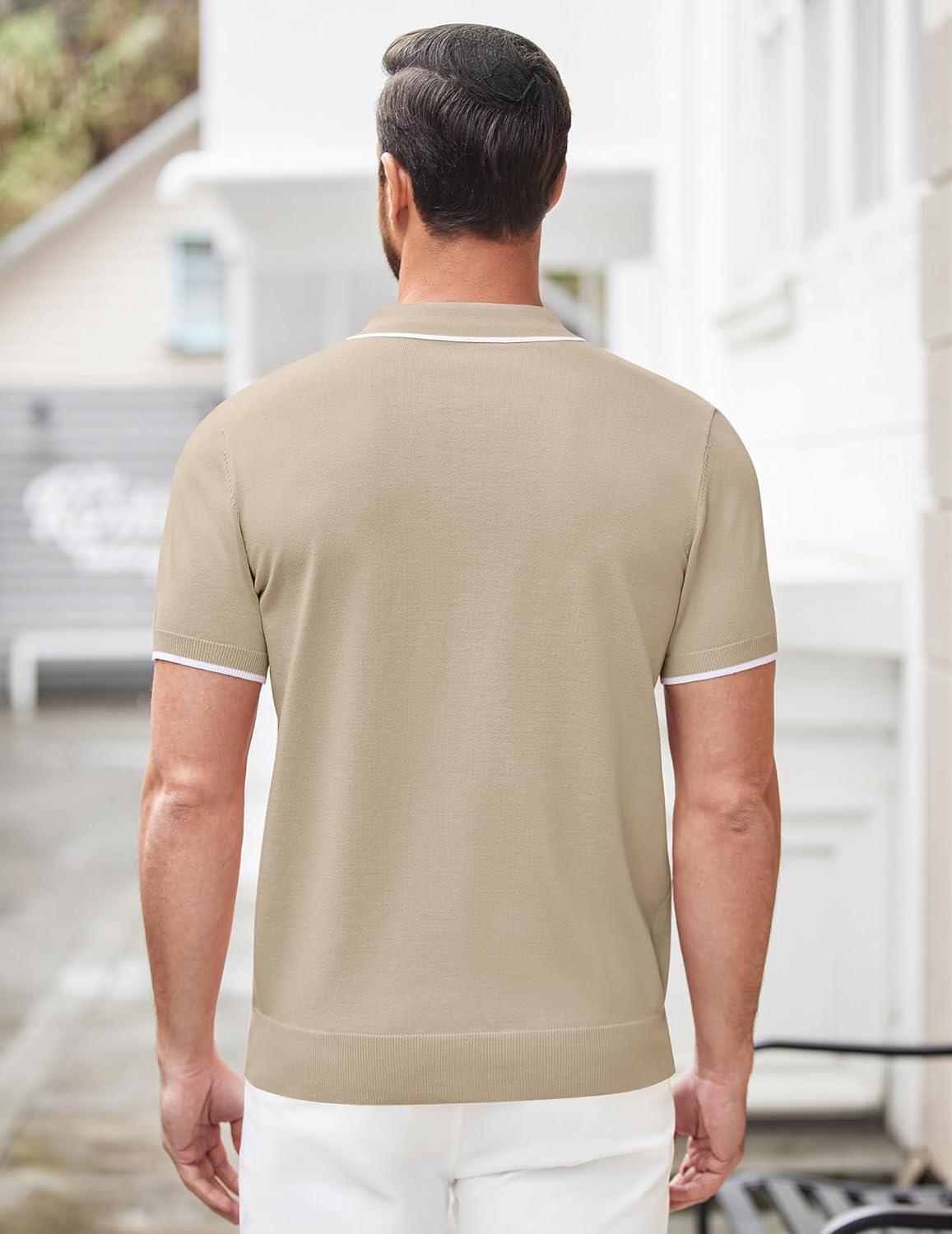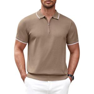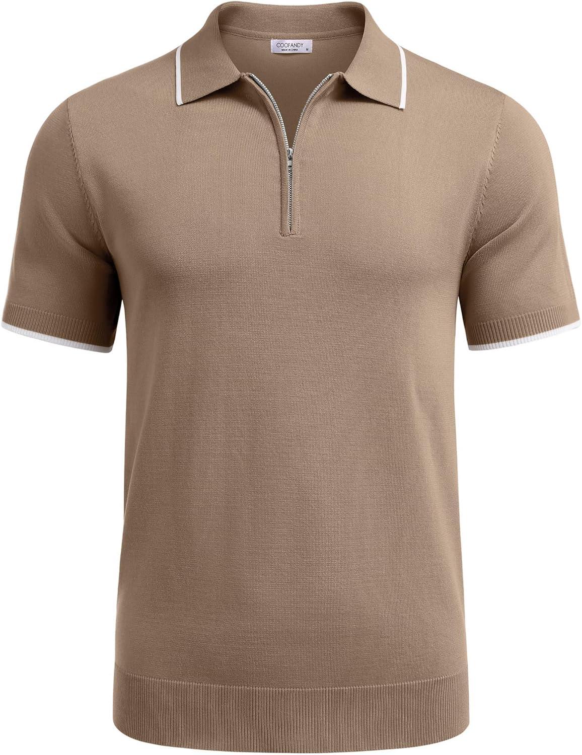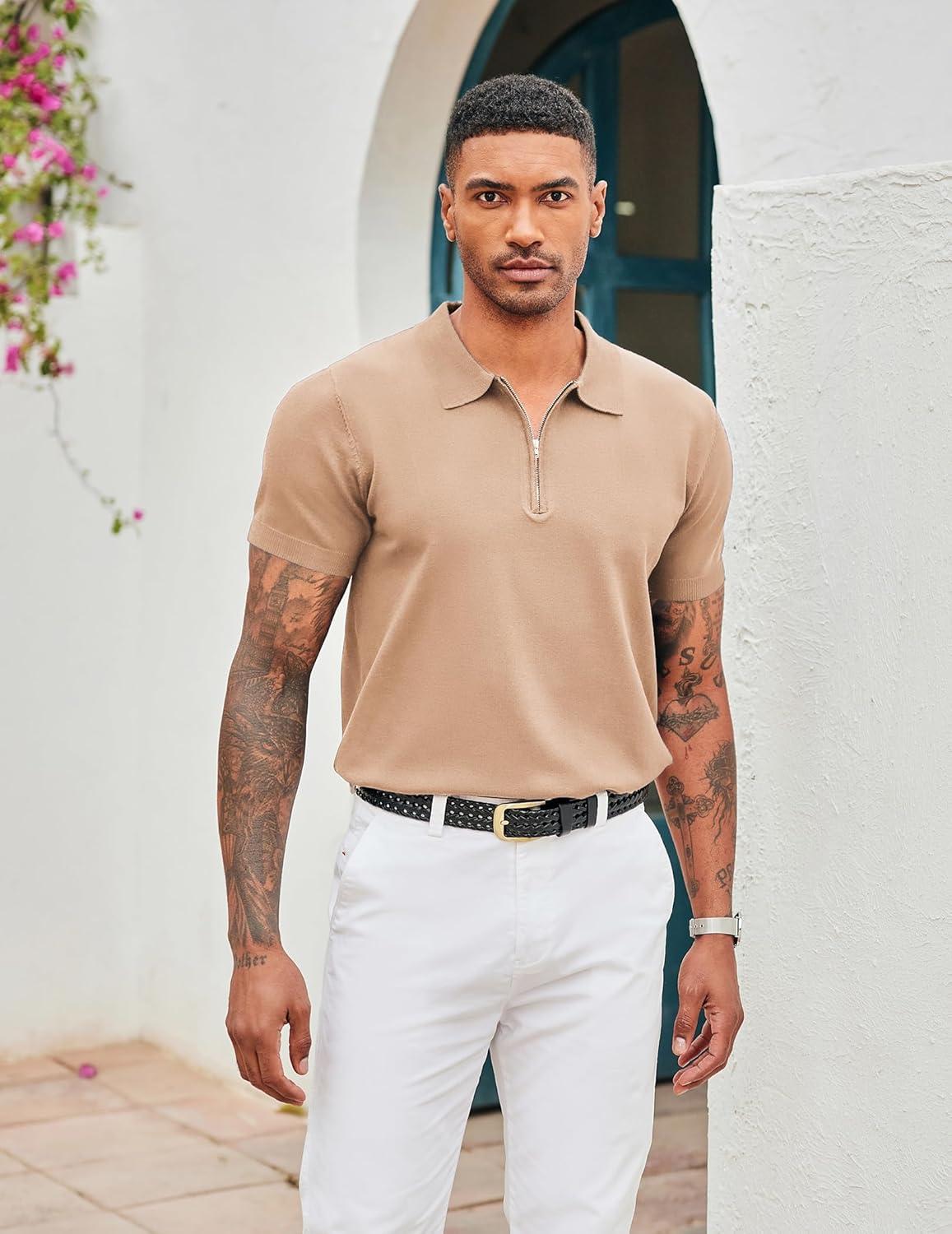 COOFANDY Men’s Zipper Polo Shirt Casual Knit Short Sleeve Polo T Shirt Classic Fit Shirts(Solid- Light Tan)
