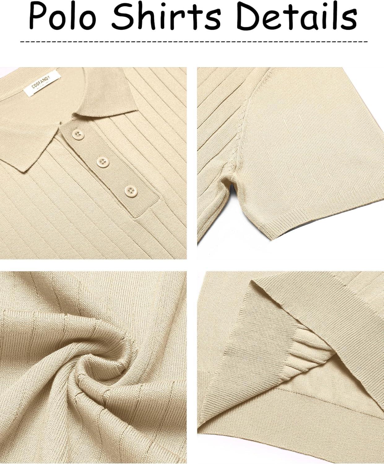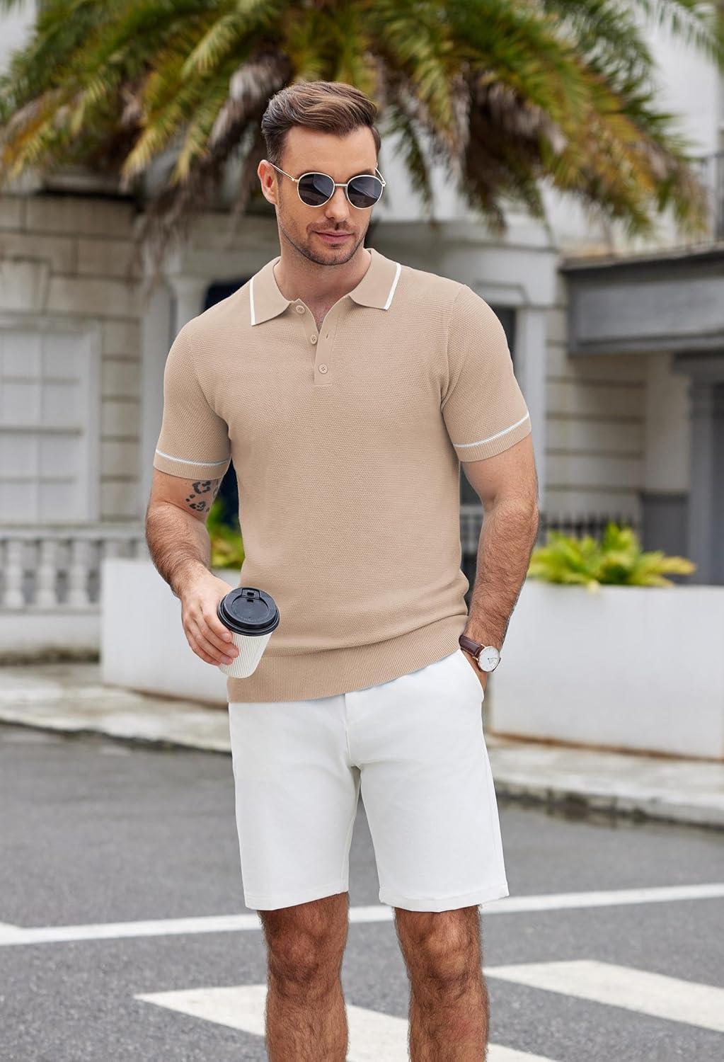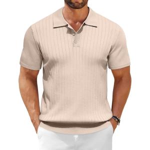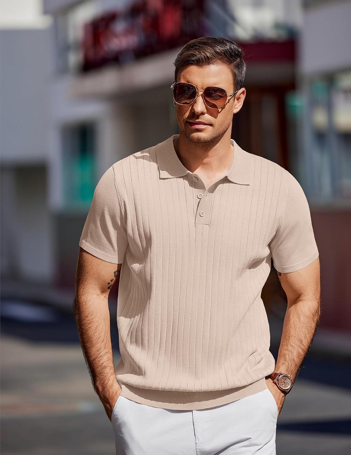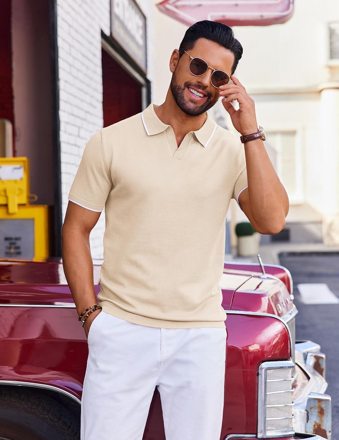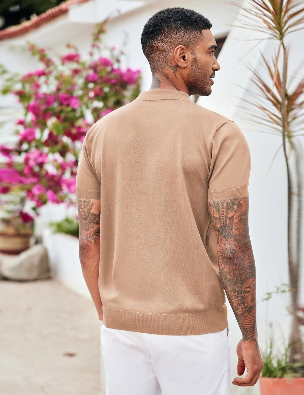 COOFANDY Men’s Zipper Polo Shirt Casual Knit Short Sleeve Polo T Shirt Classic Fit Shirts(Solid- Light Tan)