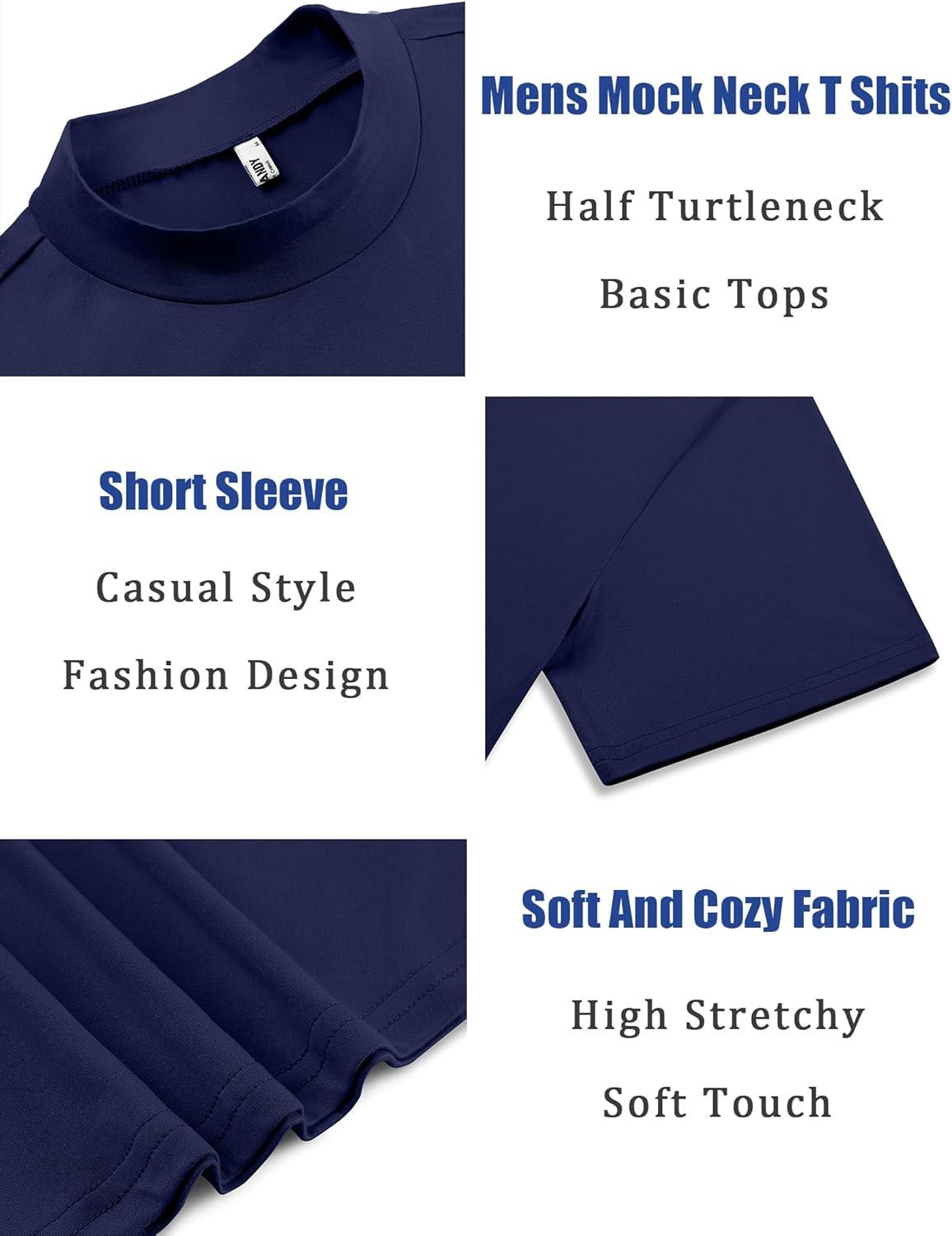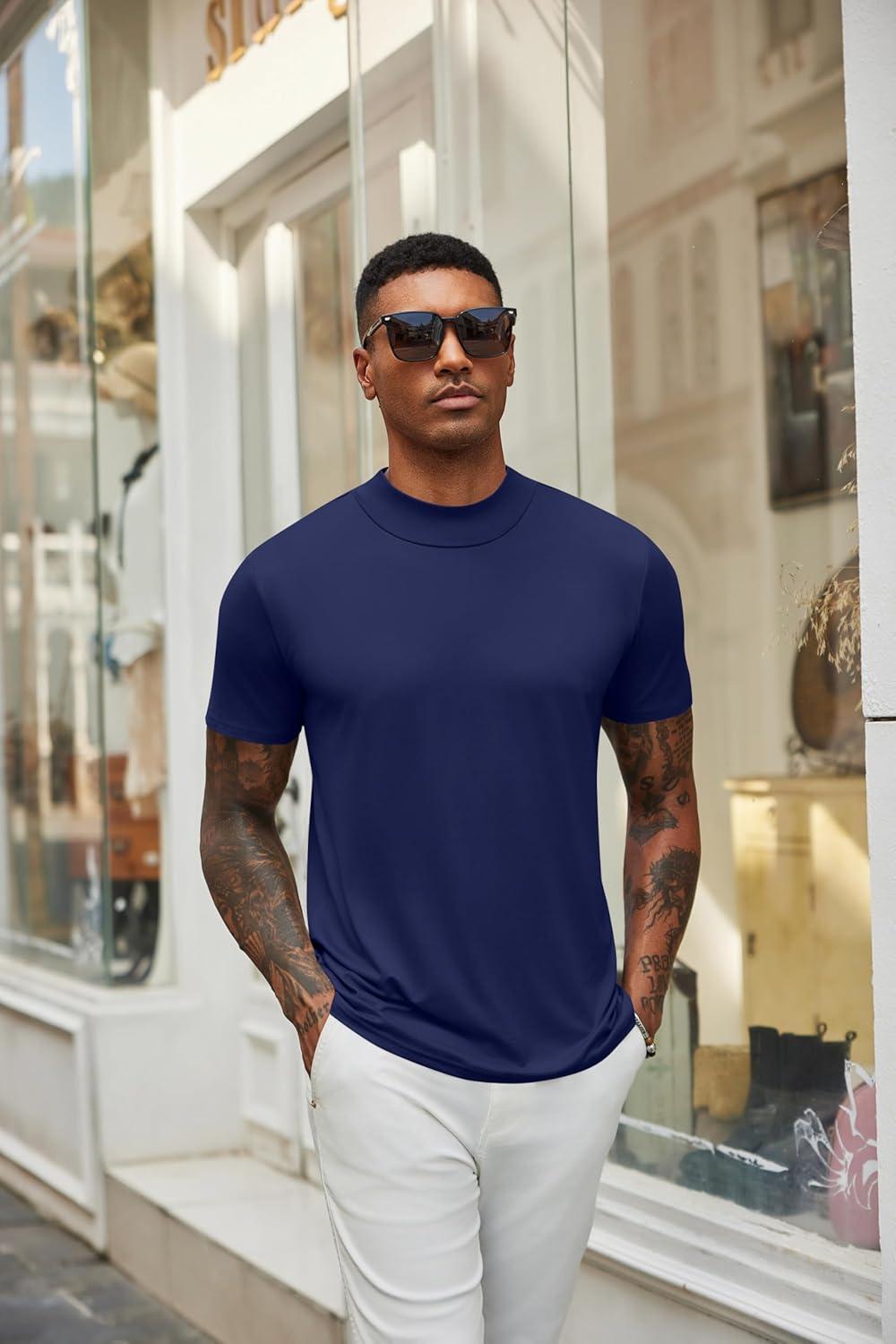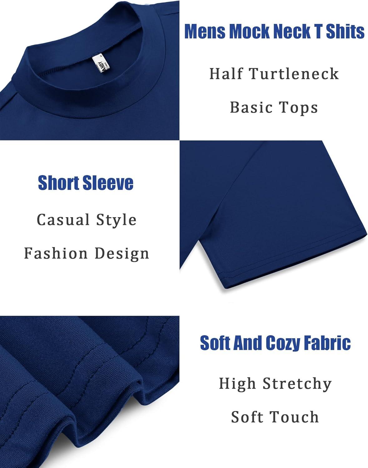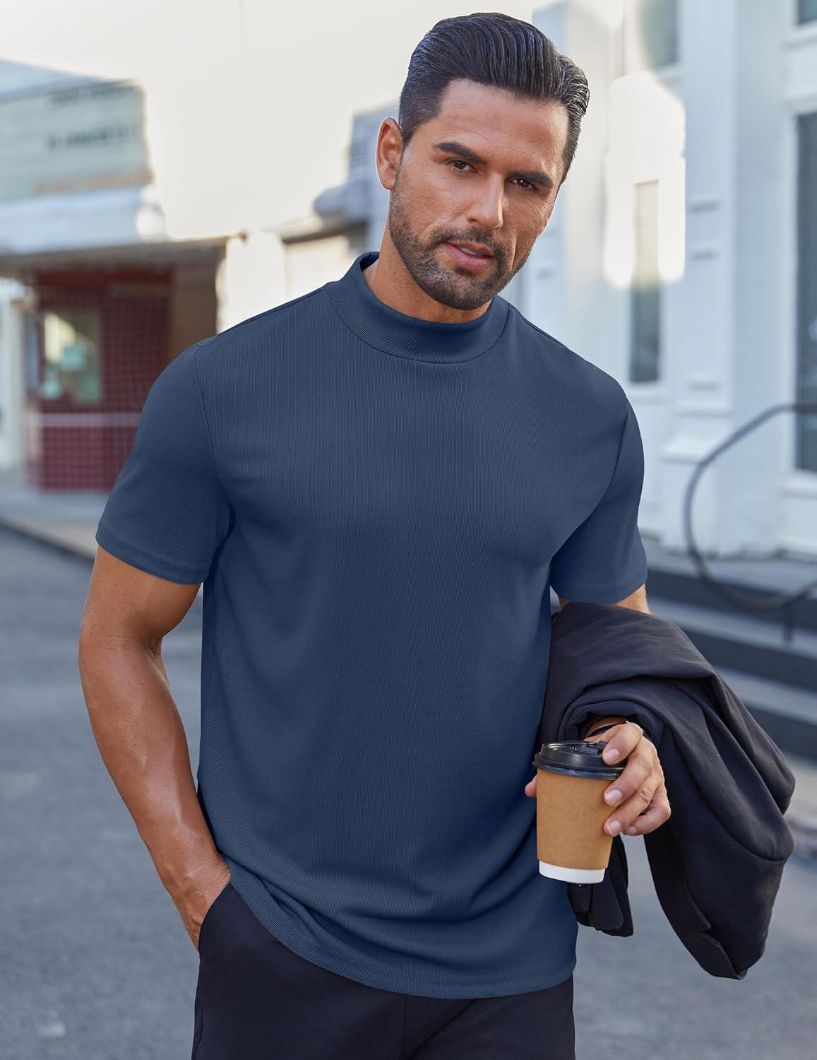 COOFANDY Mens Mock Turtleneck Shirts Short Sleeve Casual Basic T-Shirts Ribbed Solid Pullover Tops(A-navy Blue)