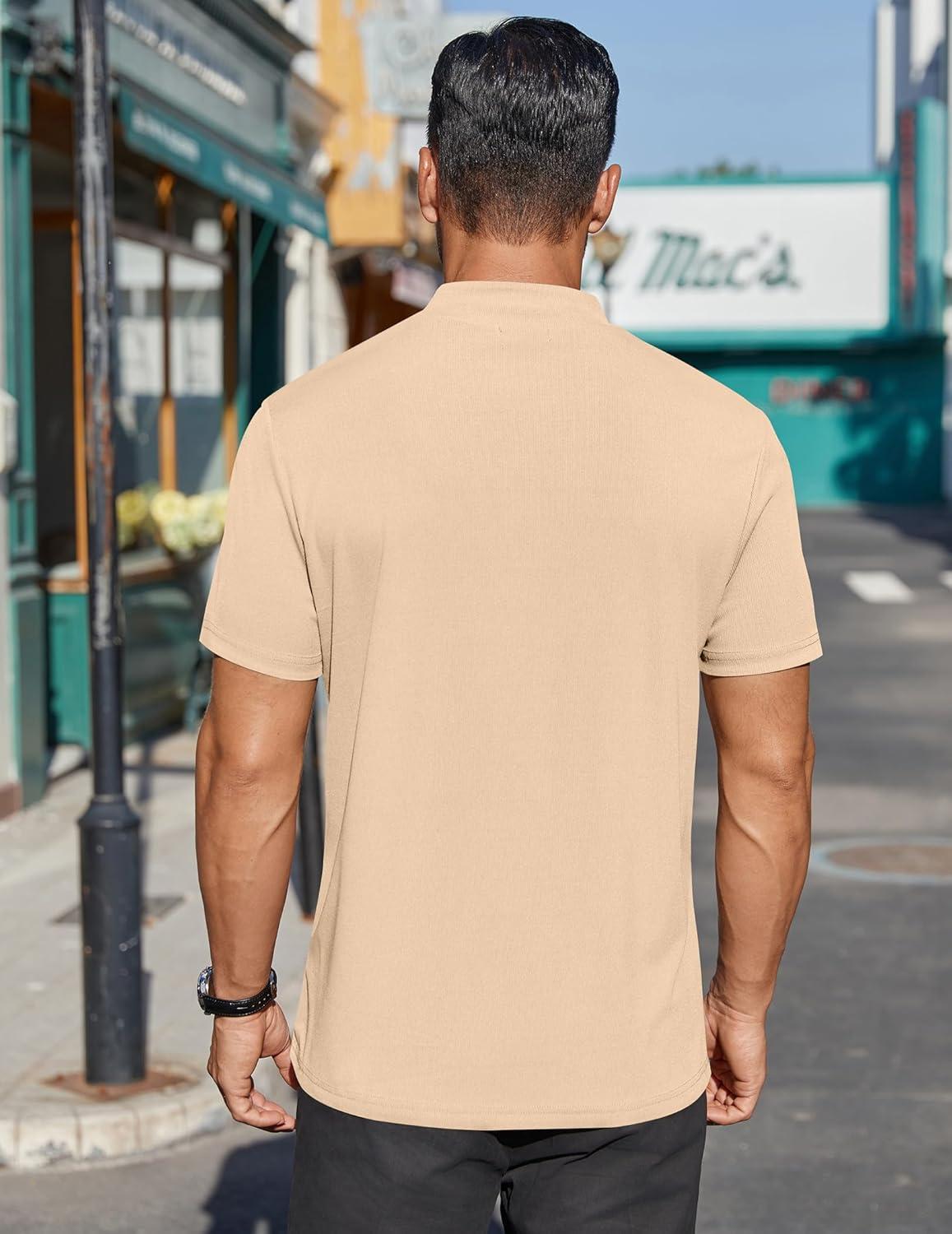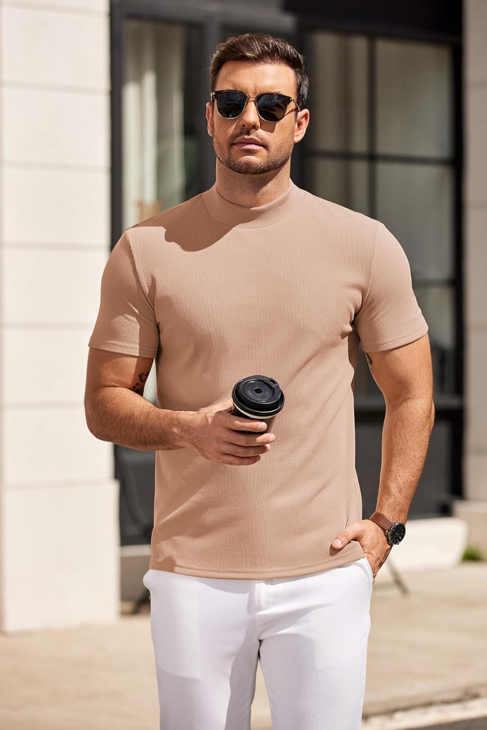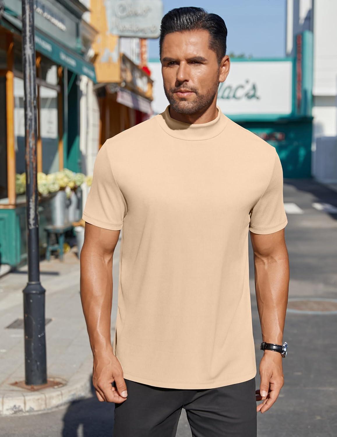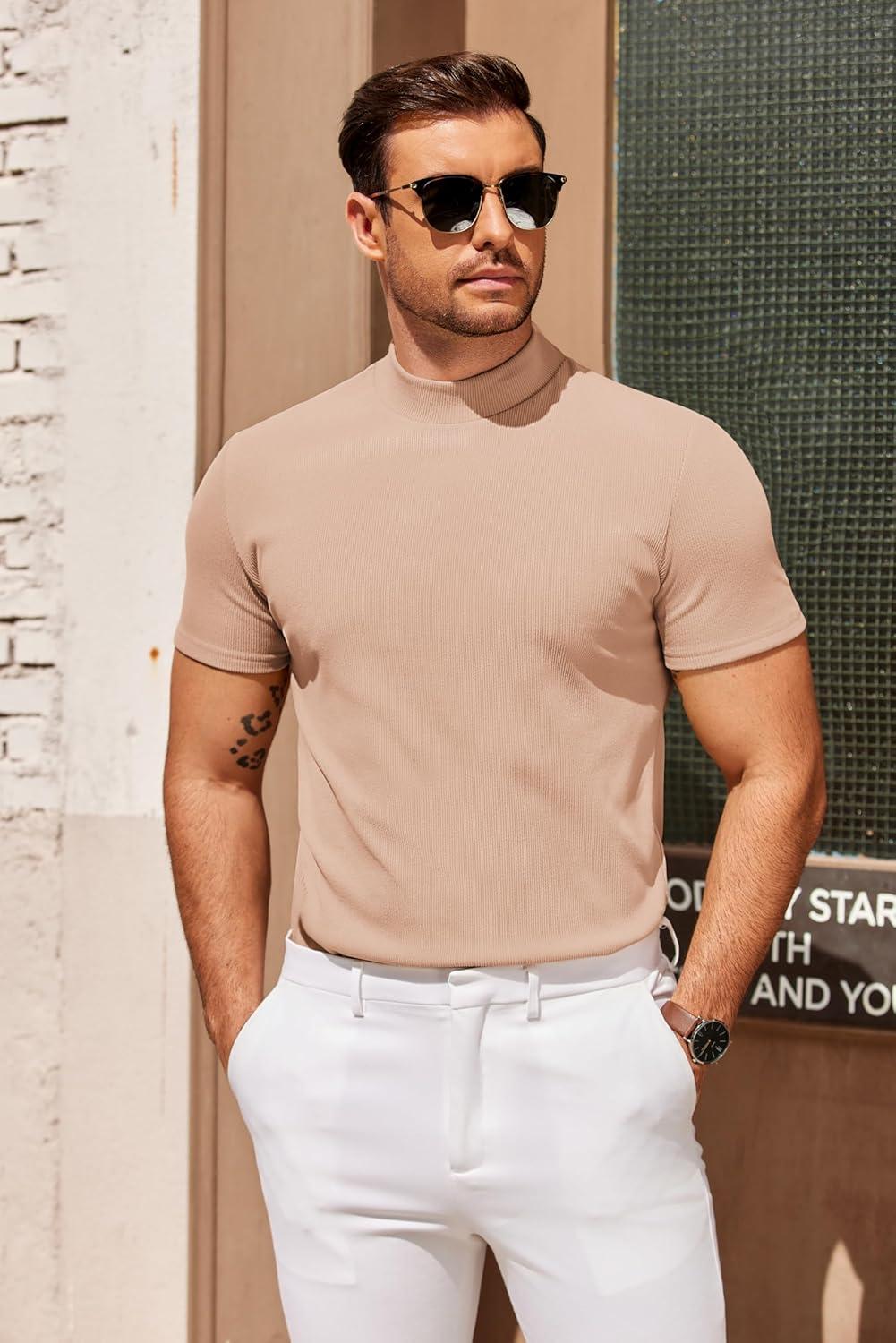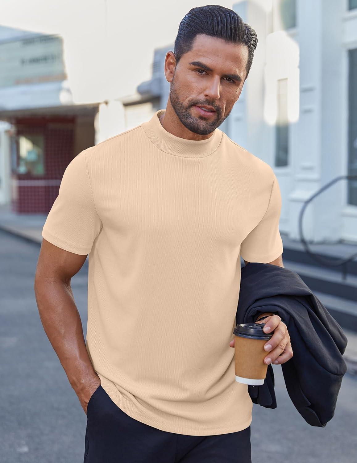 COOFANDY Mens Mock Turtleneck Shirts Short Sleeve Casual Basic T-Shirts Ribbed Solid Pullover Tops(Beige)