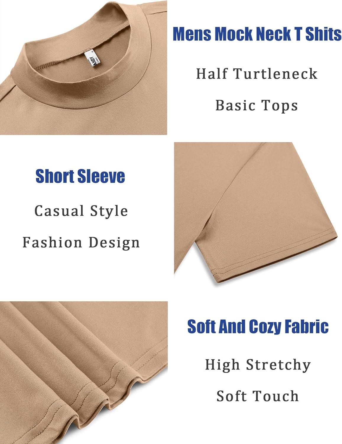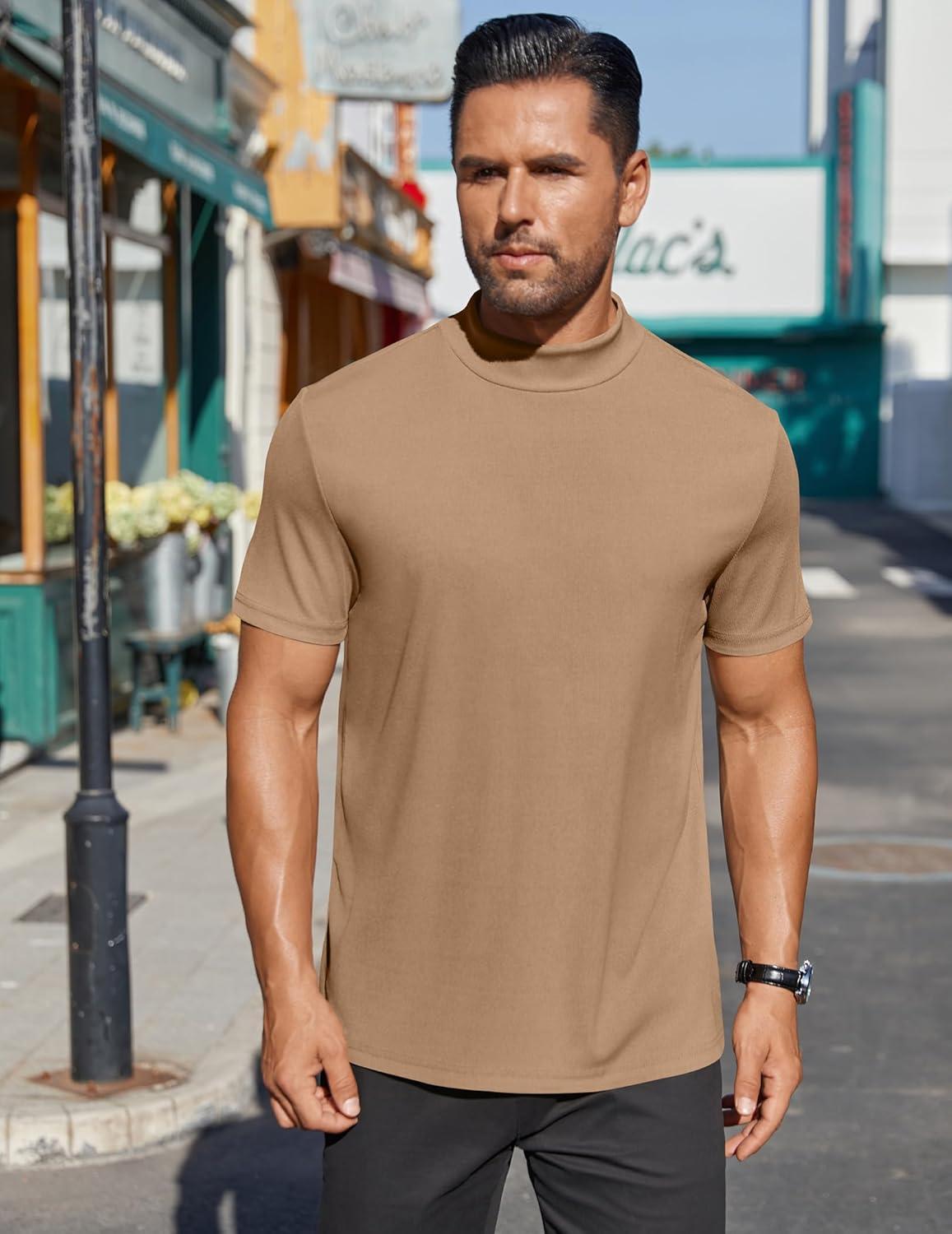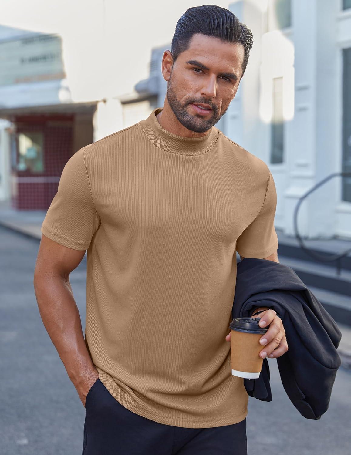 COOFANDY Mens Mock Turtleneck Shirts Short Sleeve Casual Basic T-Shirts Ribbed Solid Pullover Tops(A-khaki)