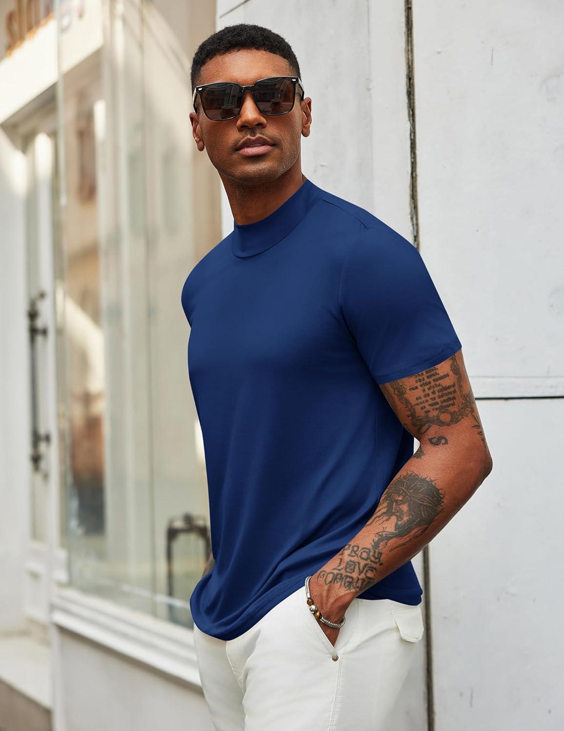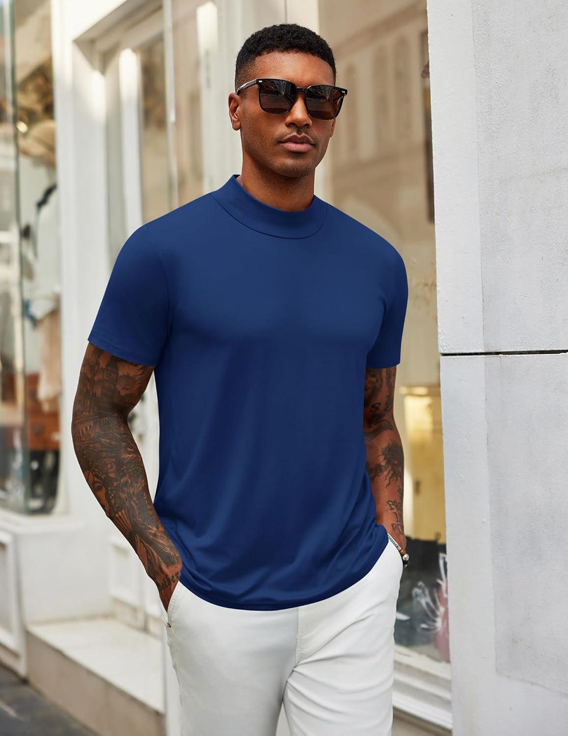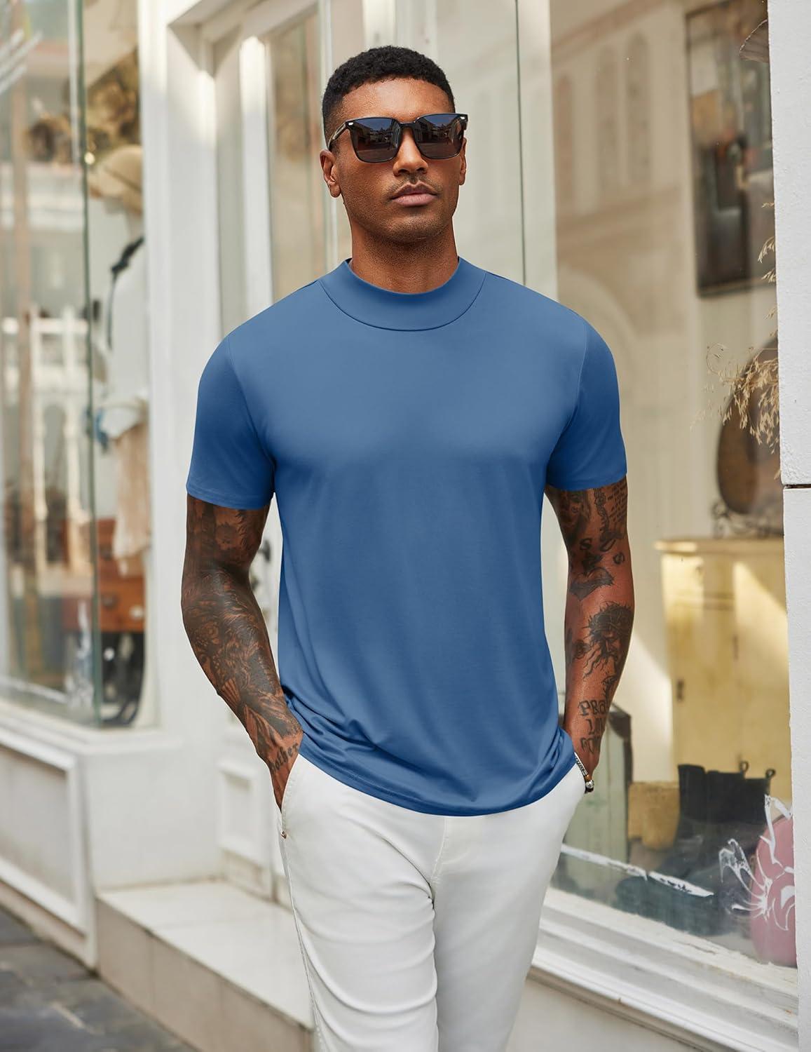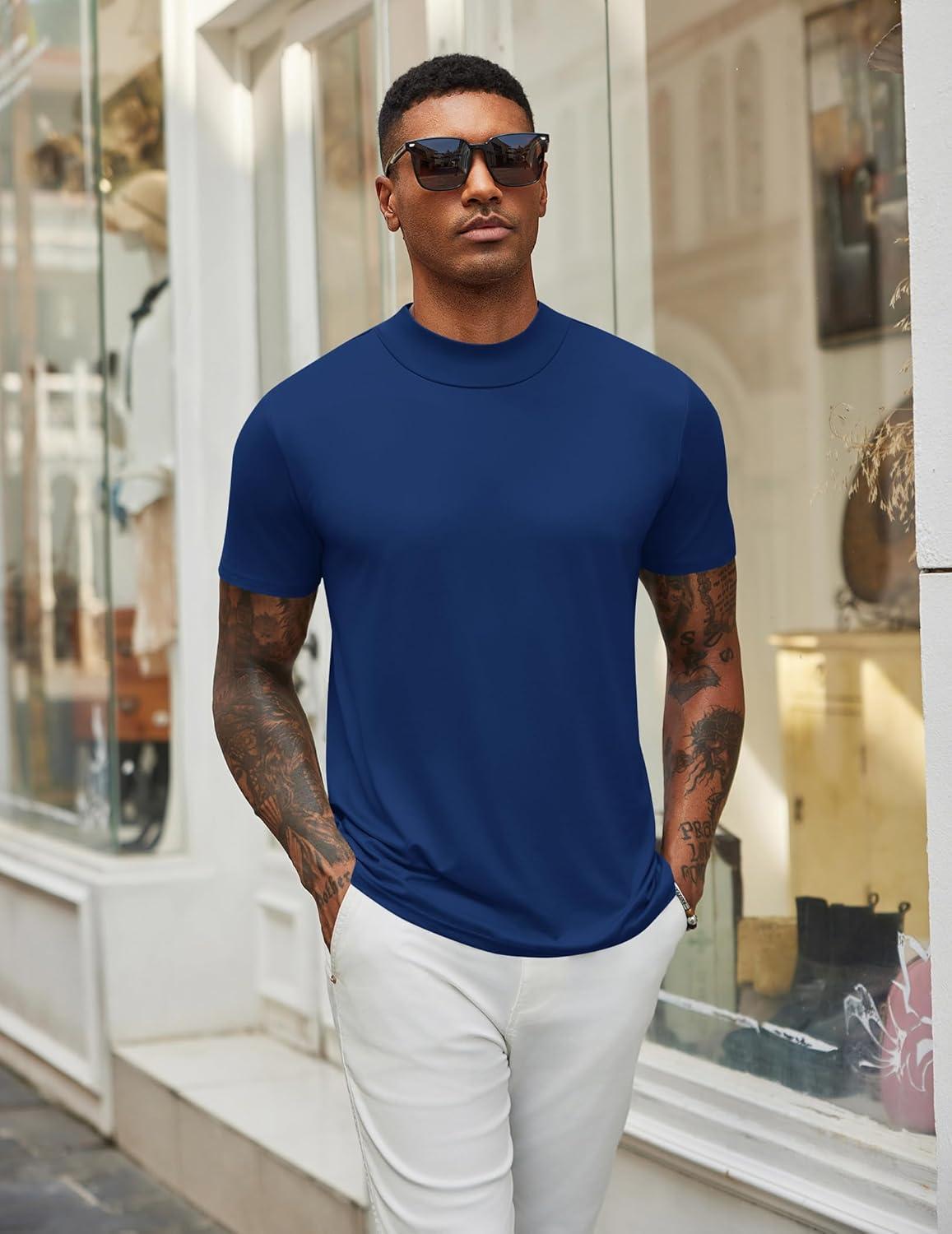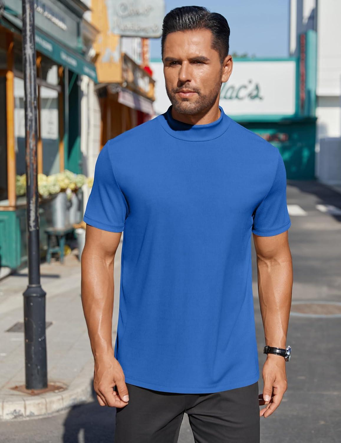 COOFANDY Mens Mock Turtleneck Shirts Short Sleeve Casual Basic T-Shirts Ribbed Solid Pullover Tops(Blue)