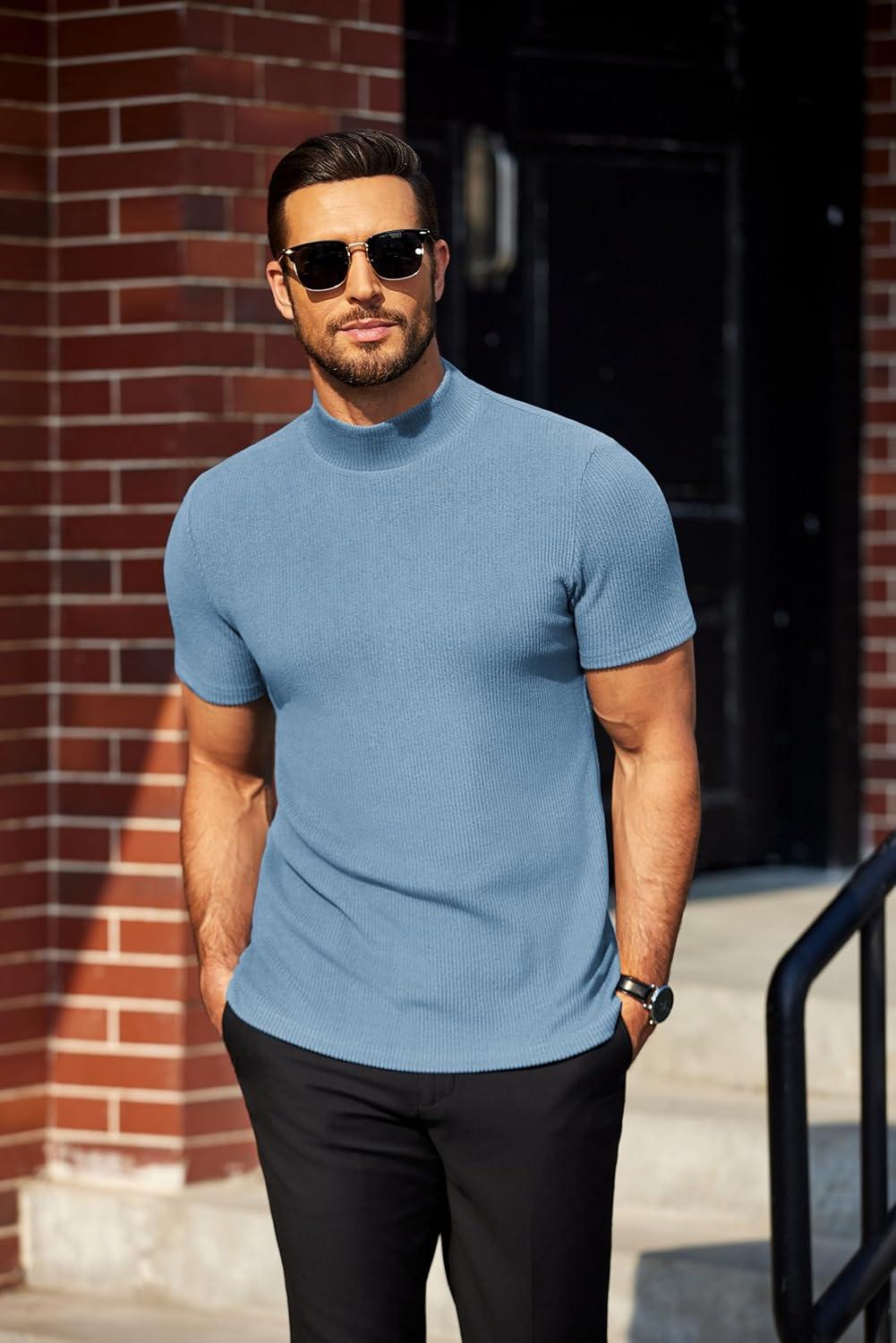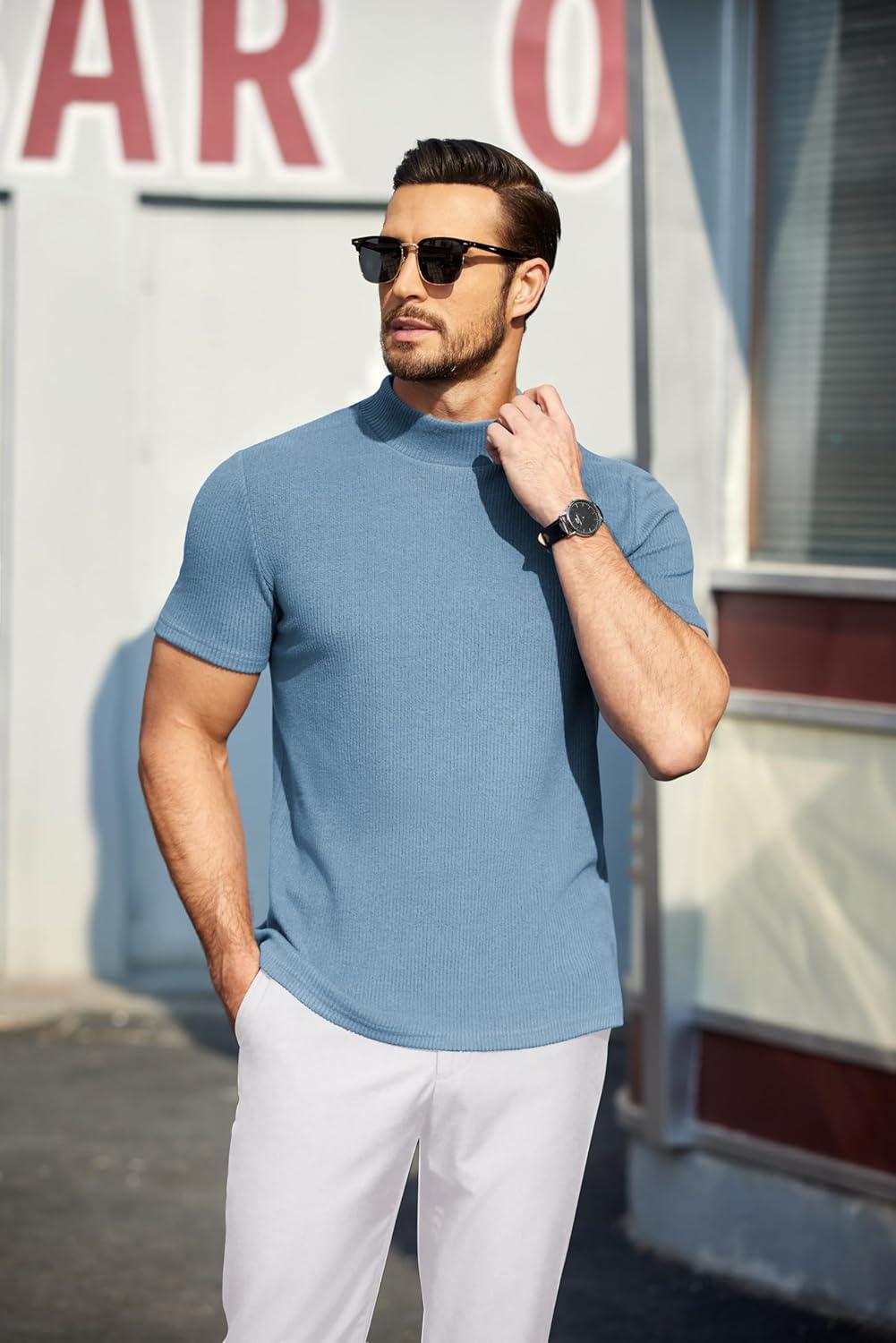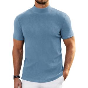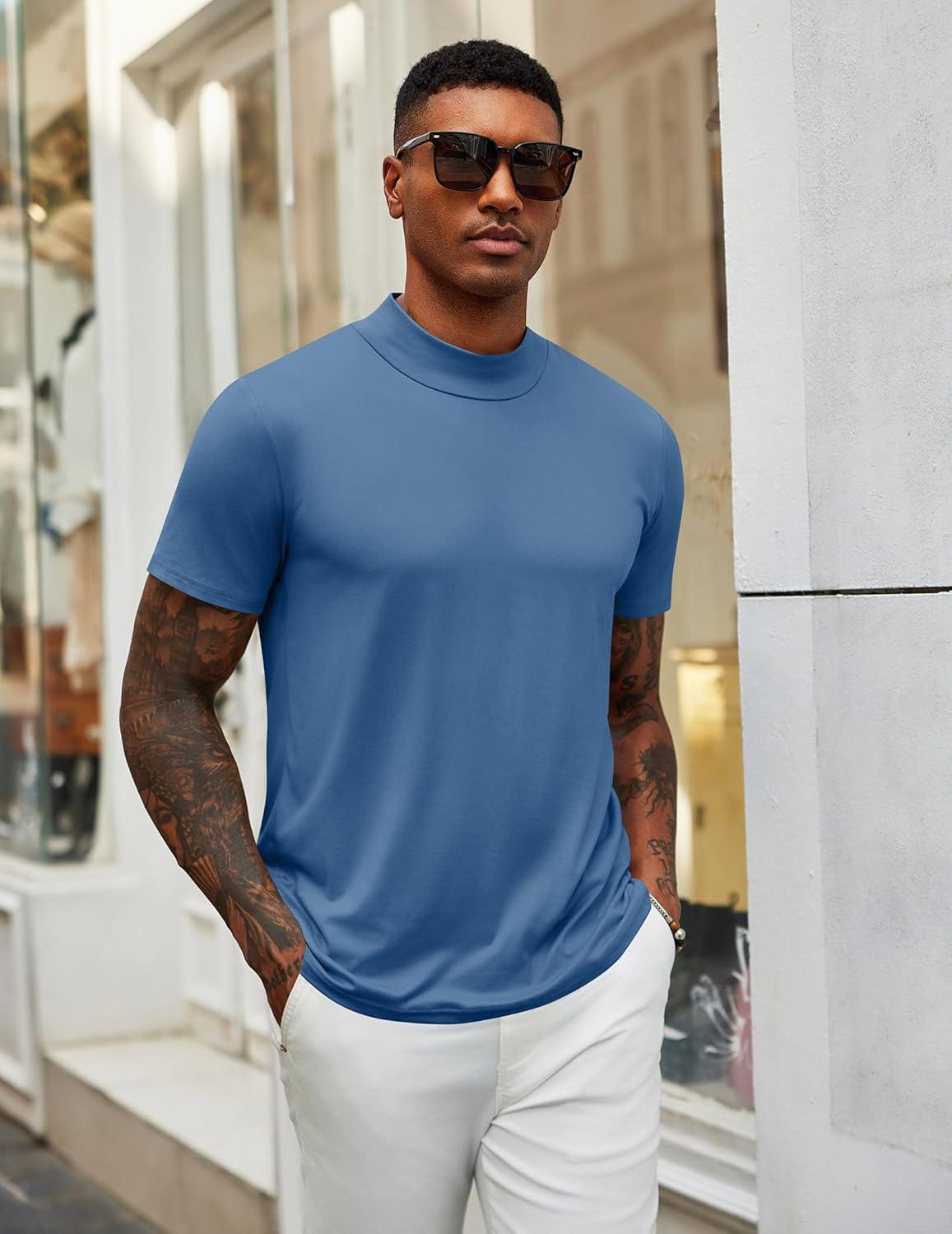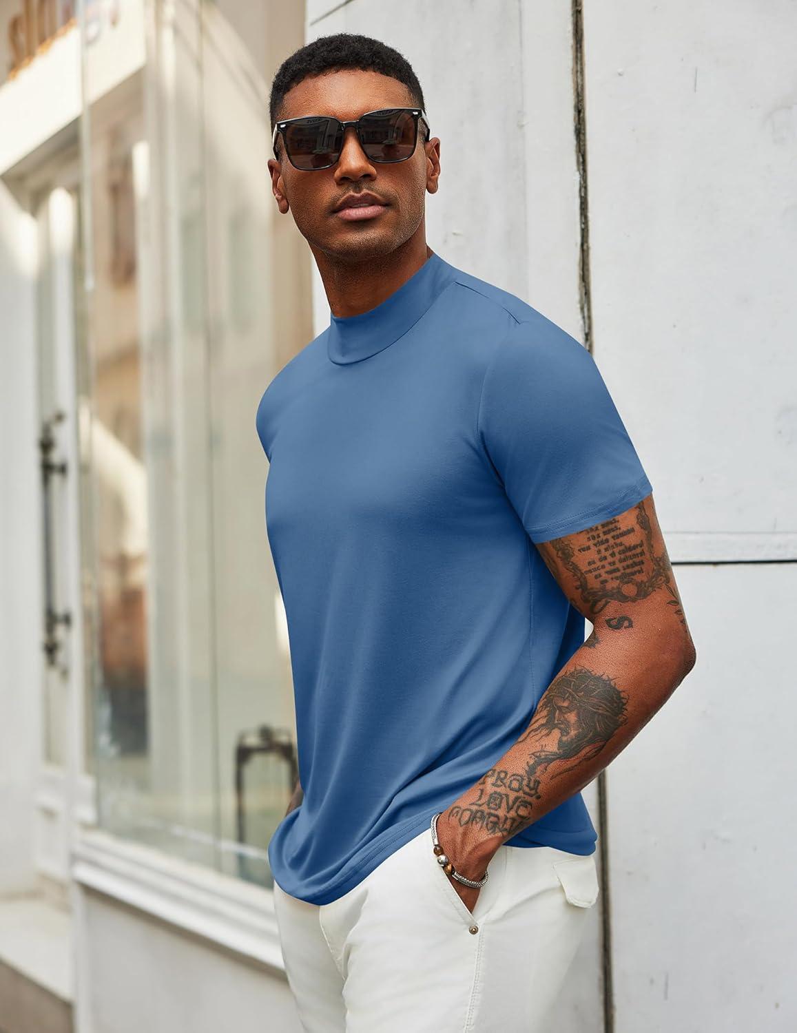COOFANDY Mens Mock Turtleneck Shirts Short Sleeve Casual Basic T-Shirts Ribbed Solid Pullover Tops(Blue)