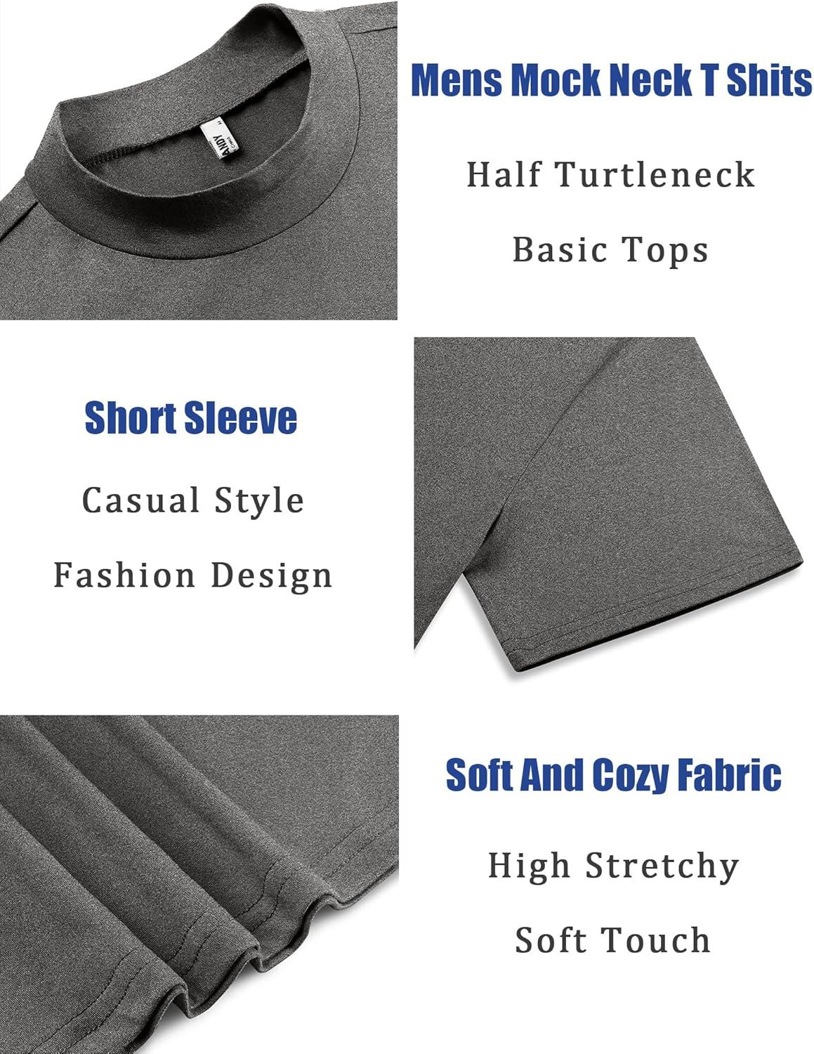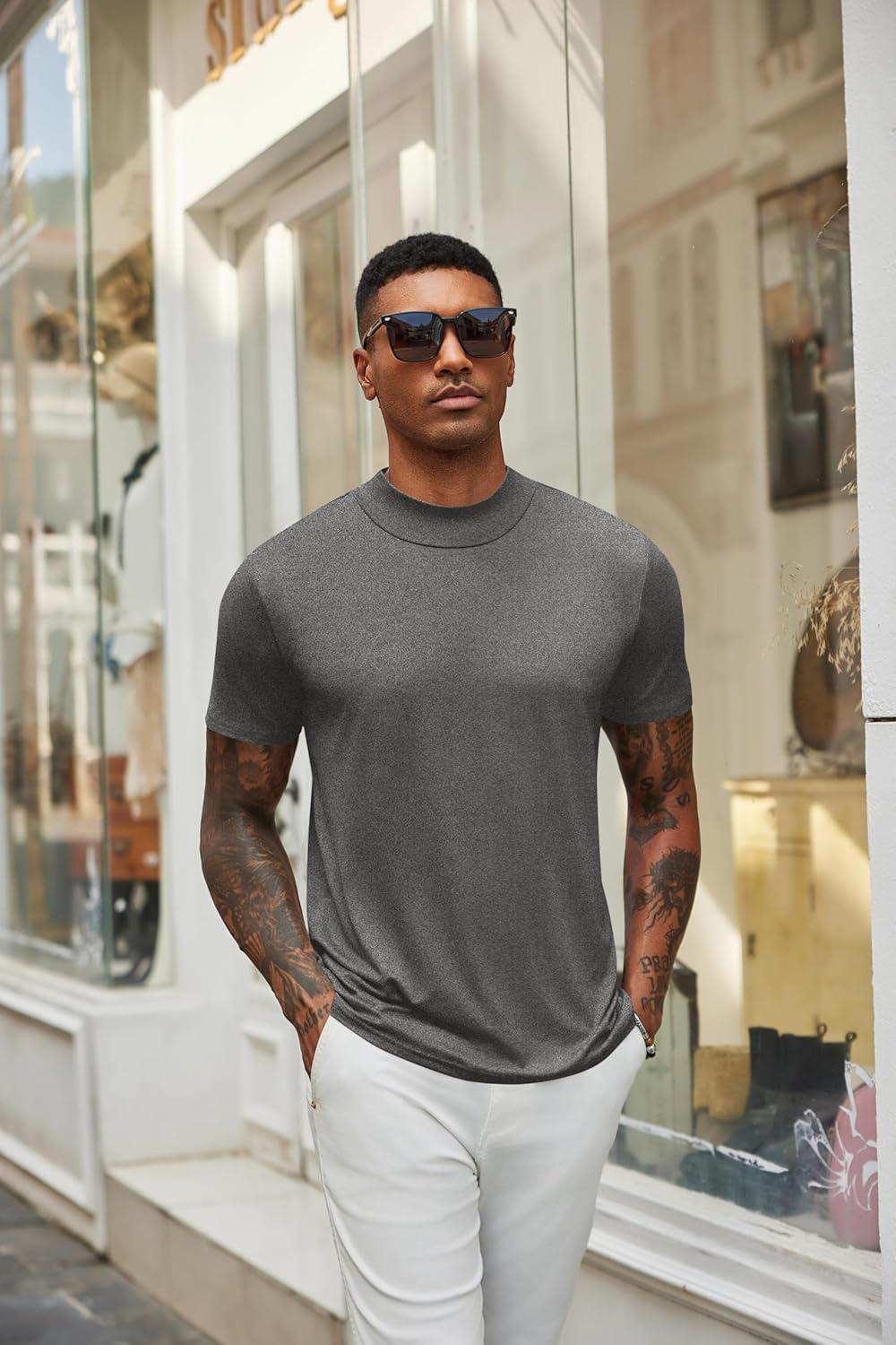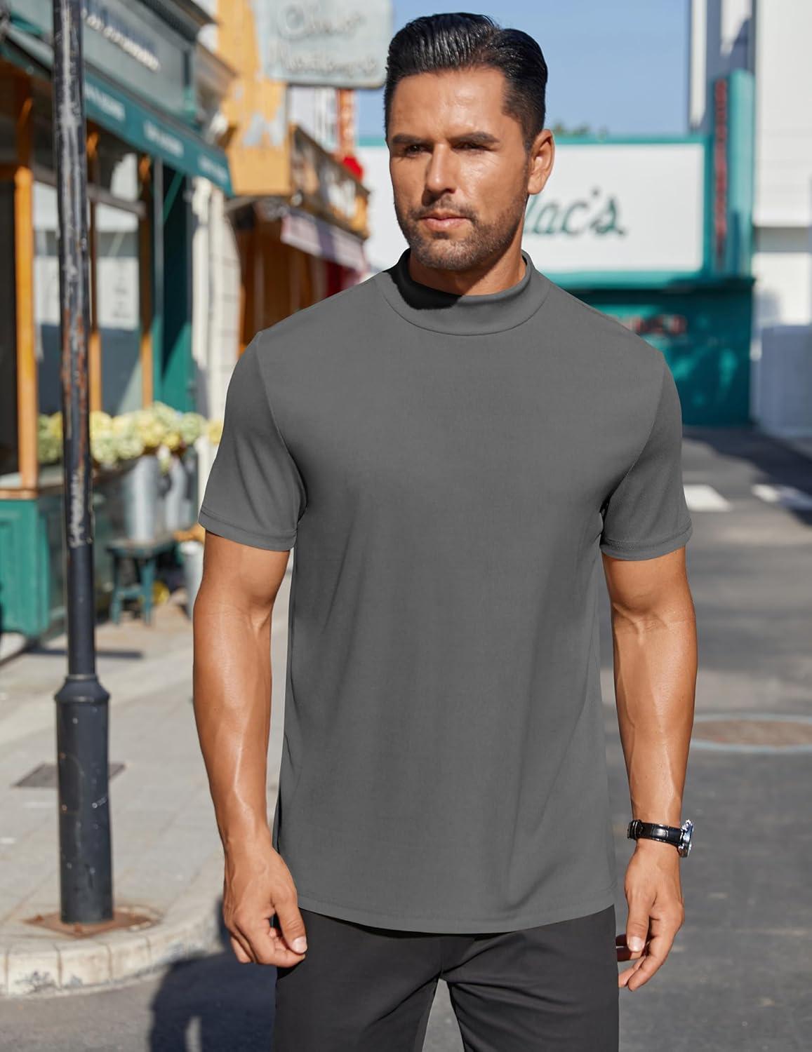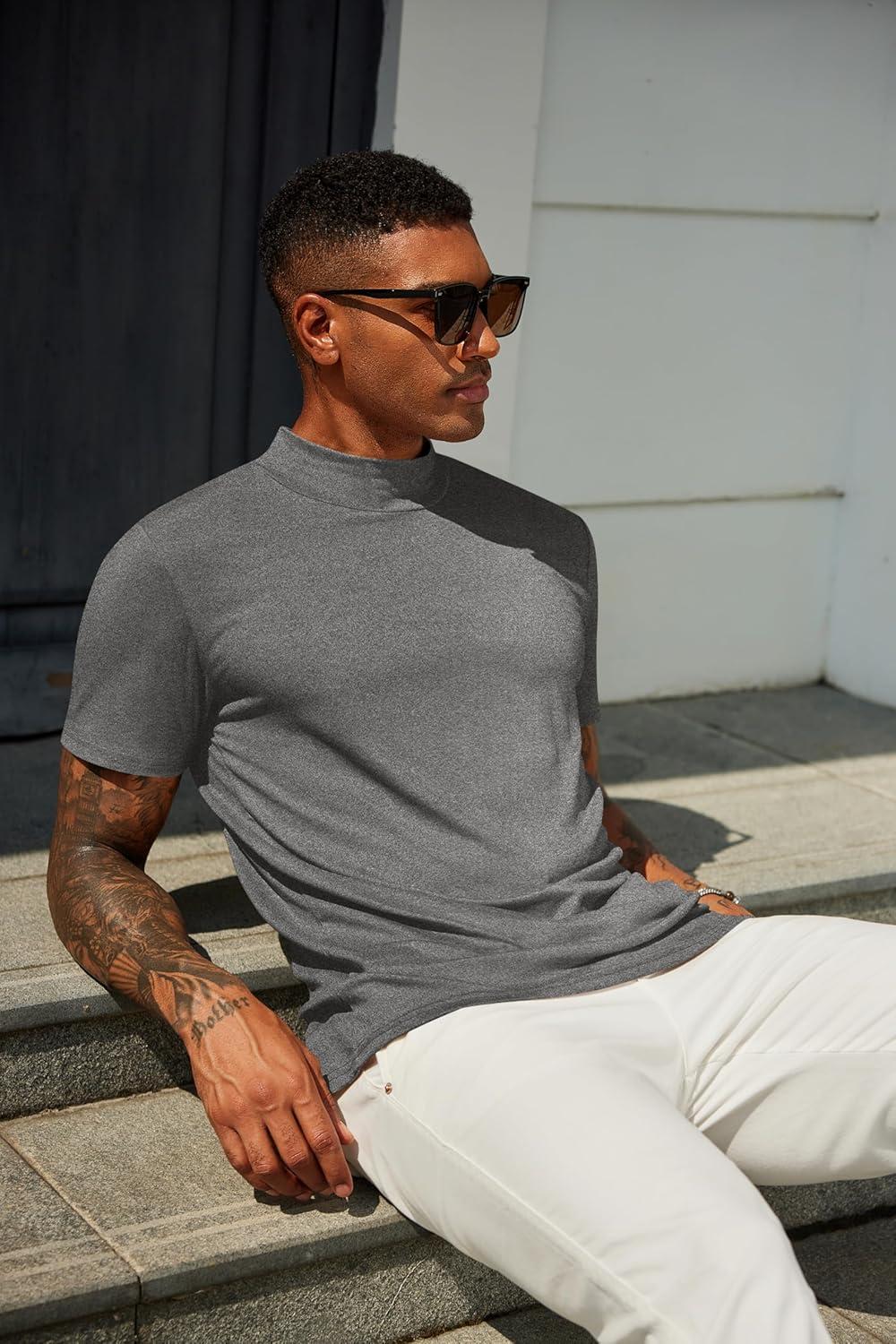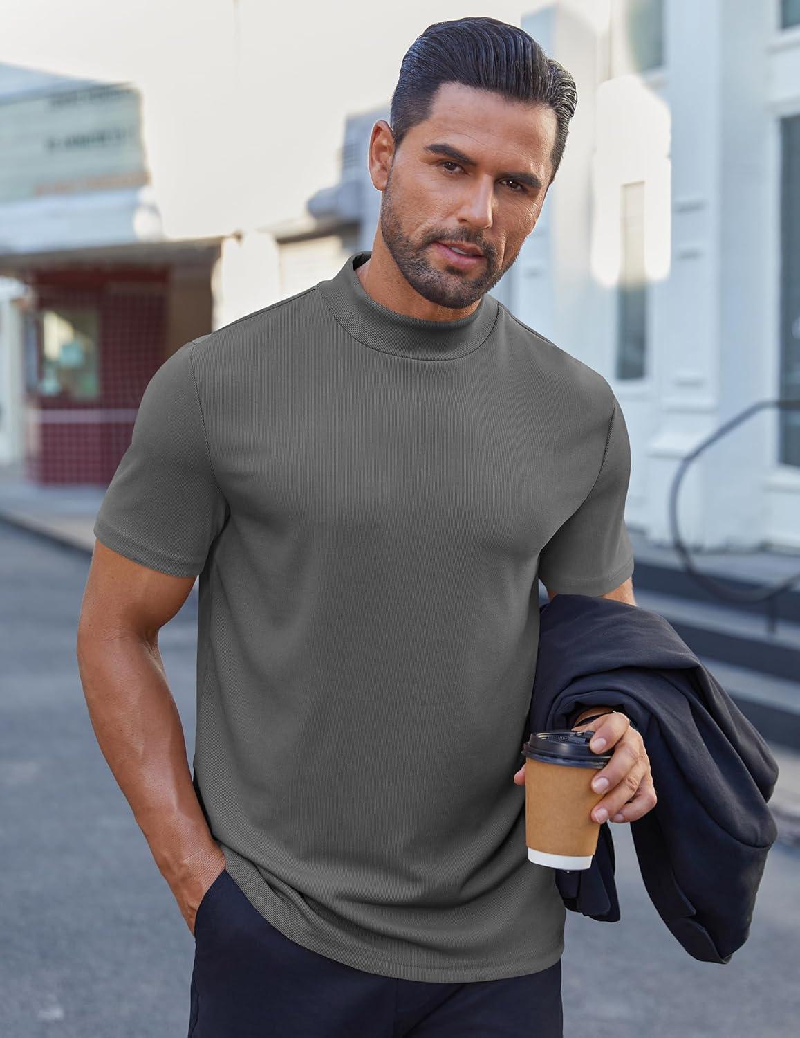 COOFANDY Mens Mock Turtleneck Shirts Short Sleeve Casual Basic T-Shirts Ribbed Solid Pullover Tops(Dark Grey)