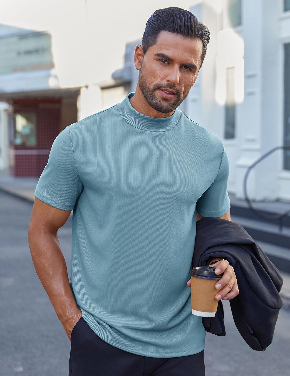COOFANDY Mens Mock Turtleneck Shirts Short Sleeve Casual Basic T-Shirts Ribbed Solid Pullover Tops(Greenish Blue)