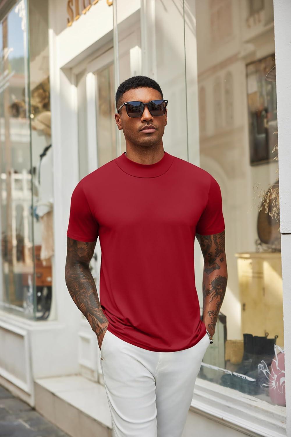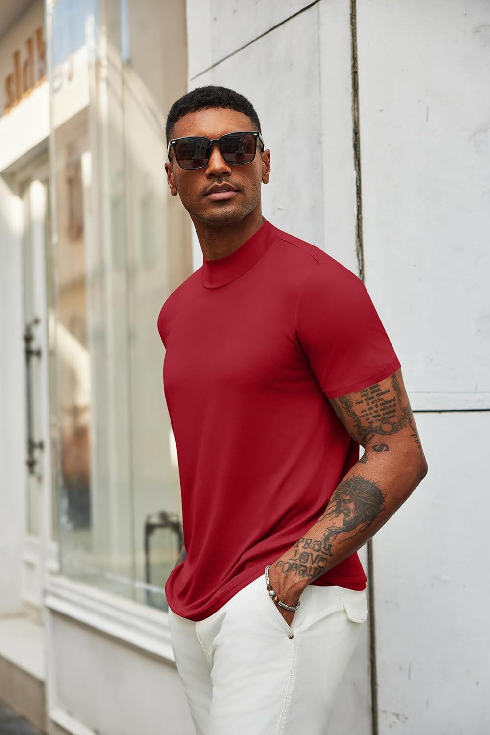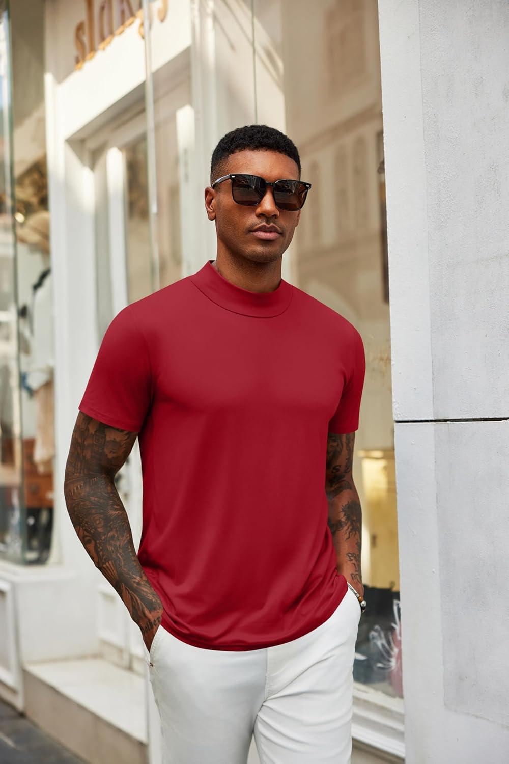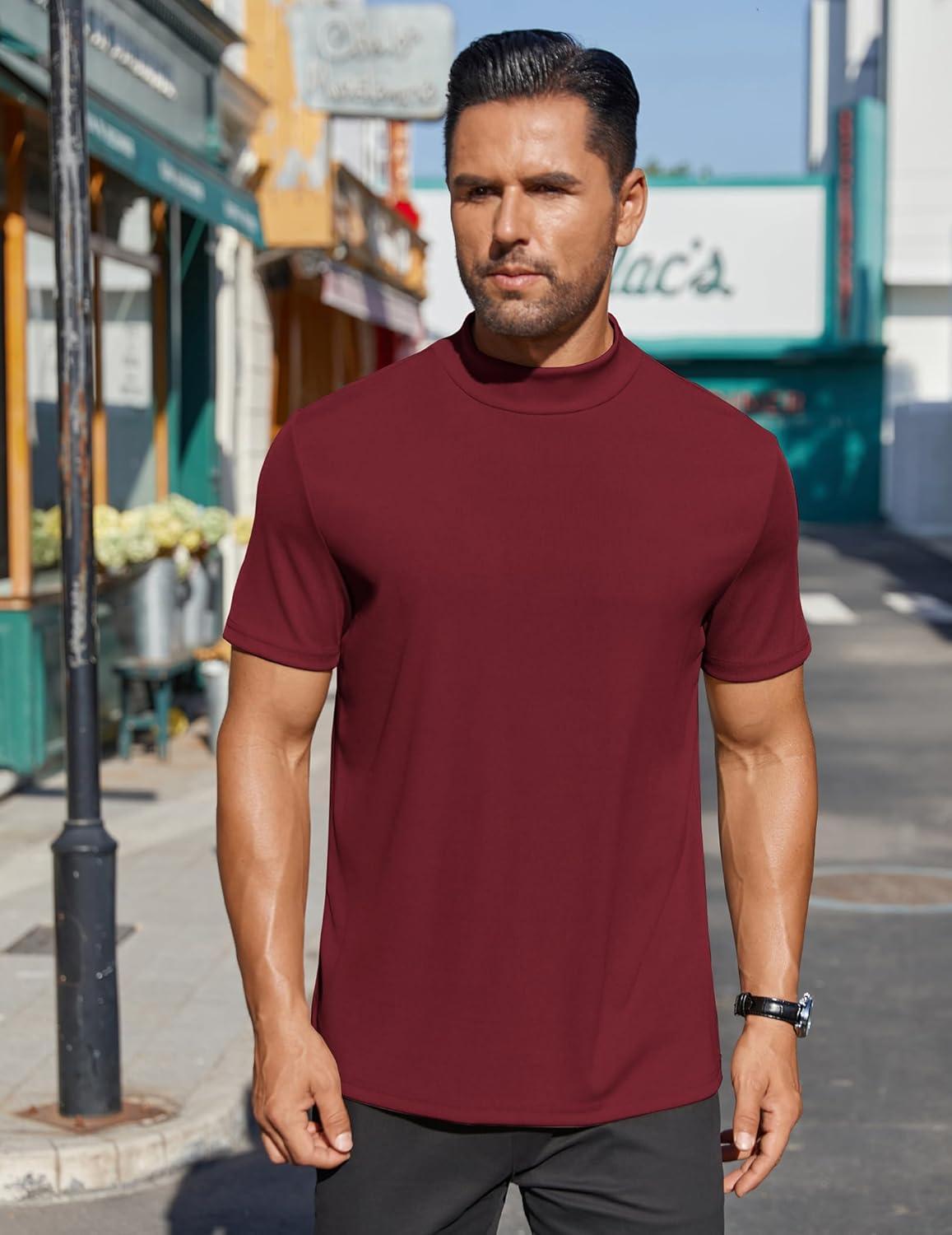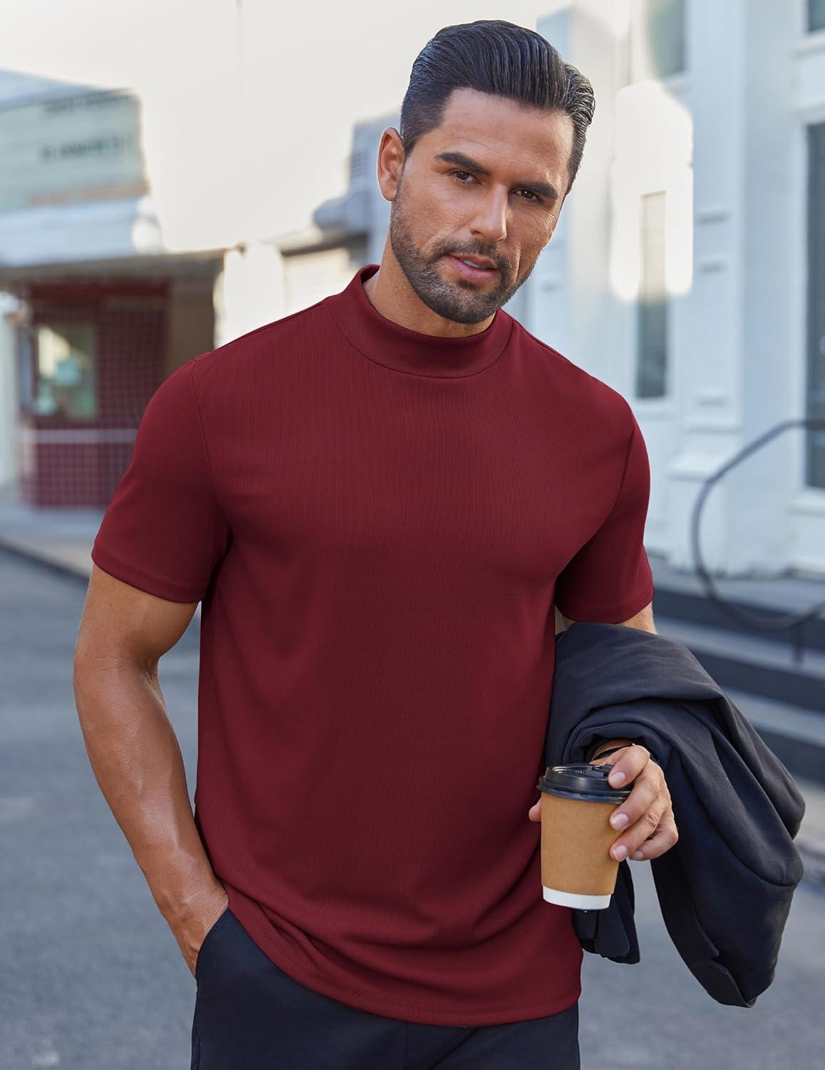 COOFANDY Mens Mock Turtleneck Shirts Short Sleeve Casual Basic T-Shirts Ribbed Solid Pullover Tops(Wine Red)