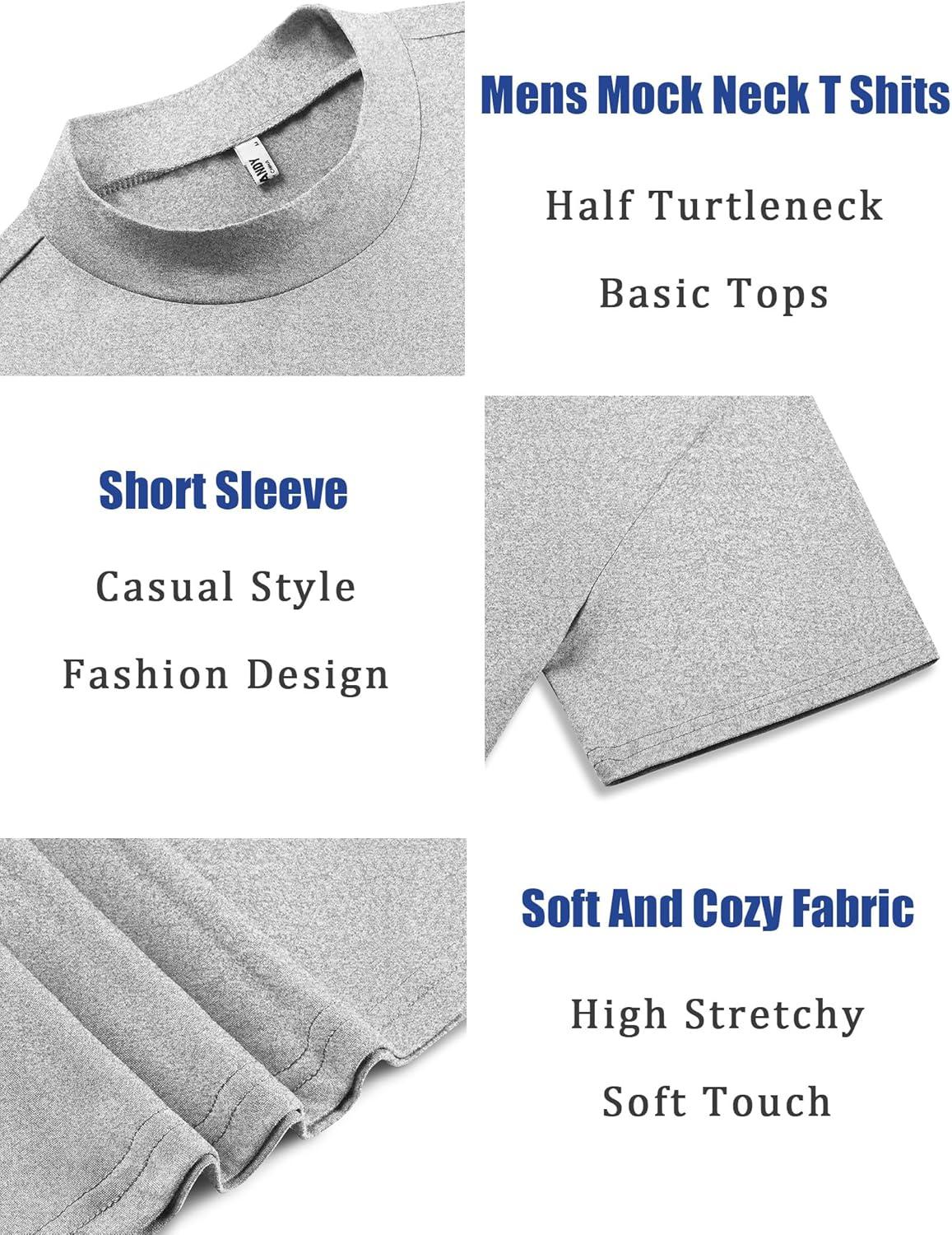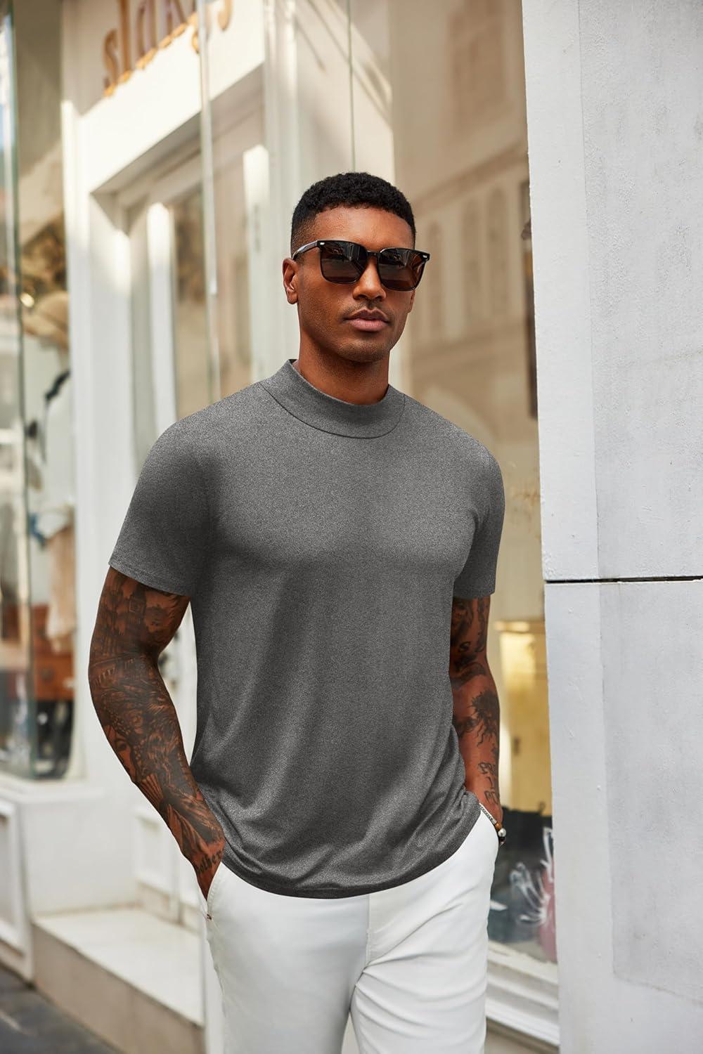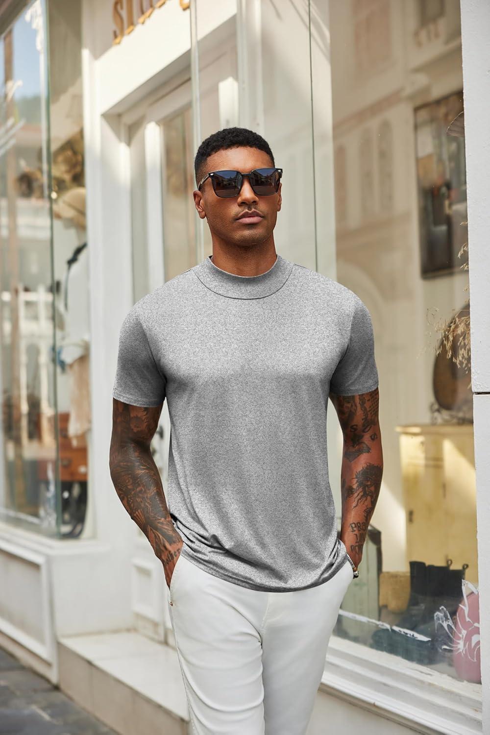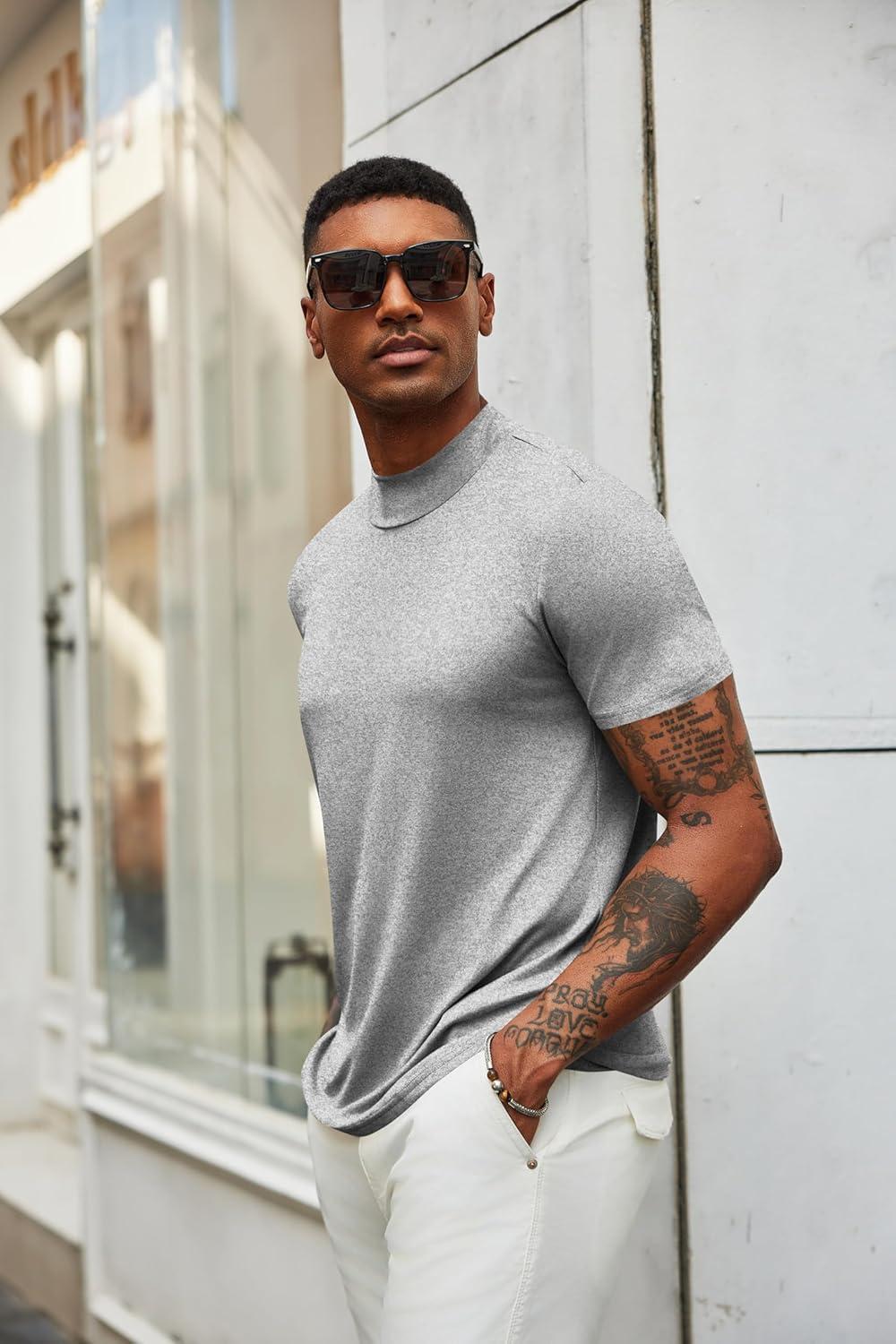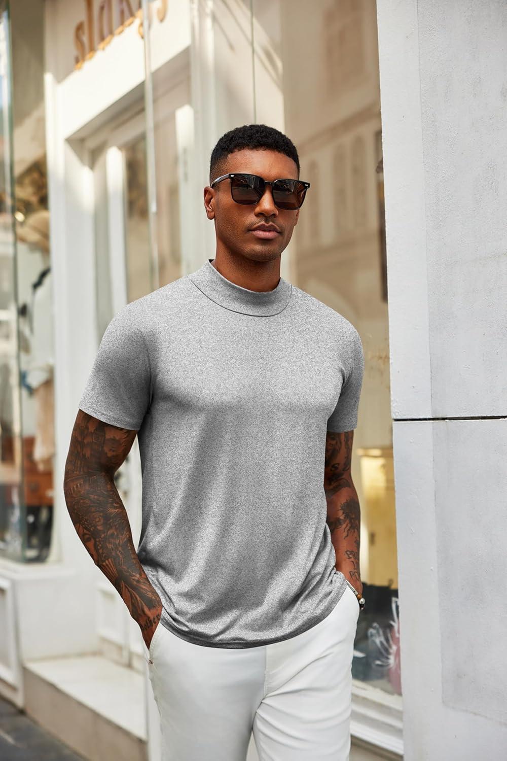 COOFANDY Mens Mock Turtleneck Shirts Short Sleeve Casual Basic T-Shirts Ribbed Solid Pullover Tops(Light Grey)