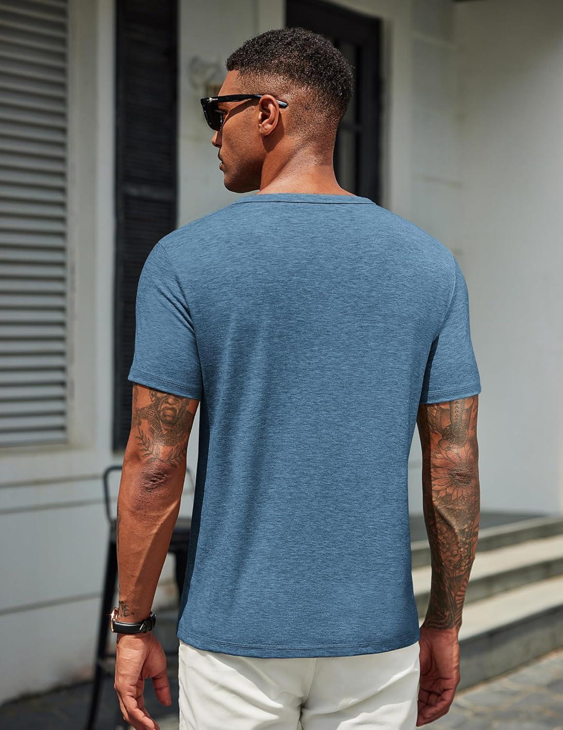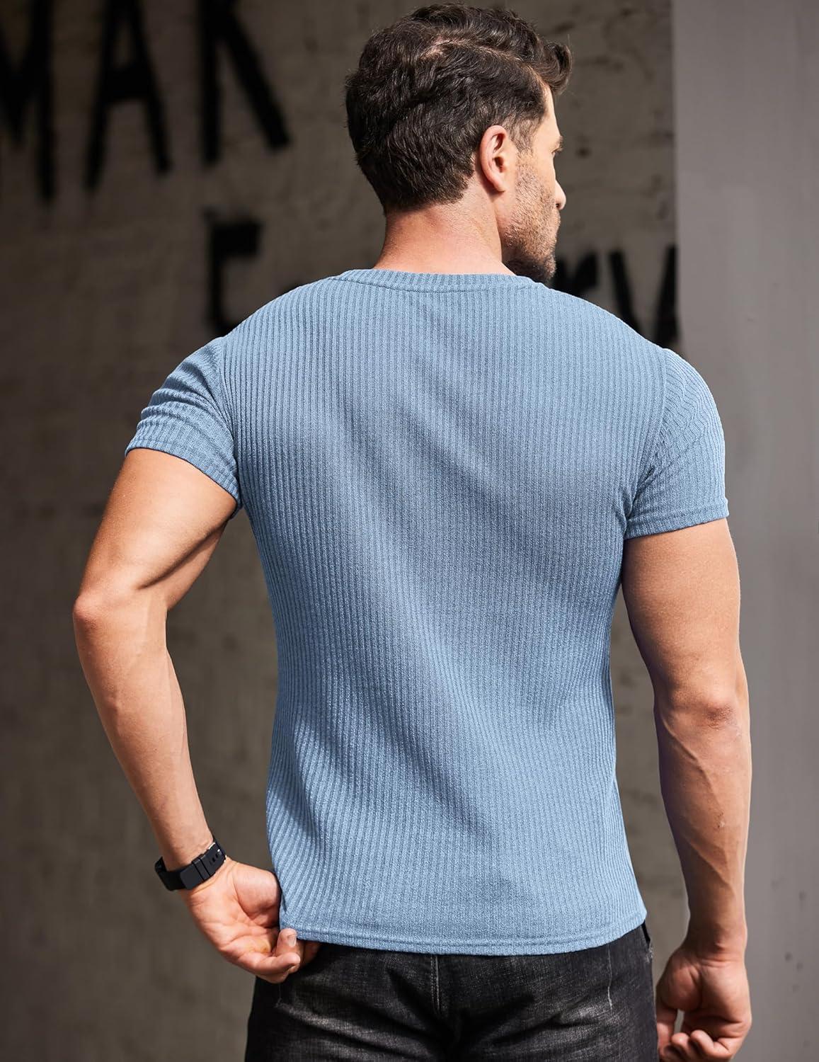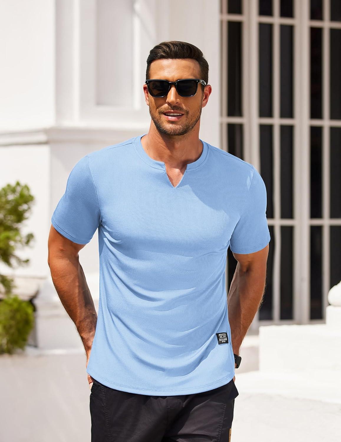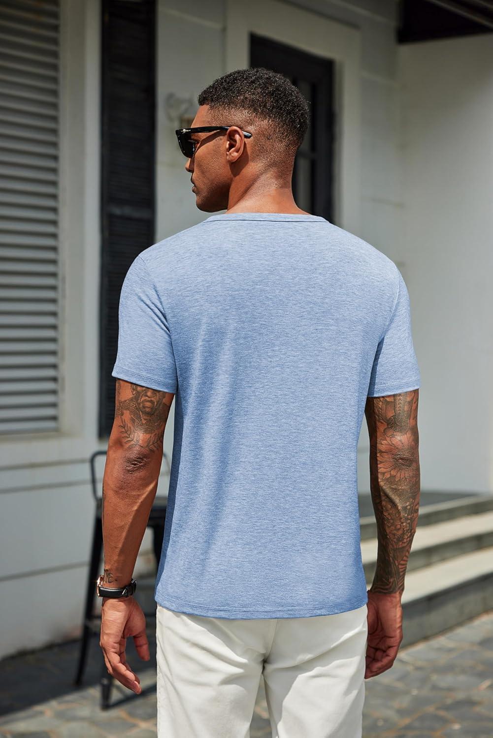 COOFANDY Mens Henley Shirts Short Sleeve Tshirt Basic Button Tees Summer Ribbed Pocket T Shirt Casual Stretch Tops(Light Blue)