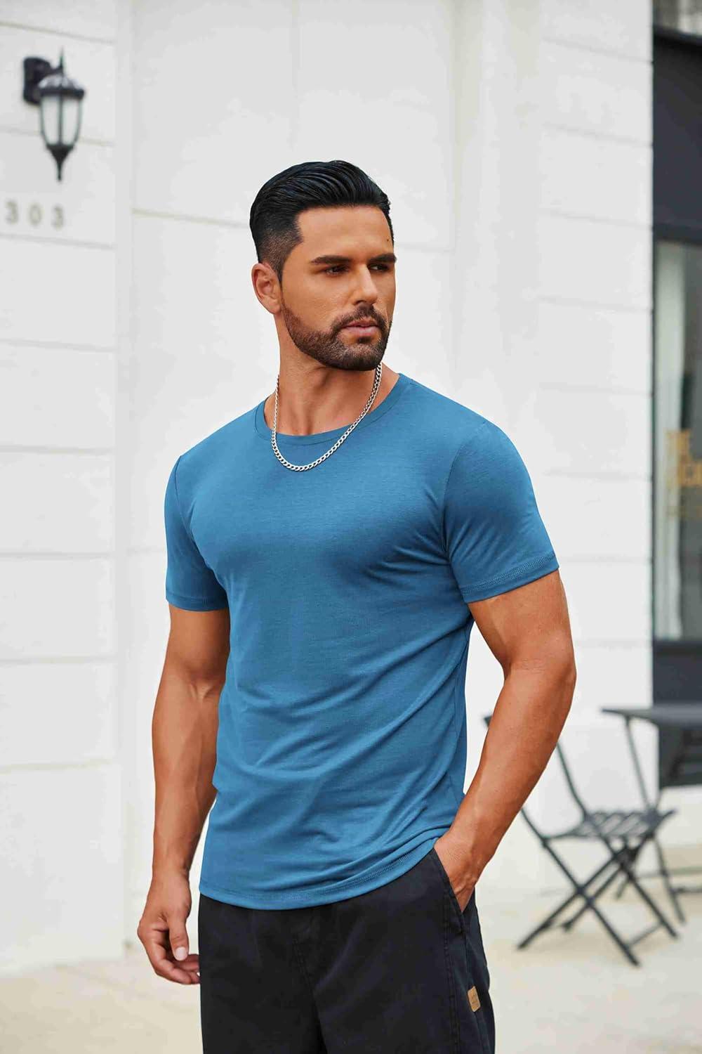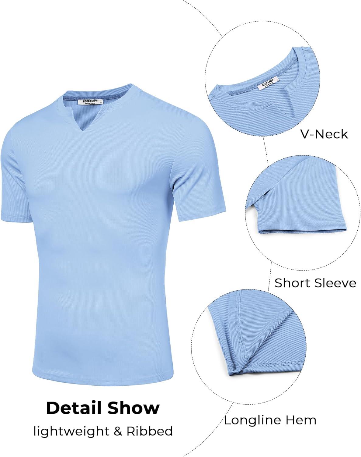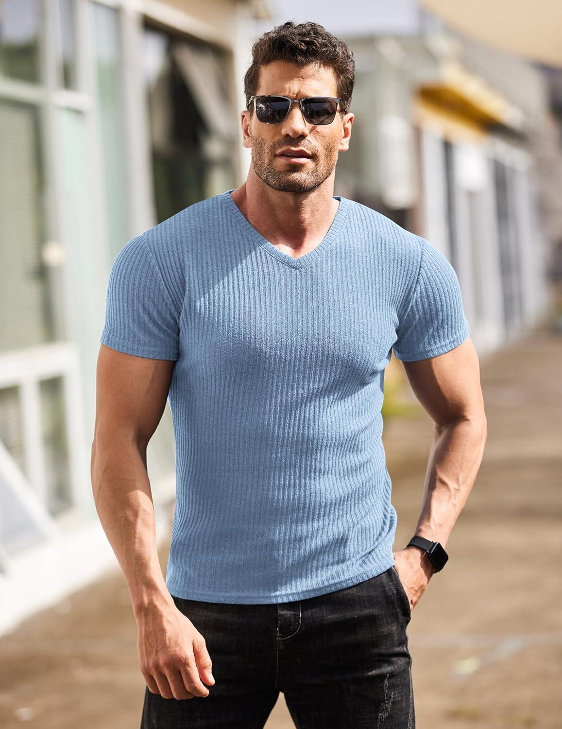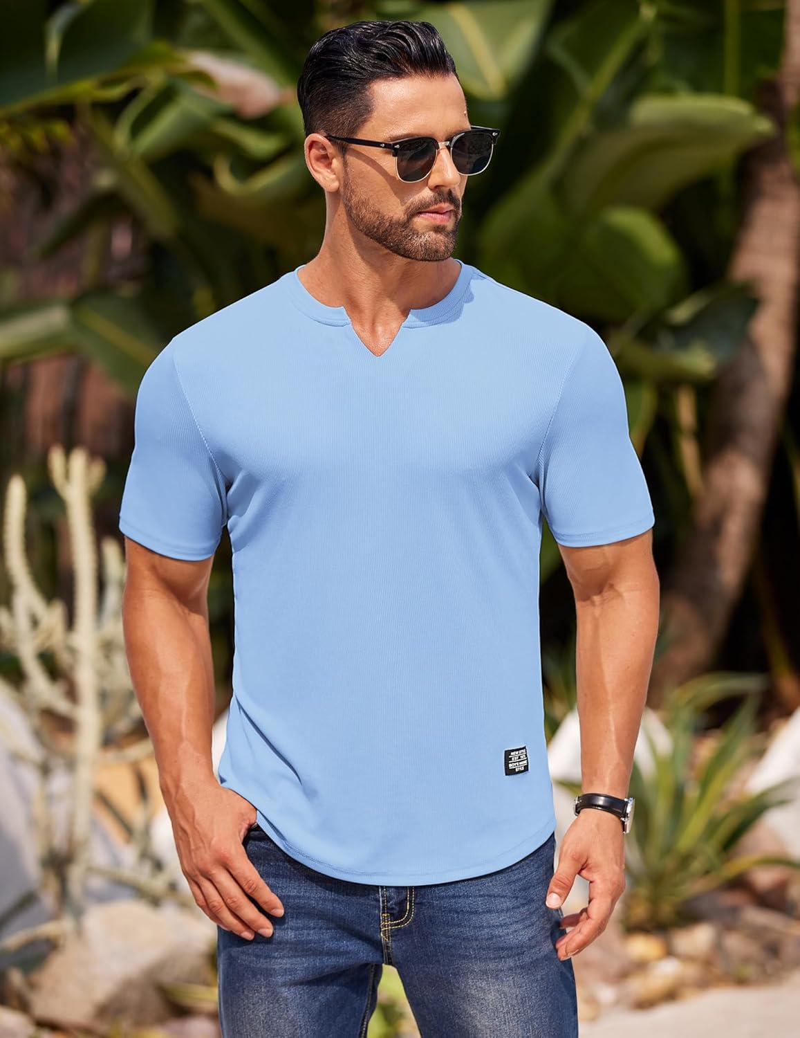 COOFANDY Mens Muscle T-Shirts V-Neck Slim Fit Workout Shirt Short Sleeve Longline Gym Athletic Tee Shirts(Light Blue)