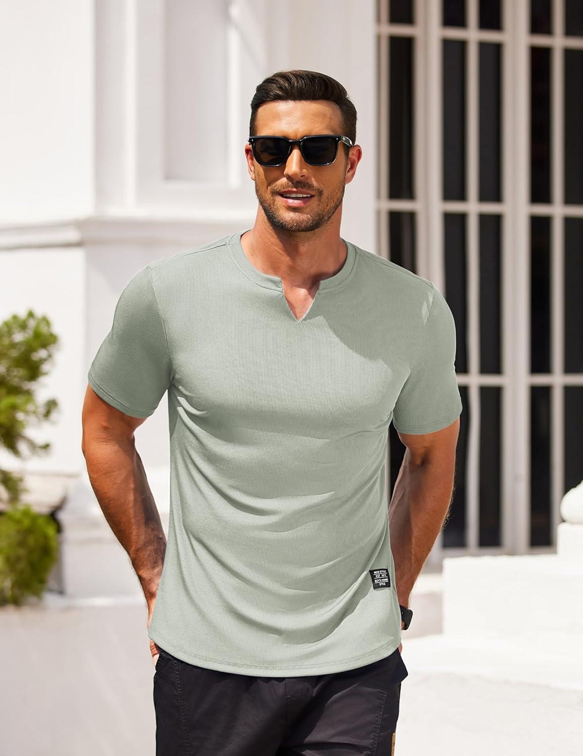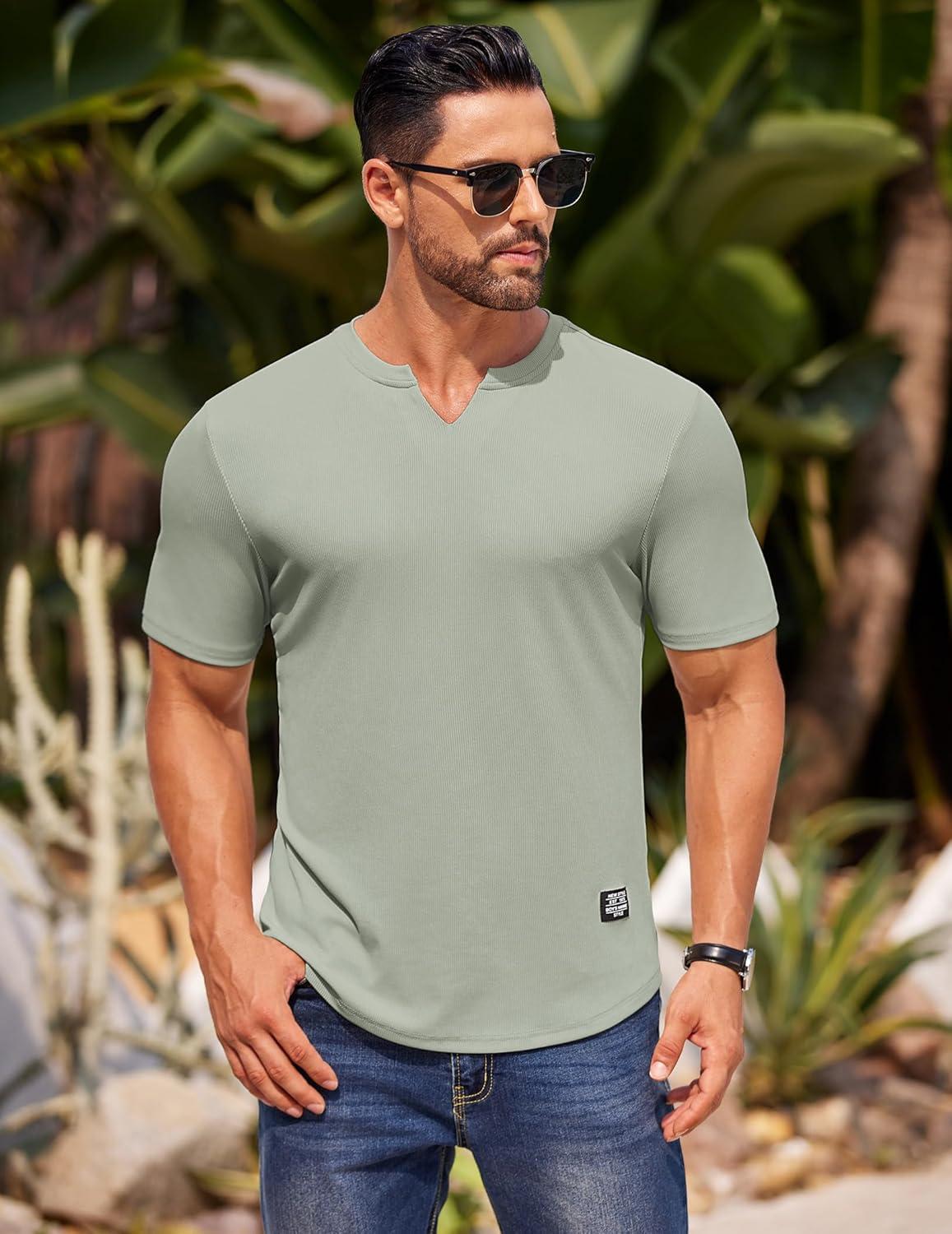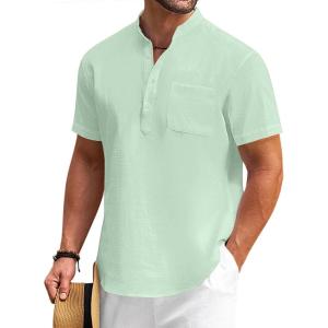 COOFANDY Men Casual Henley Tee Shirt Short Sleeve Band Collar Summer Beach Textured T-Shirt(Ice Green)