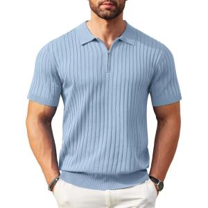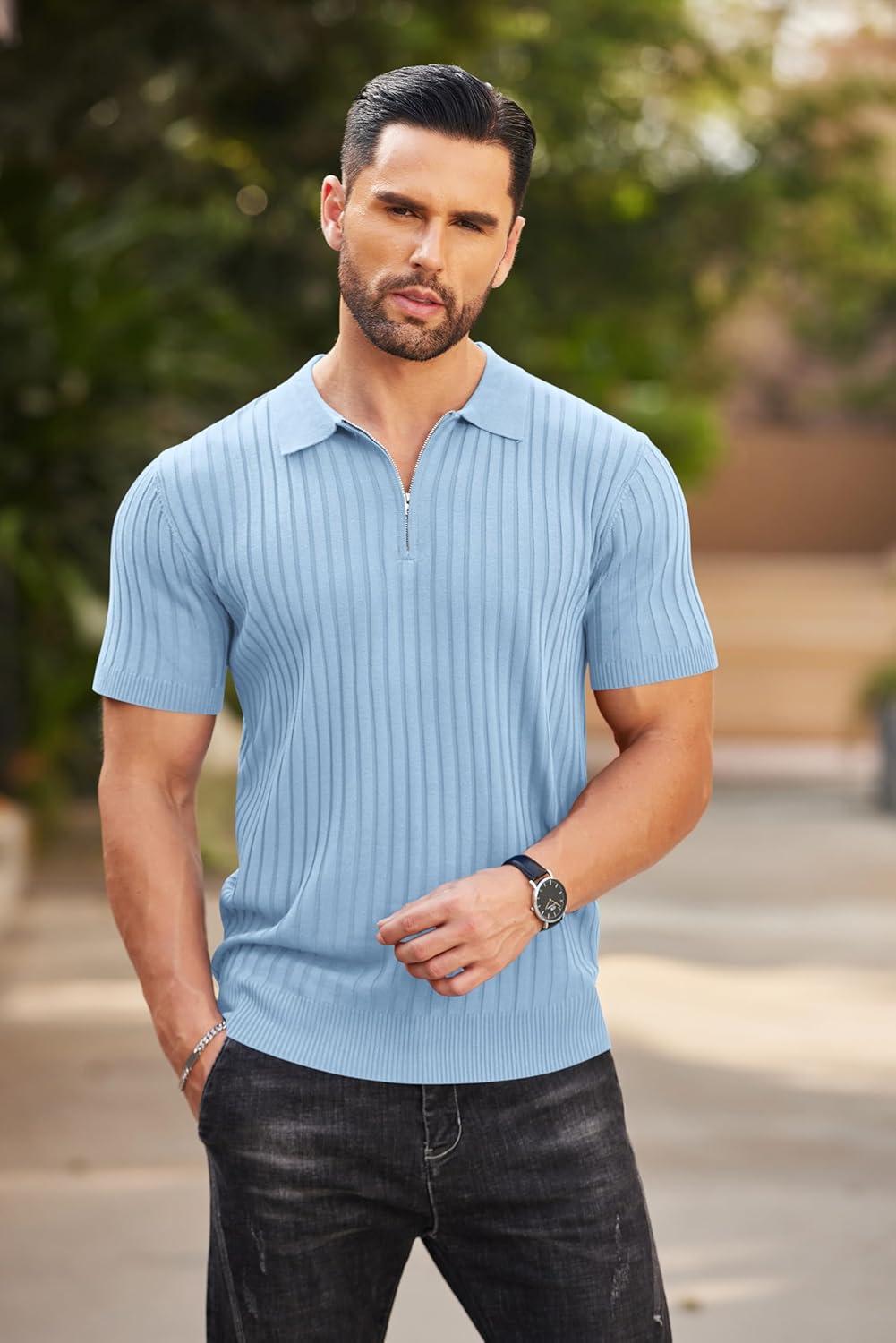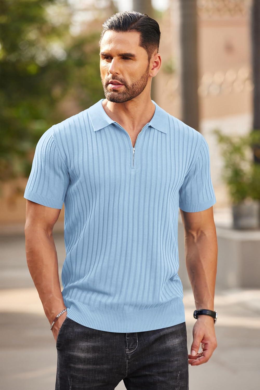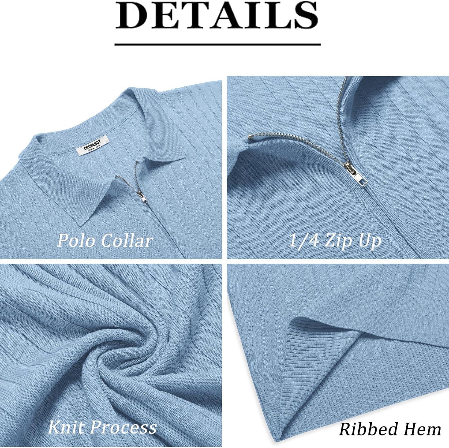 COOFANDY Men’s Zipper Polo Shirts Short Sleeve Ribbed Knit Polo T Shirts Fashion Casual Golf Shirts(Sky Blue)