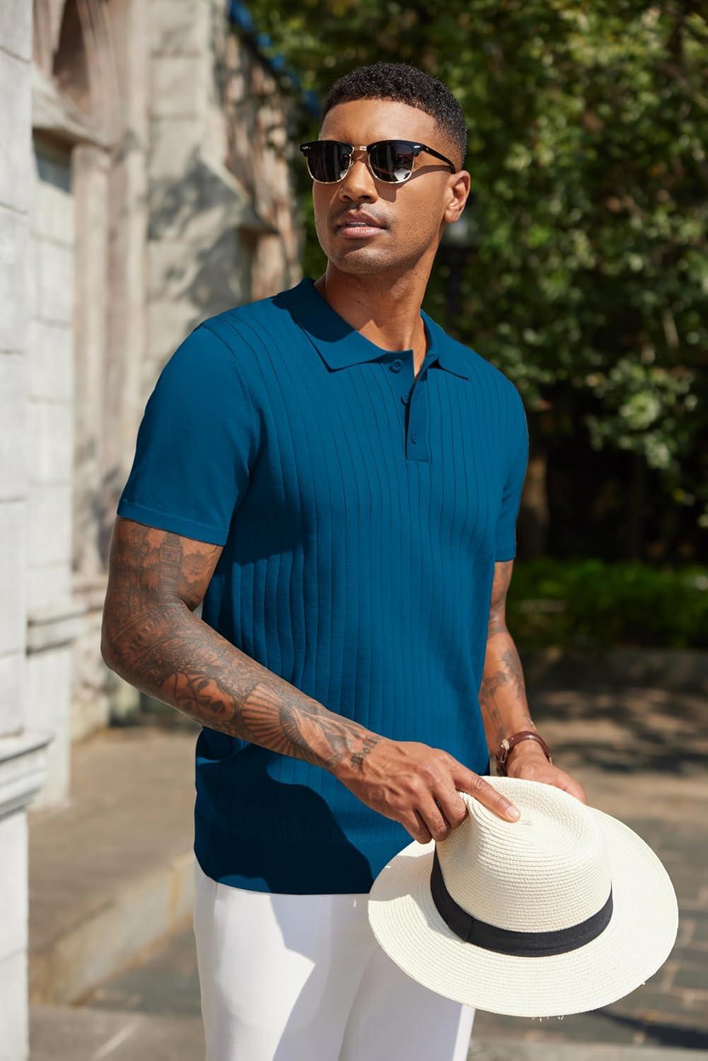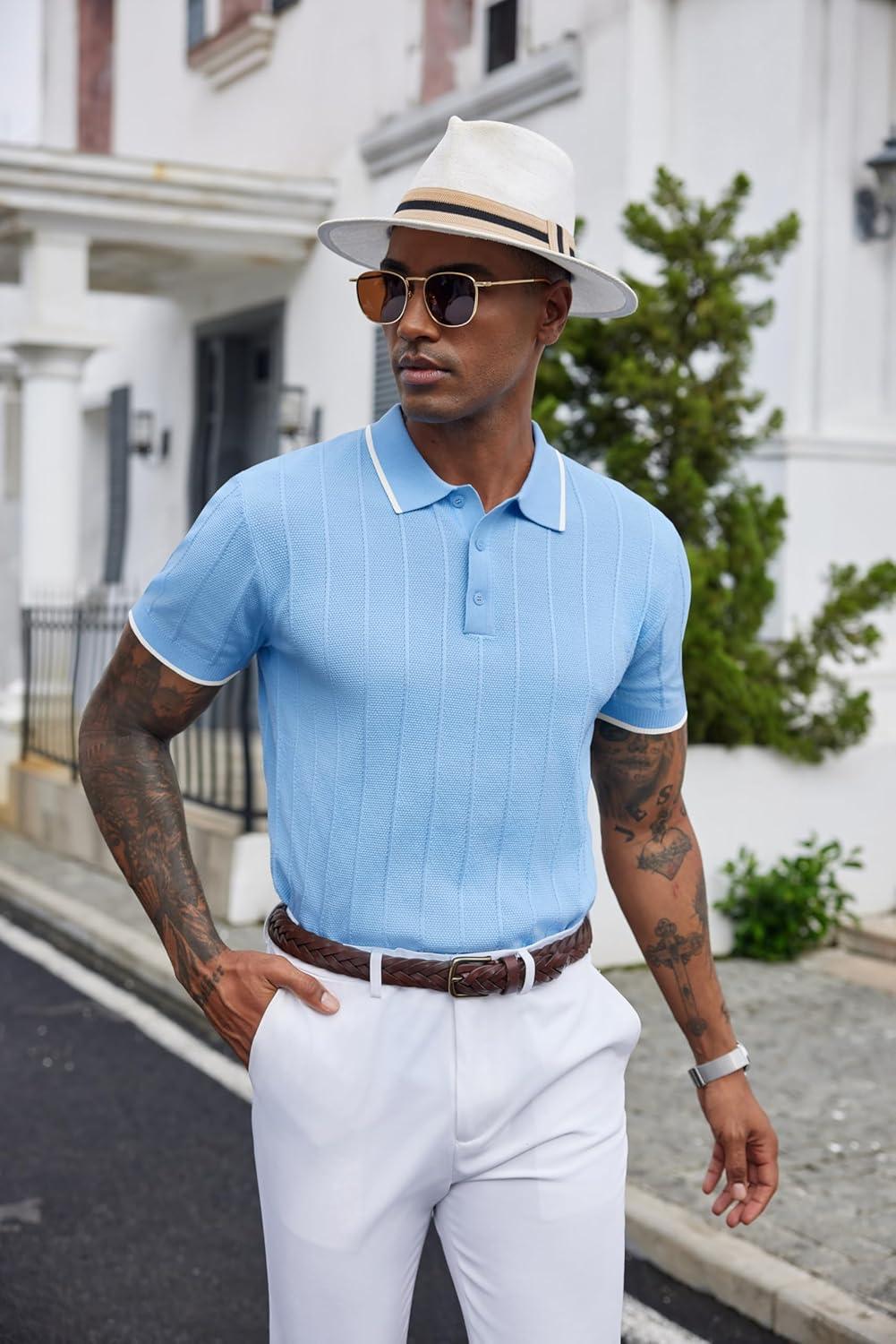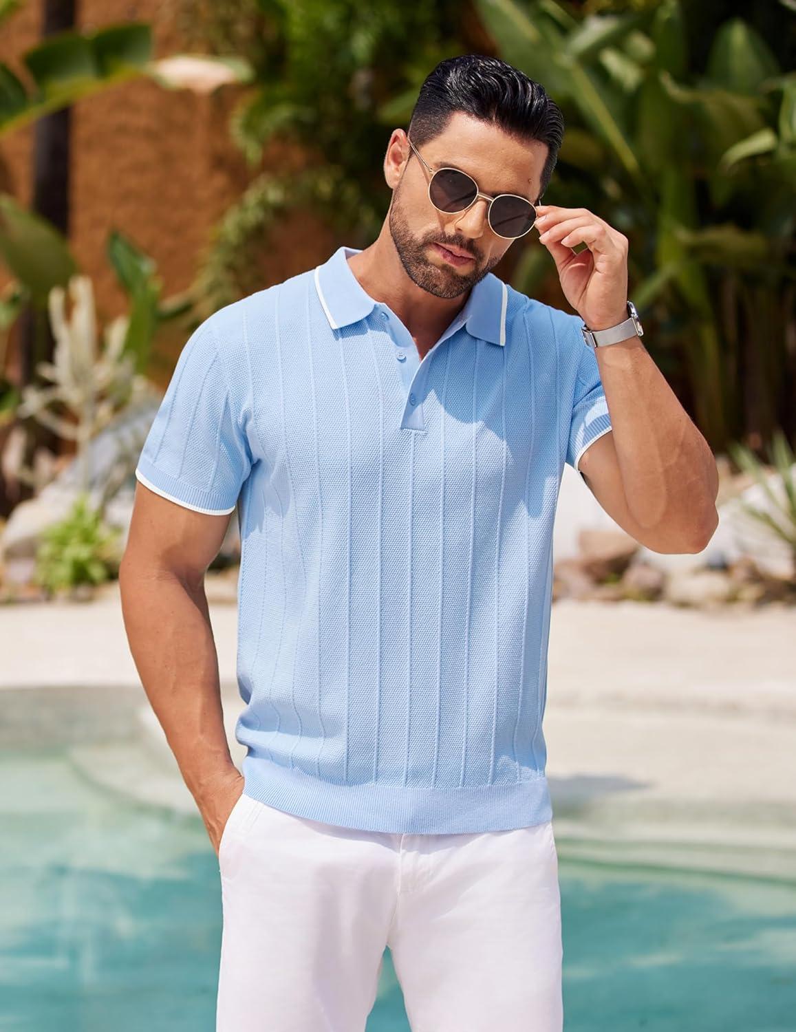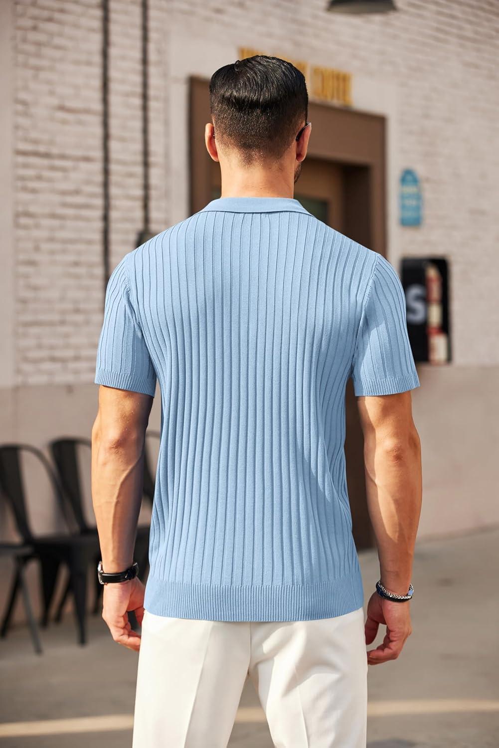 COOFANDY Men’s Zipper Polo Shirts Short Sleeve Ribbed Knit Polo T Shirts Fashion Casual Golf Shirts(Sky Blue)