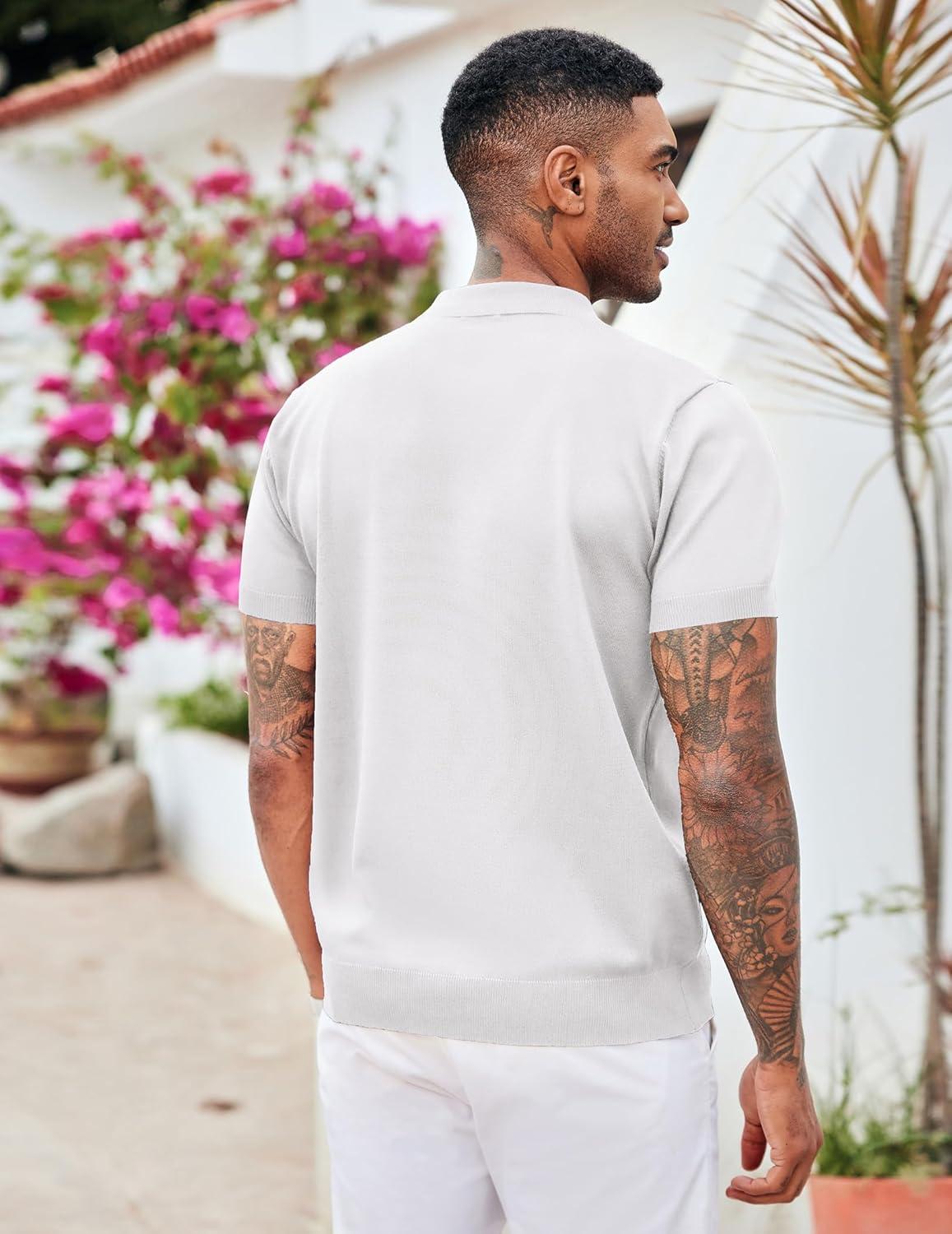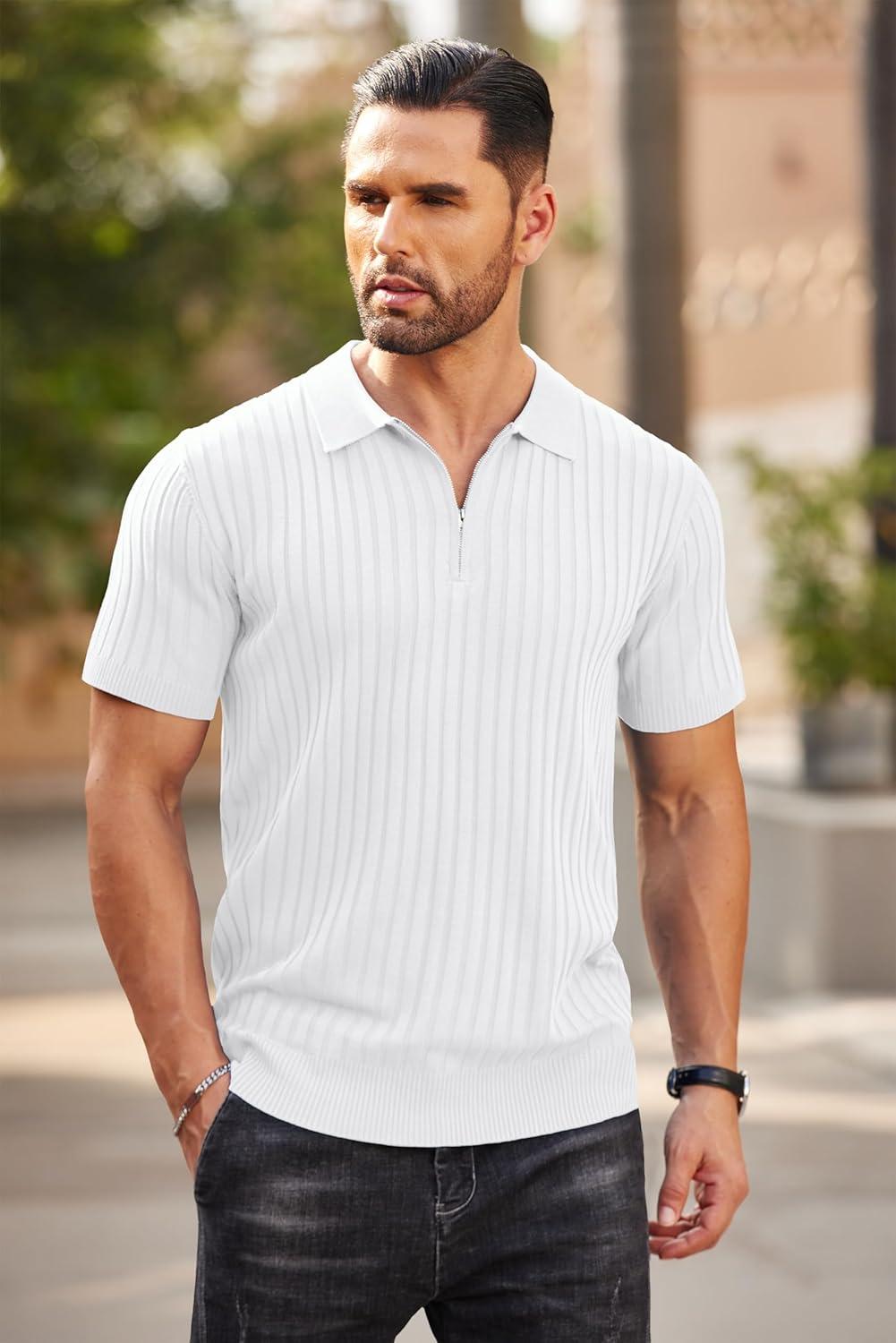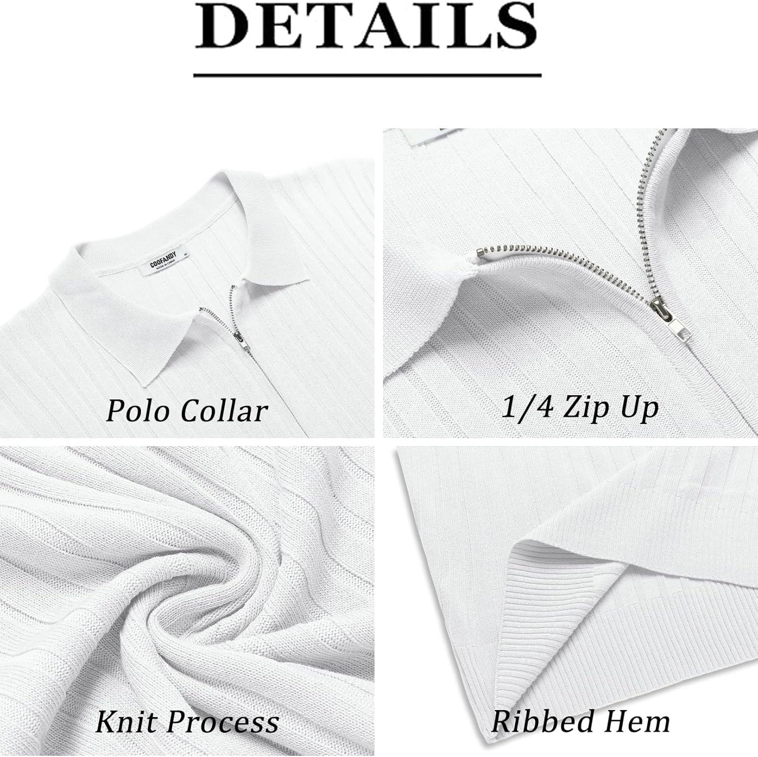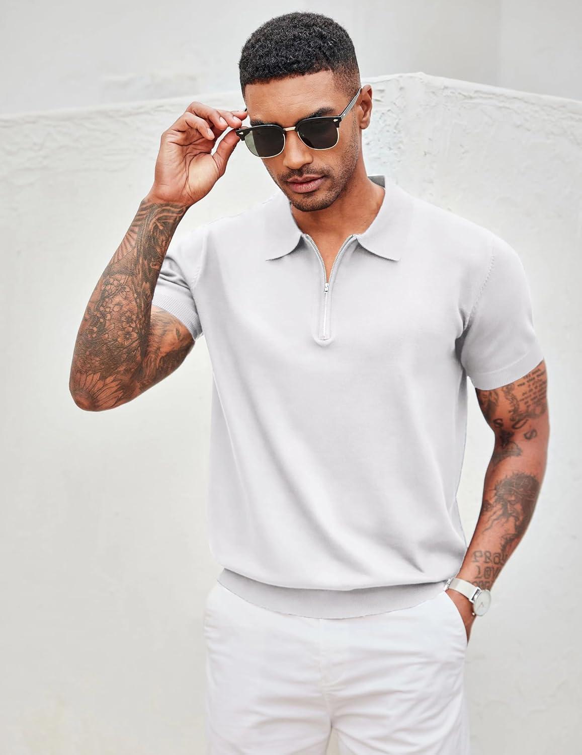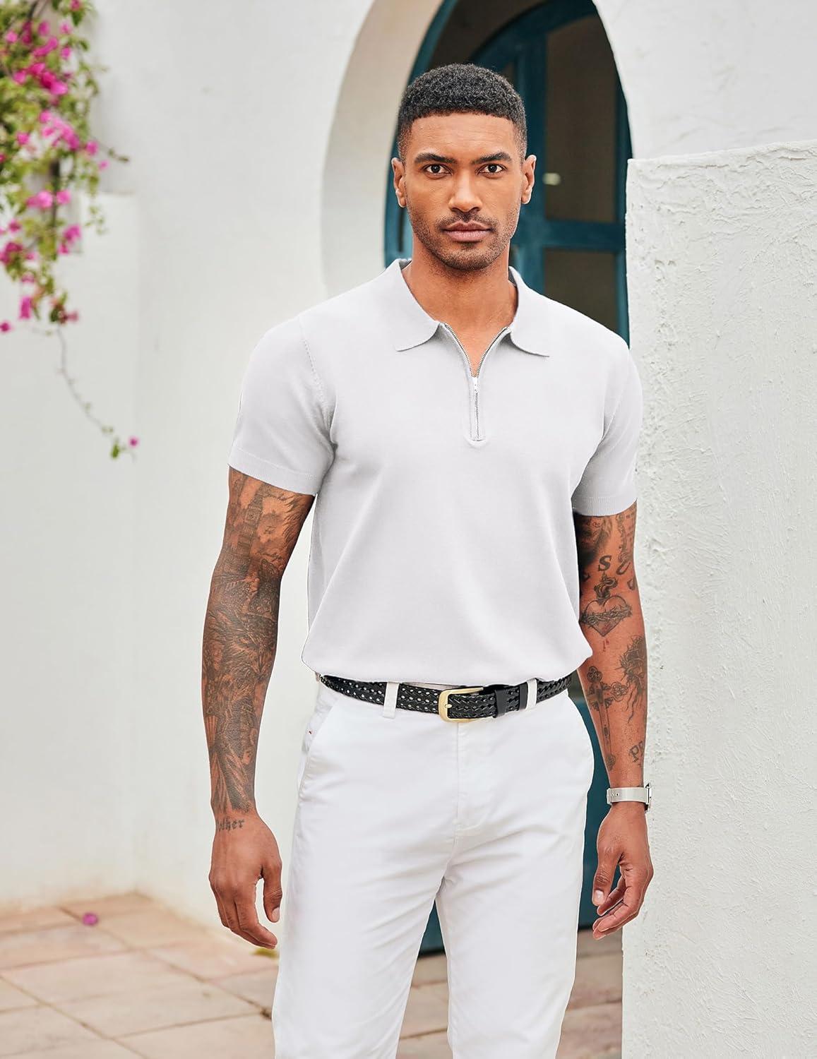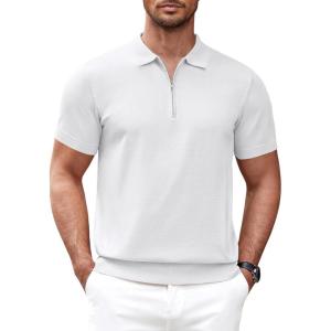 COOFANDY Men’s Zipper Polo Shirt Casual Knit Short Sleeve Polo T Shirt Classic Fit Shirts(White)