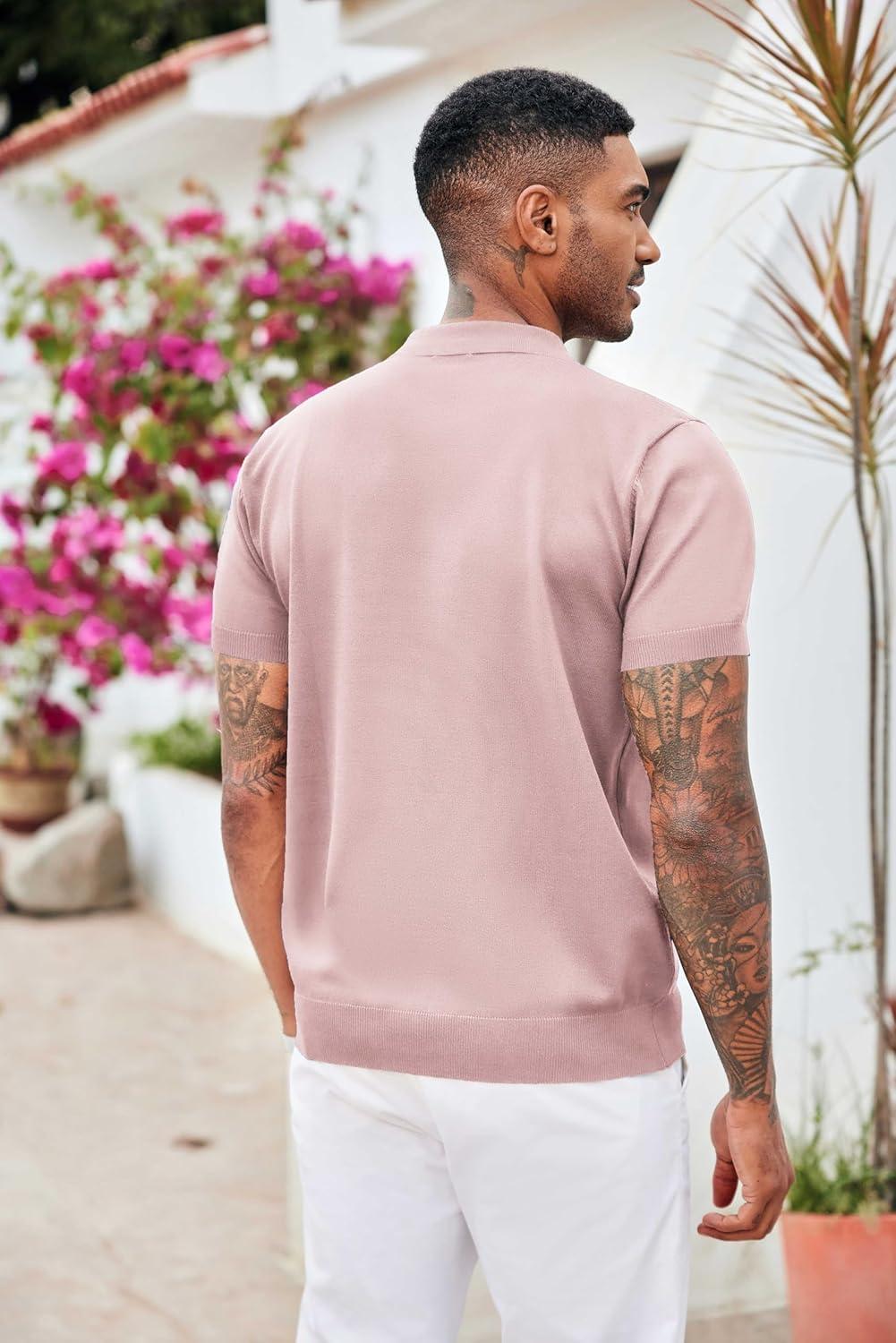 COOFANDY Men’s Zipper Polo Shirt Casual Knit Short Sleeve Polo T Shirt Classic Fit Shirts(Solid- Pink)