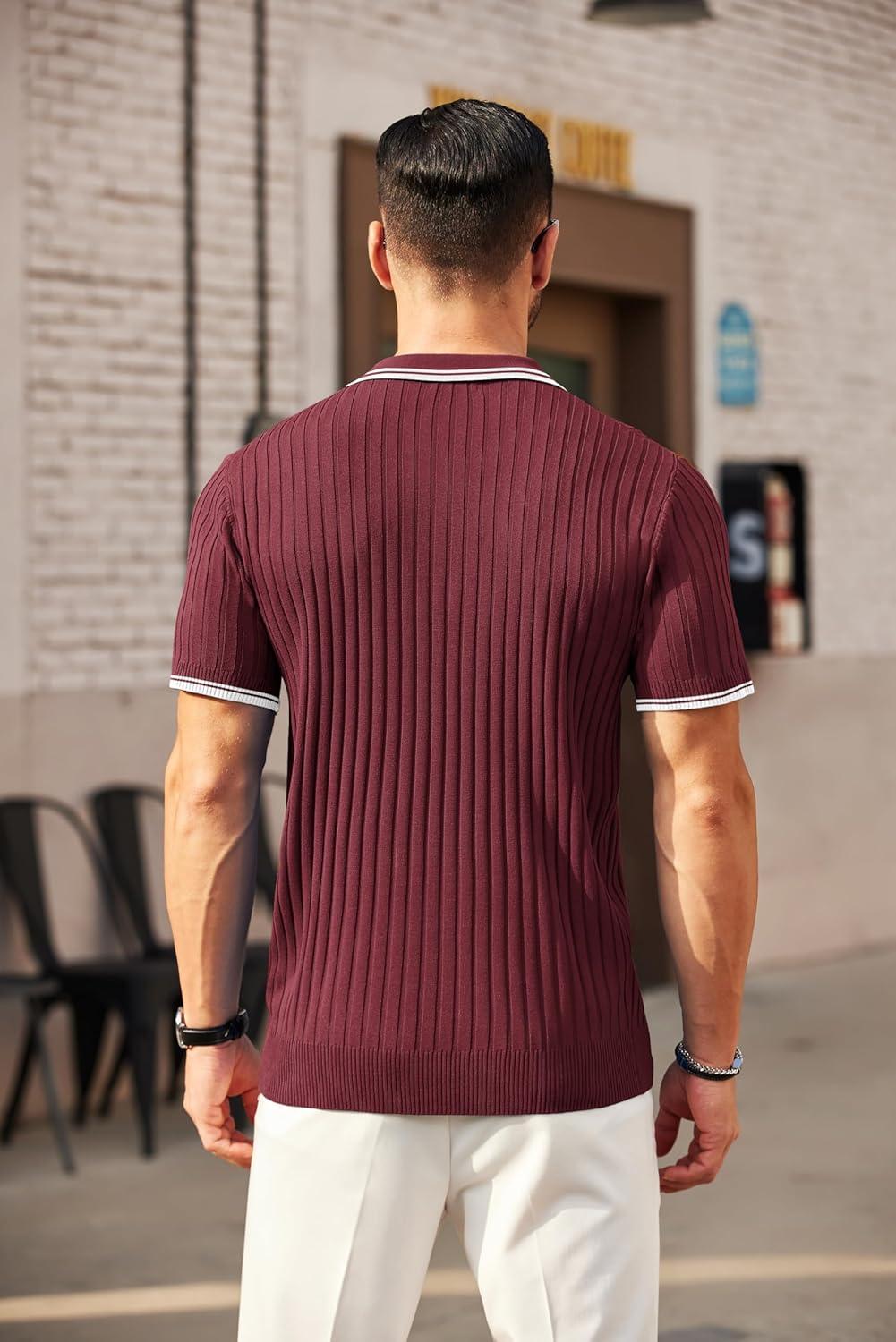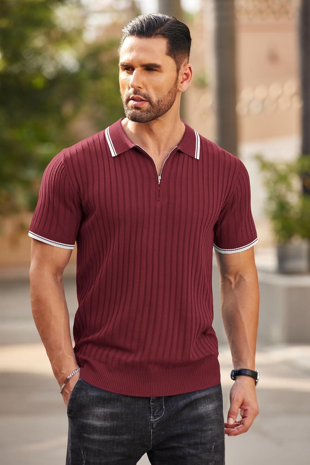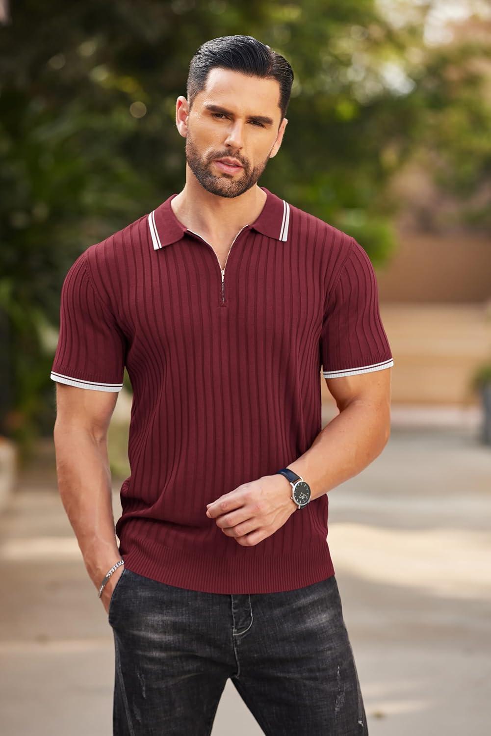 COOFANDY Men’s Zipper Polo Shirts Short Sleeve Ribbed Knit Polo T Shirts Fashion Casual Golf Shirts(Striped Wine Red Striped)