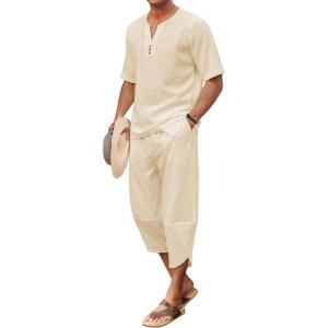 COOFANDY Men’s 2 Pieces Linen Set Henley Shirt Short Sleeve and Harem Capri Pants Wide Leg Baggy Beach Yoga Trousers Outfits(Beige)