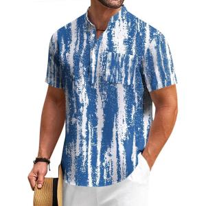 COOFANDY Men Casual Henley Tee Shirt Short Sleeve Band Collar Summer Beach Textured T-Shirt(Blue Palm Leaves)