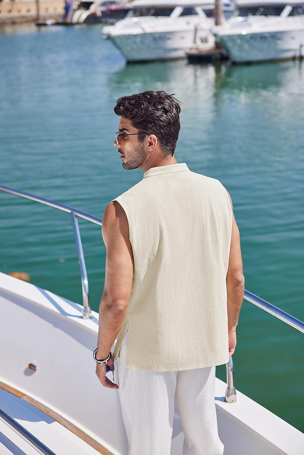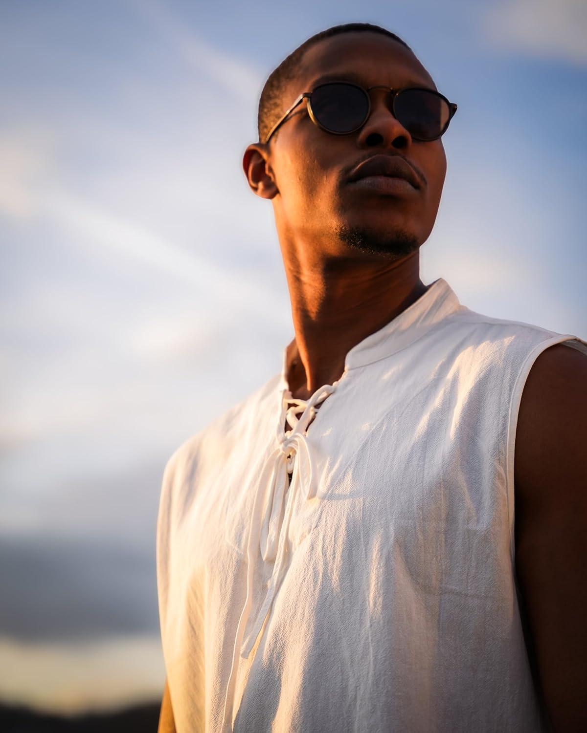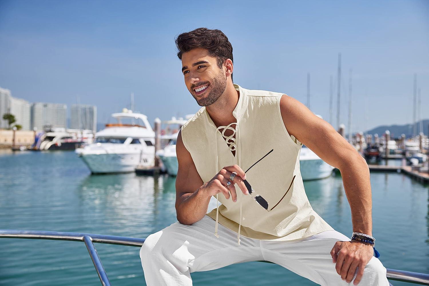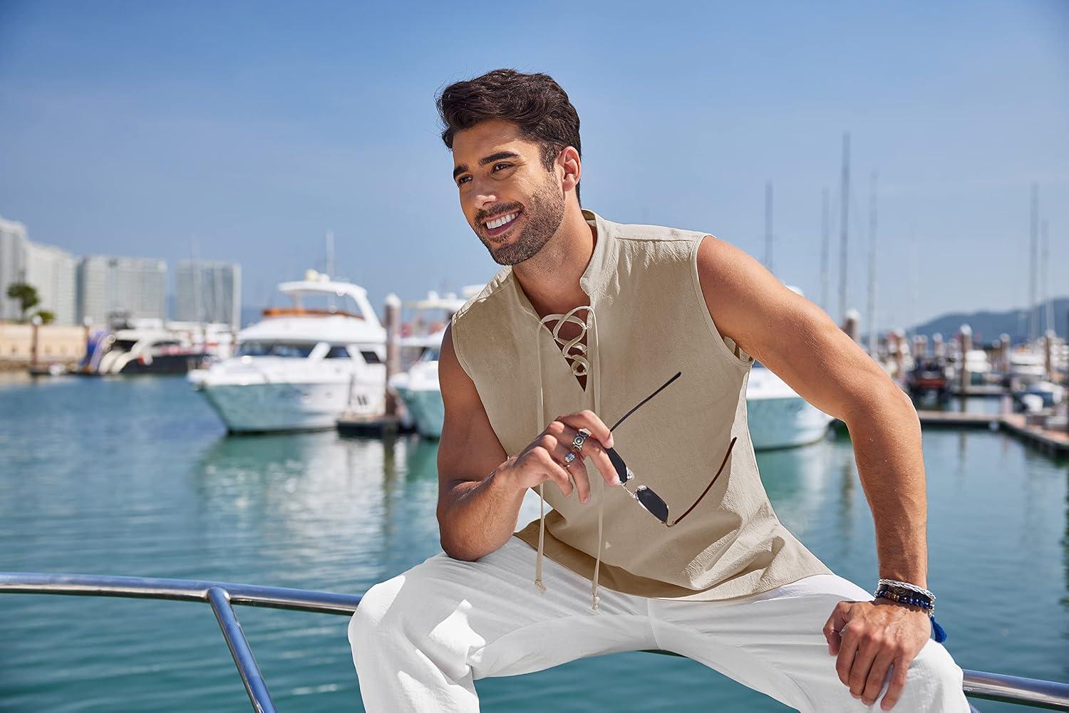 COOFANDY Men Tank Top Cotton Linen Beach Sleeveless Shirt Lace Up Bohemian Hippie Renaissance Pirate Kilt Medieval Tunic(Cream)