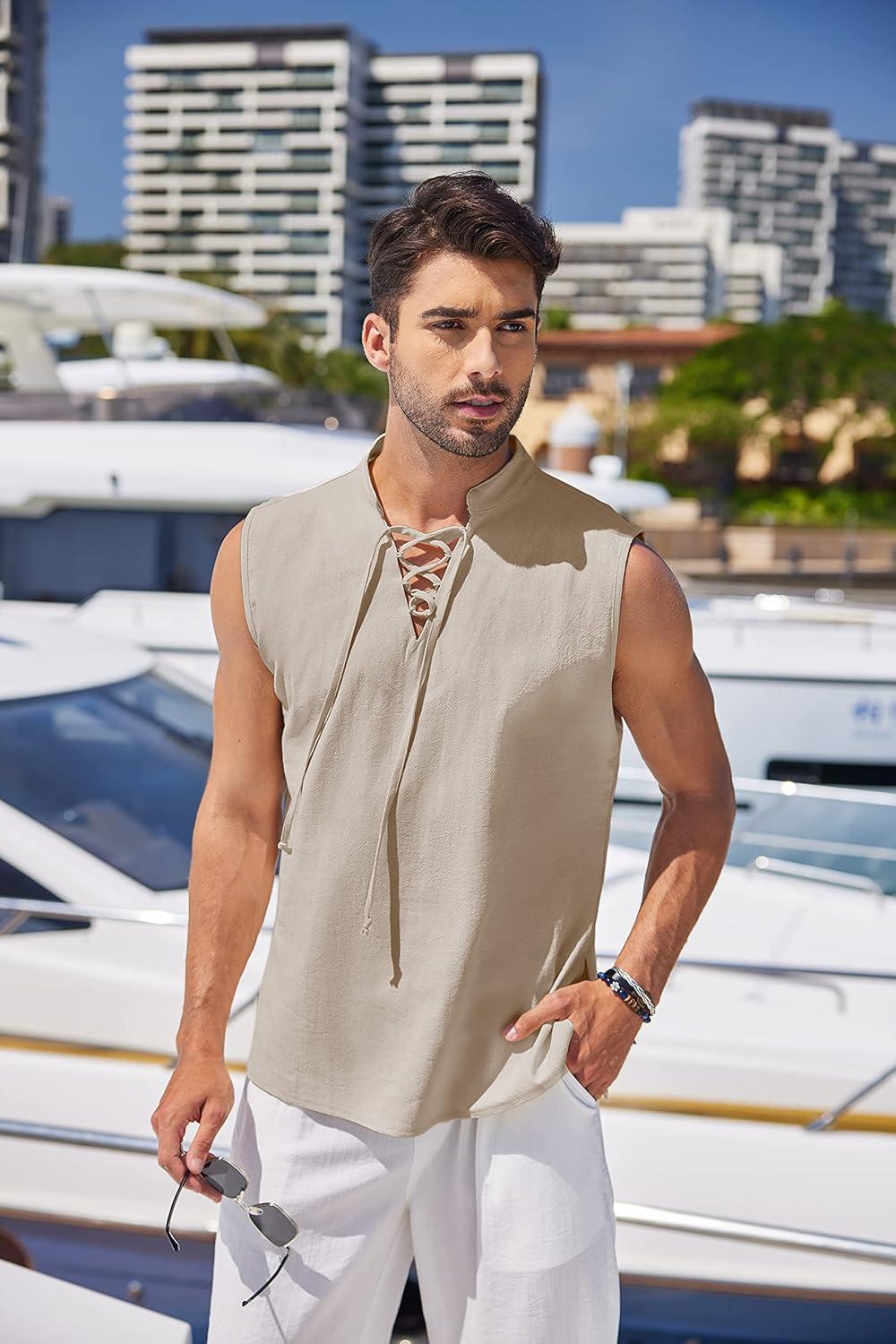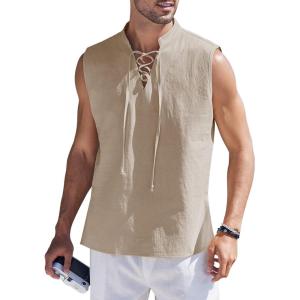 COOFANDY Men Tank Top Cotton Linen Beach Sleeveless Shirt Lace Up Bohemian Hippie Renaissance Pirate Kilt Medieval Tunic(Khaki)