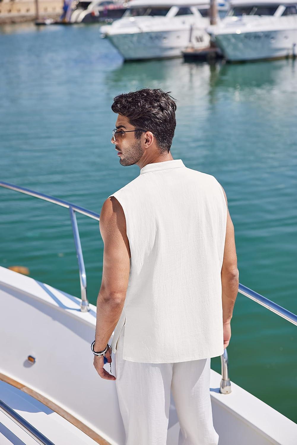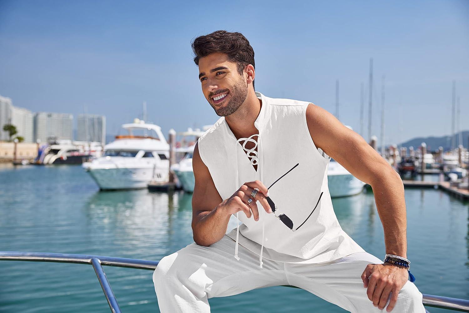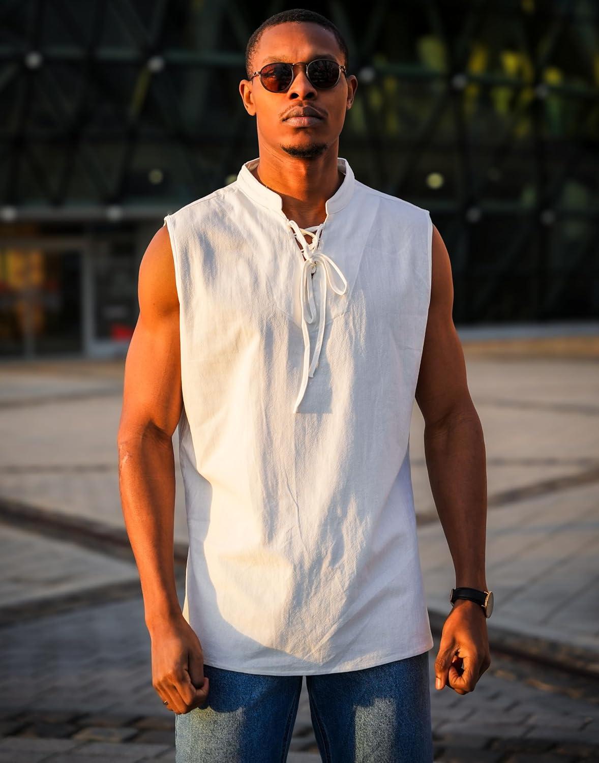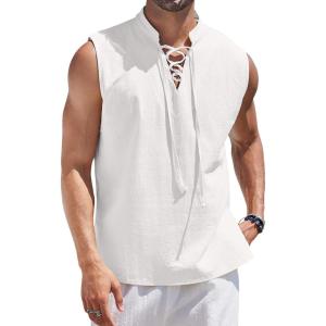 COOFANDY Men Tank Top Cotton Linen Beach Sleeveless Shirt Lace Up Bohemian Hippie Renaissance Pirate Kilt Medieval Tunic(White)