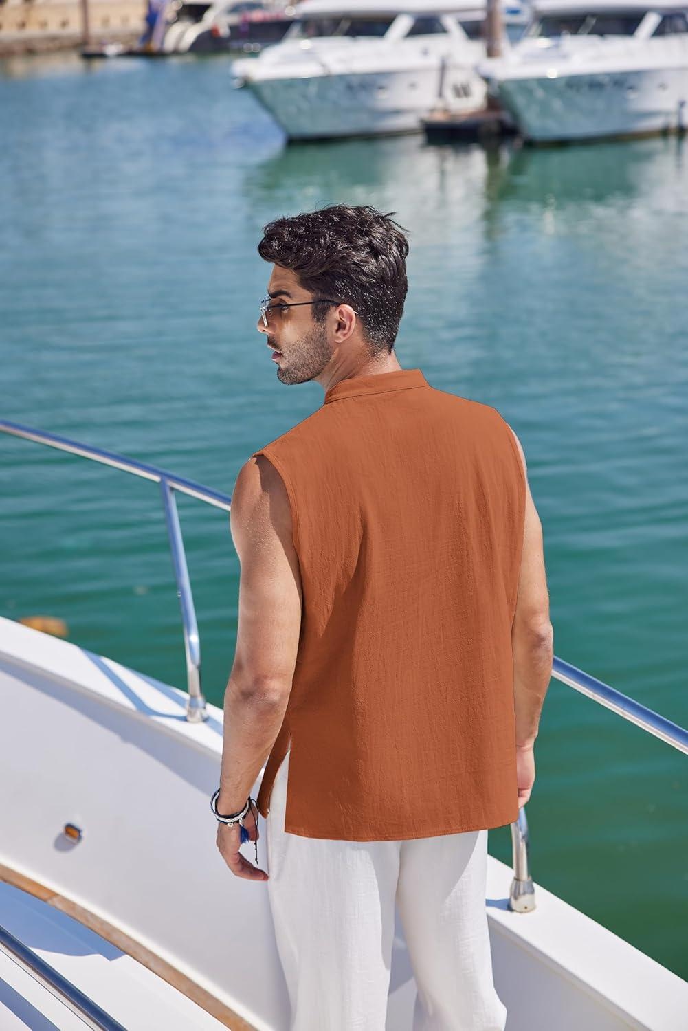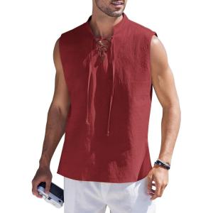 COOFANDY Men Tank Top Cotton Linen Beach Sleeveless Shirt Lace Up Bohemian Hippie Renaissance Pirate Kilt Medieval Tunic(Brick Red)
