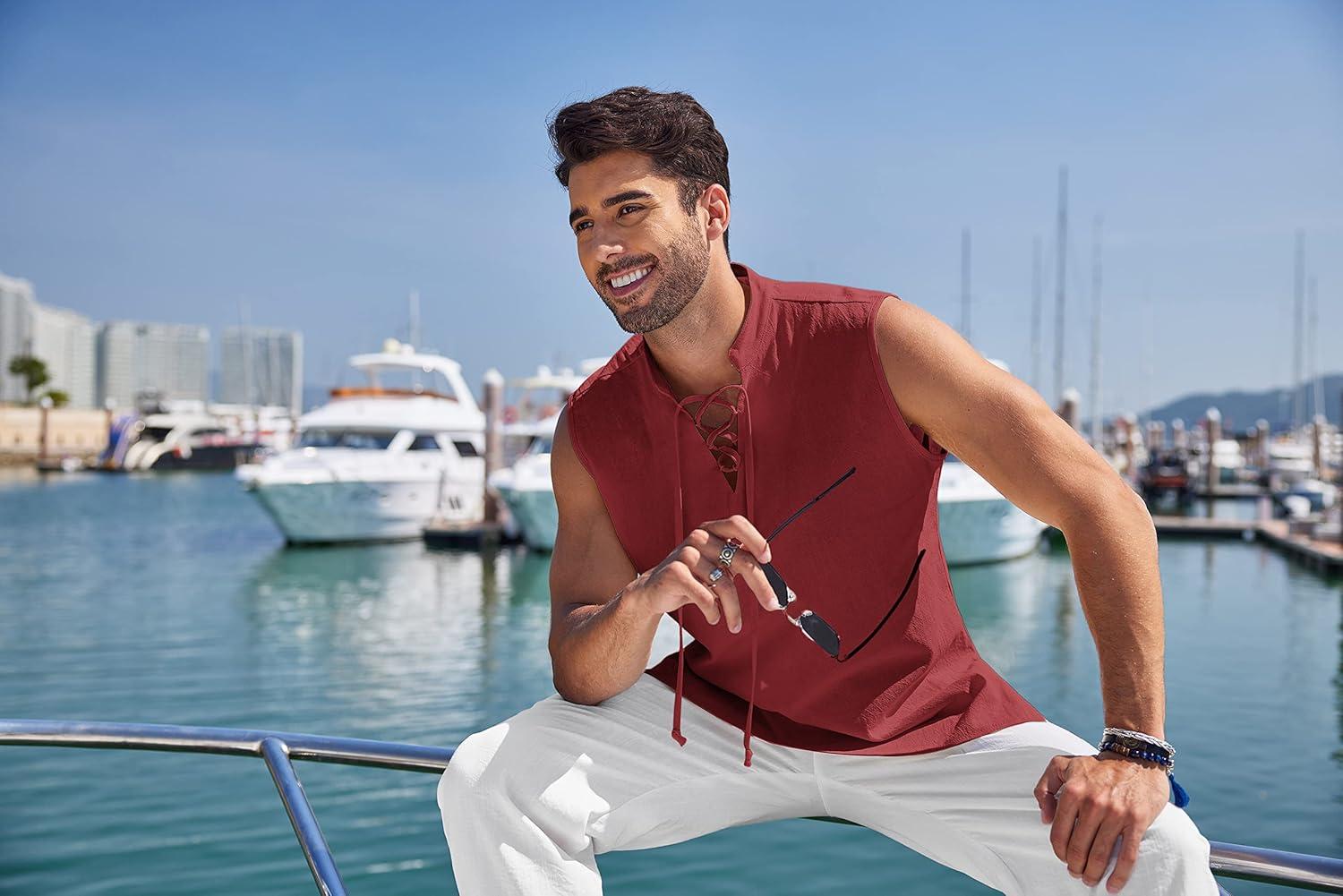 COOFANDY Men Tank Top Cotton Linen Beach Sleeveless Shirt Lace Up Bohemian Hippie Renaissance Pirate Kilt Medieval Tunic(Wine)
