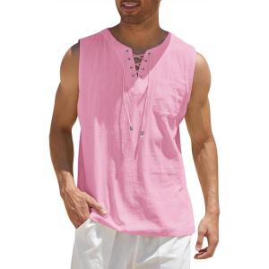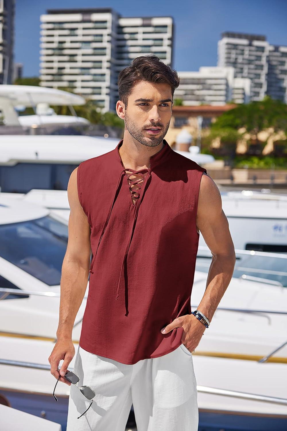 COOFANDY Men Tank Top Cotton Linen Beach Sleeveless Shirt Lace Up Bohemian Hippie Renaissance Pirate Kilt Medieval Tunic(Wine)