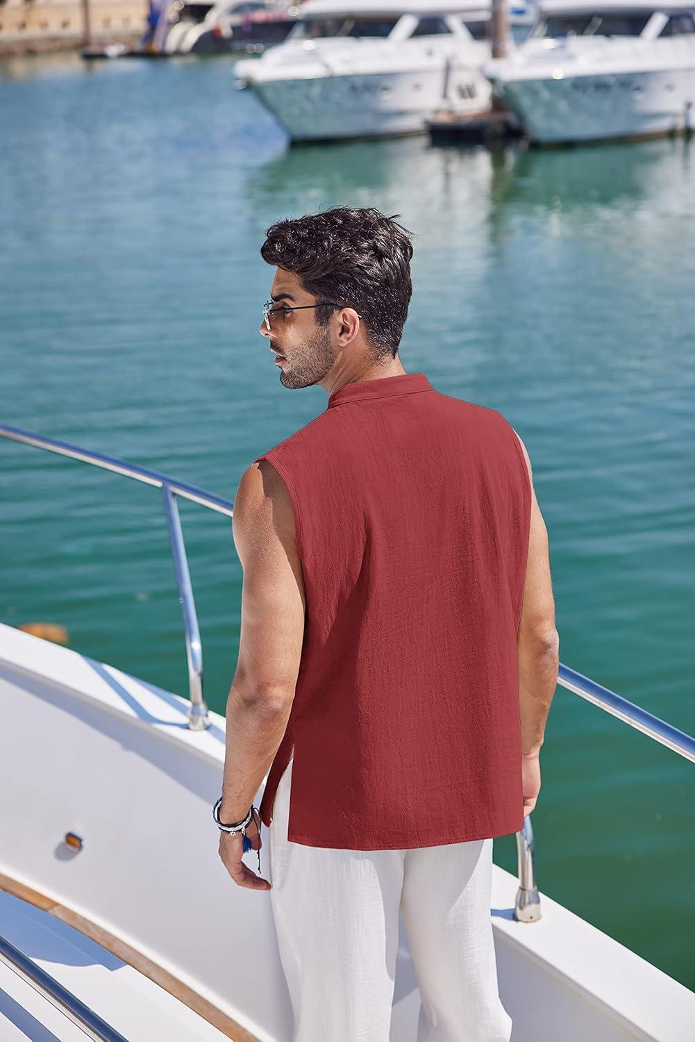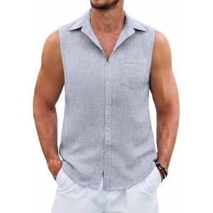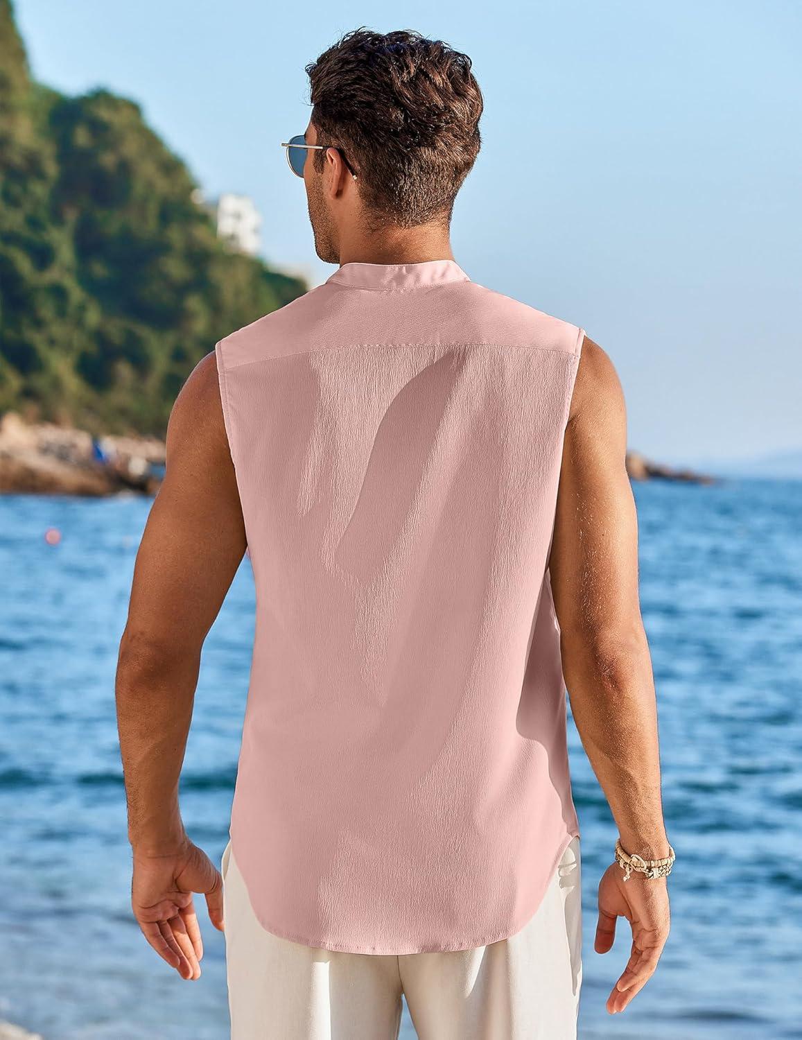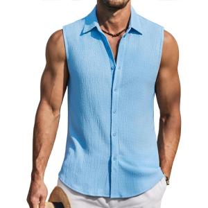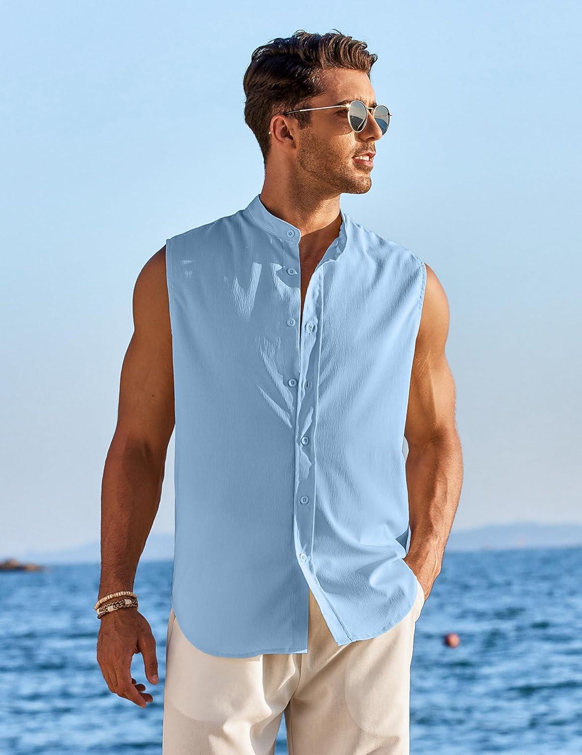 COOFANDY Mens Sleeveless Button Down Beach Shirts Casual Summer Tank Tops Collared Imitation Linen Tank Shirt(Light Blue)