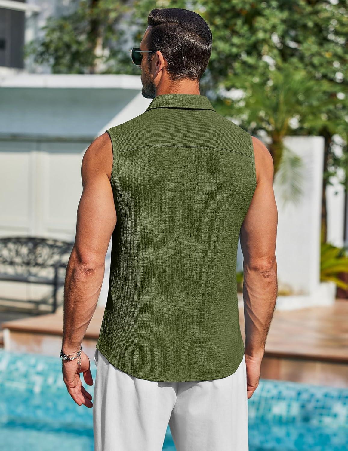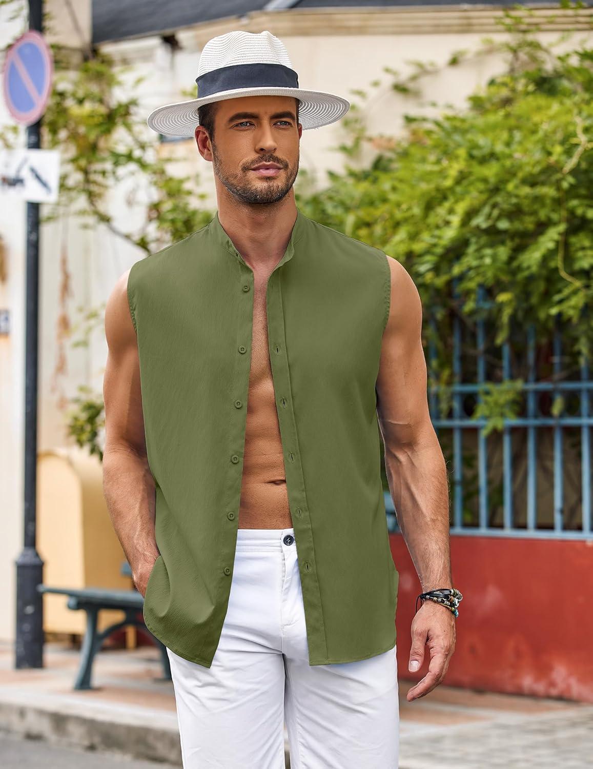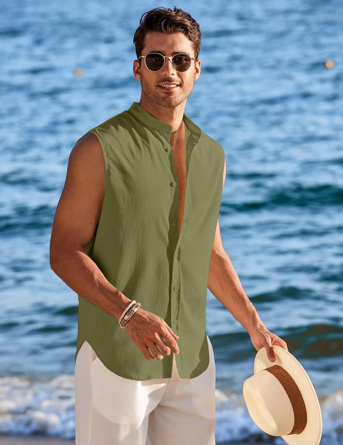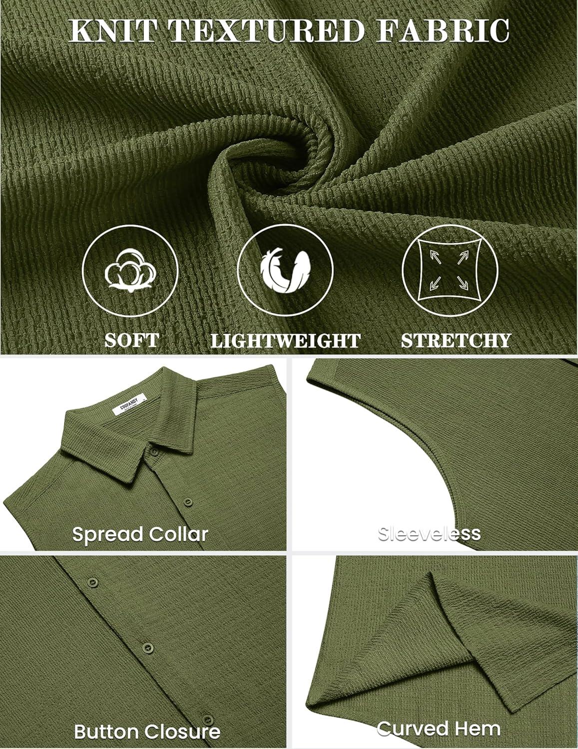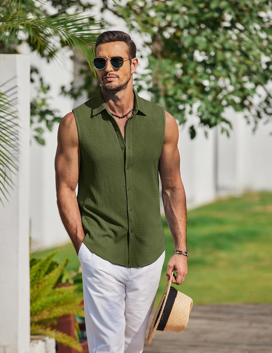 COOFANDY Mens Sleeveless Summer Shirts Beach Tank Tops Button Up Textured Tank Shirt for Vacation(Army Green)