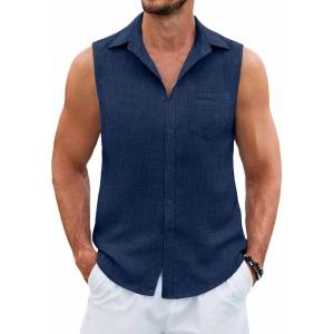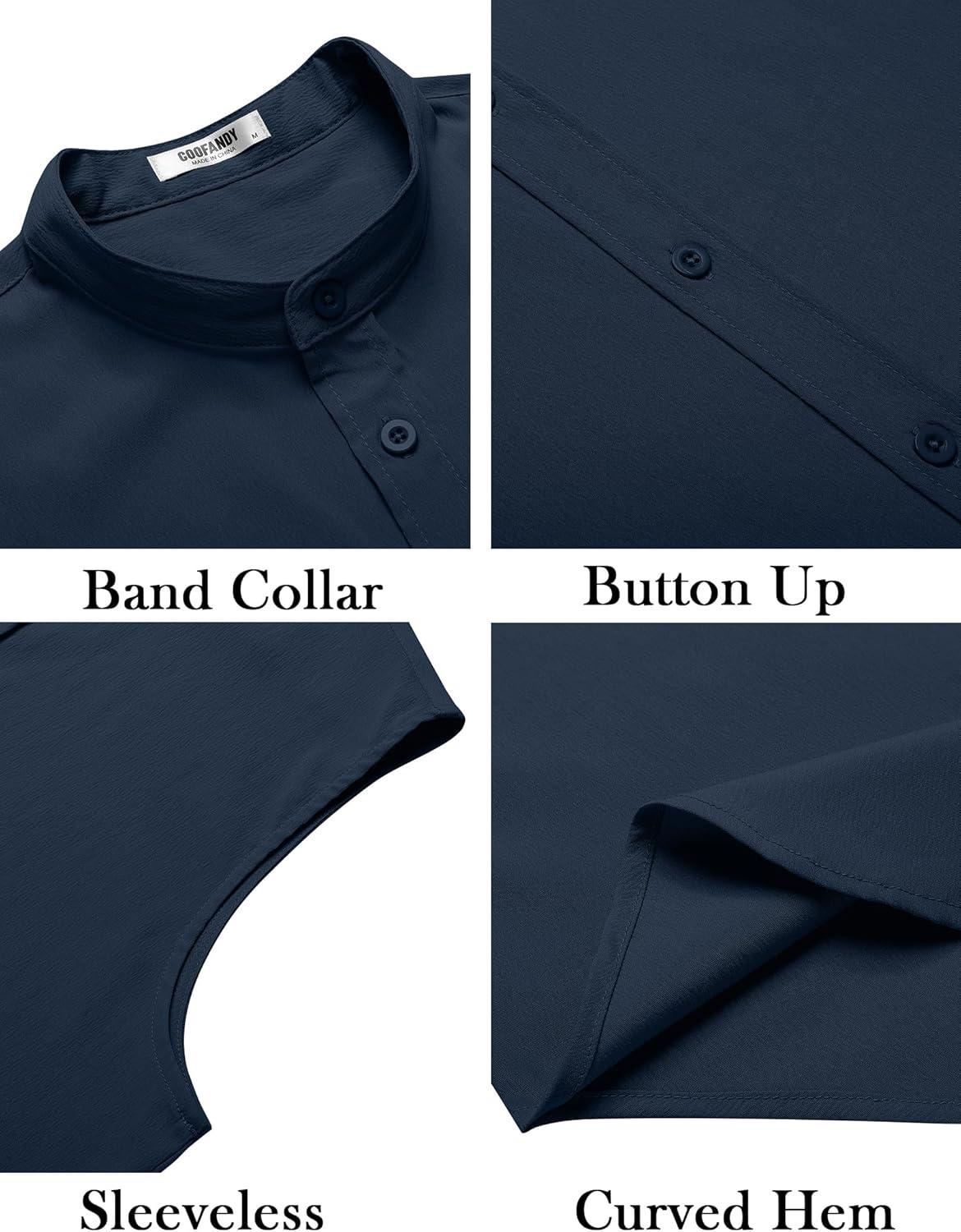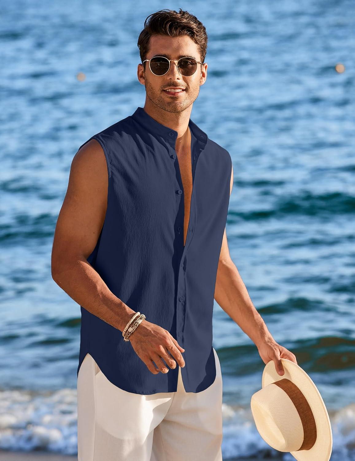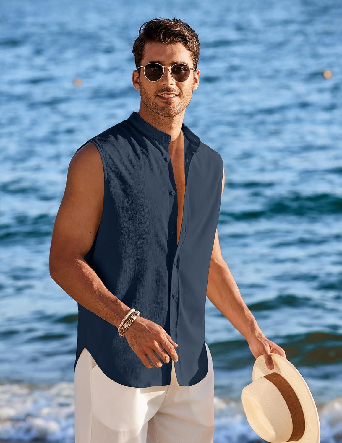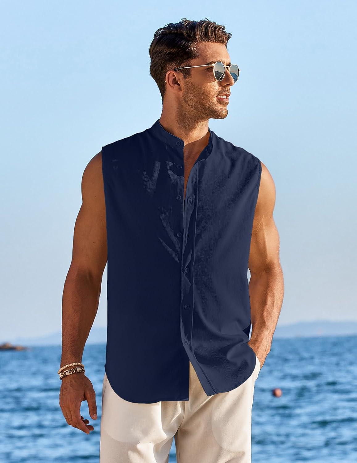 COOFANDY Mens Sleeveless Button Down Beach Shirts Casual Summer Tank Tops Collared Imitation Linen Tank Shirt(Dark Blue Grey)