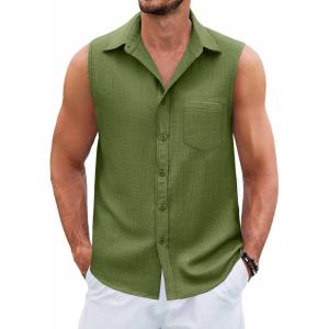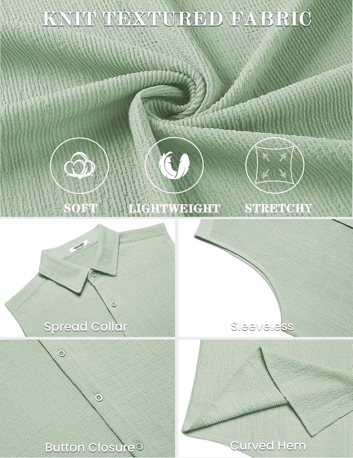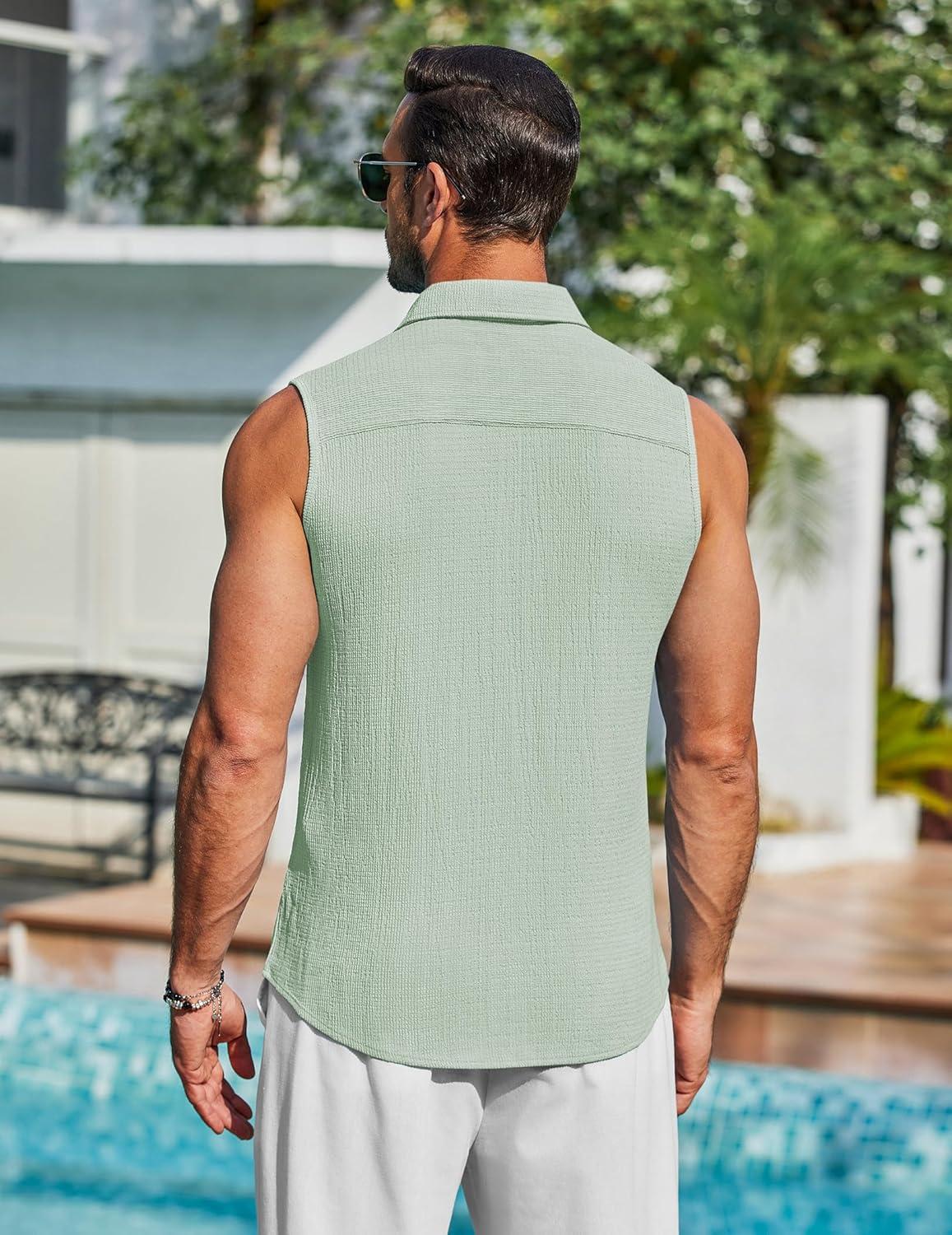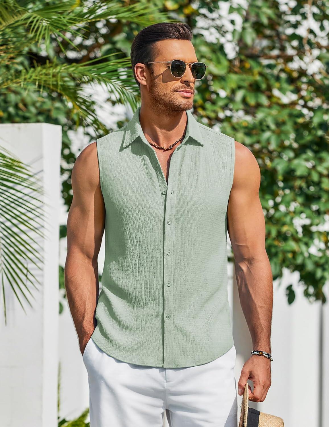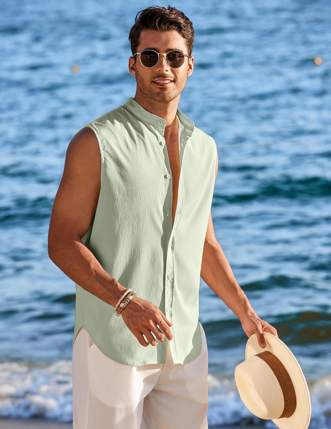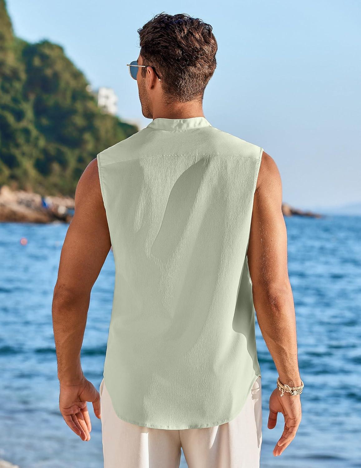 COOFANDY Mens Sleeveless Button Down Beach Shirts Casual Summer Tank Tops Collared Imitation Linen Tank Shirt(Light Green)