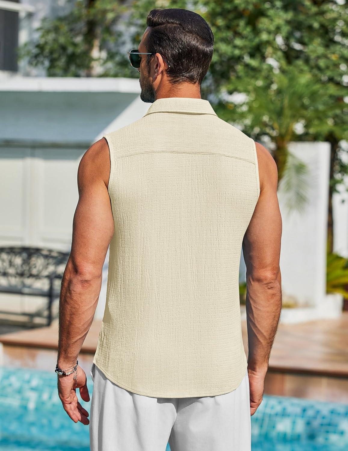 COOFANDY Mens Sleeveless Summer Shirts Beach Tank Tops Button Up Textured Tank Shirt for Vacation(Cream)