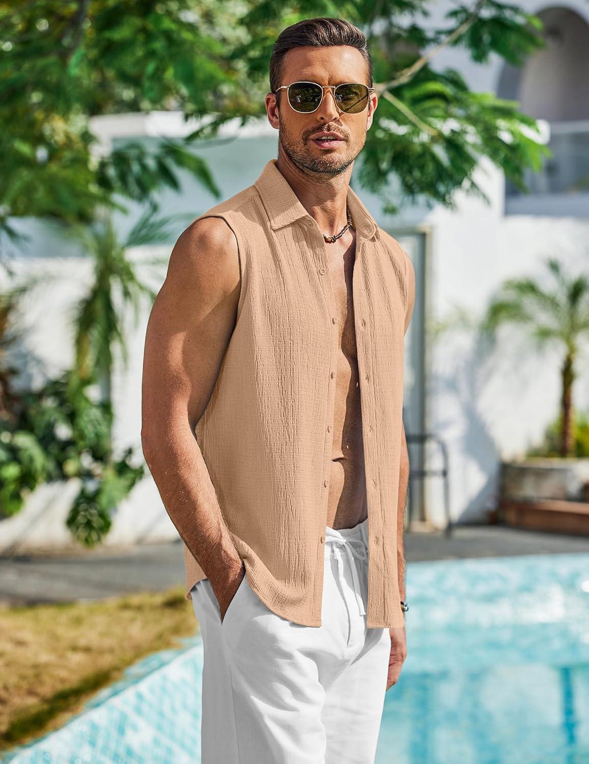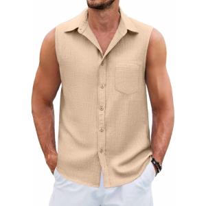 COOFANDY Mens Sleeveless Button Down Beach Shirts Casual Summer Tank Tops Collared Imitation Linen Tank Shirt(Light Khaki)