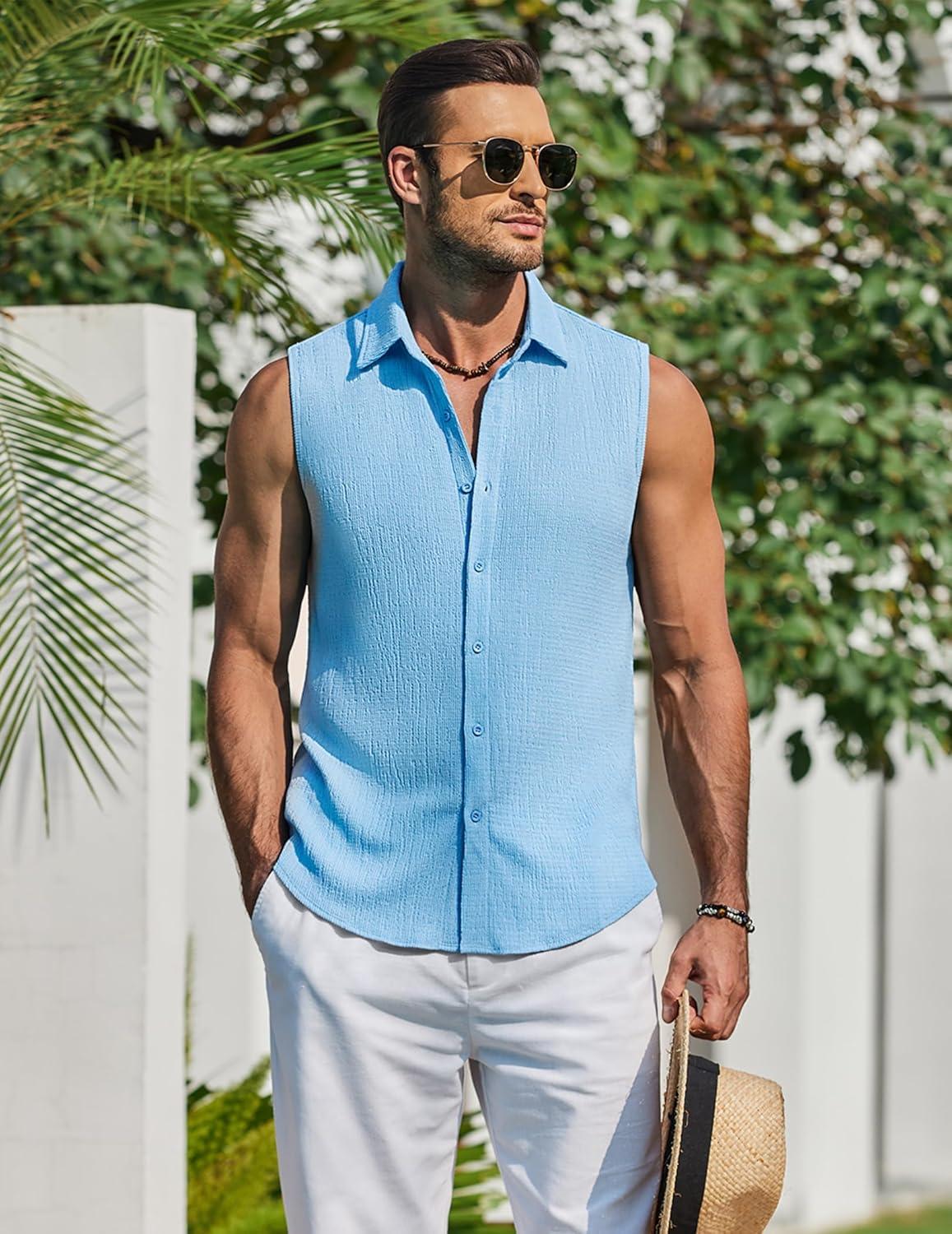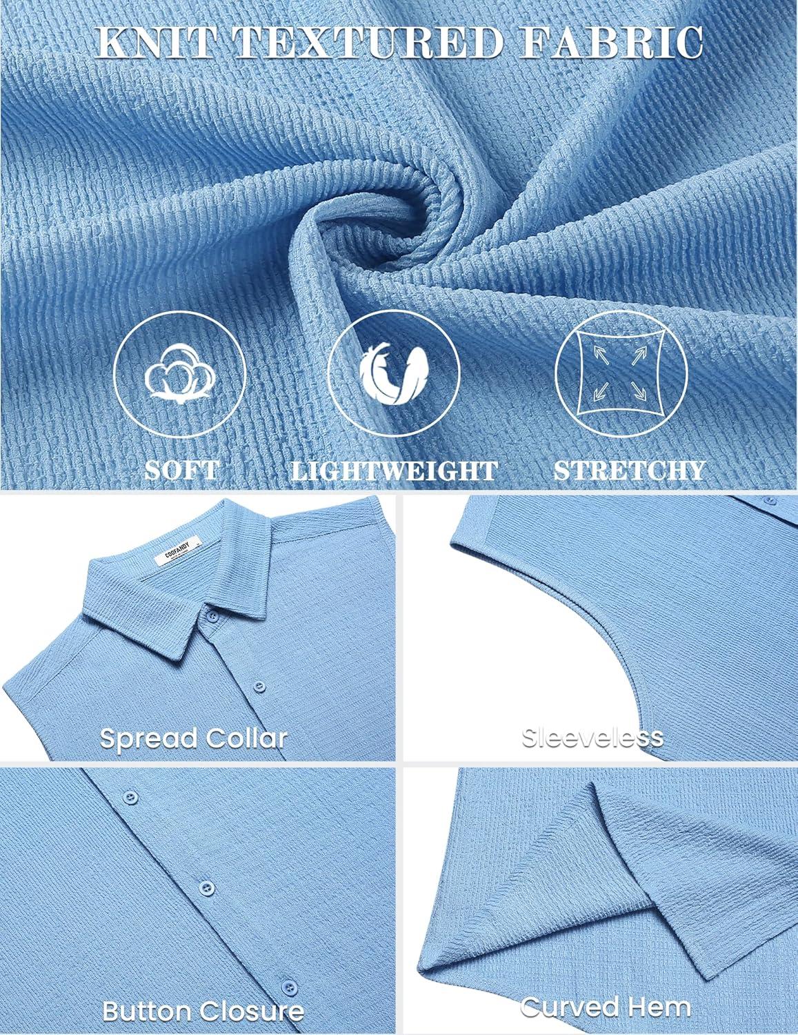 COOFANDY Mens Sleeveless Summer Shirts Beach Tank Tops Button Up Textured Tank Shirt for Vacation(Light Blue)