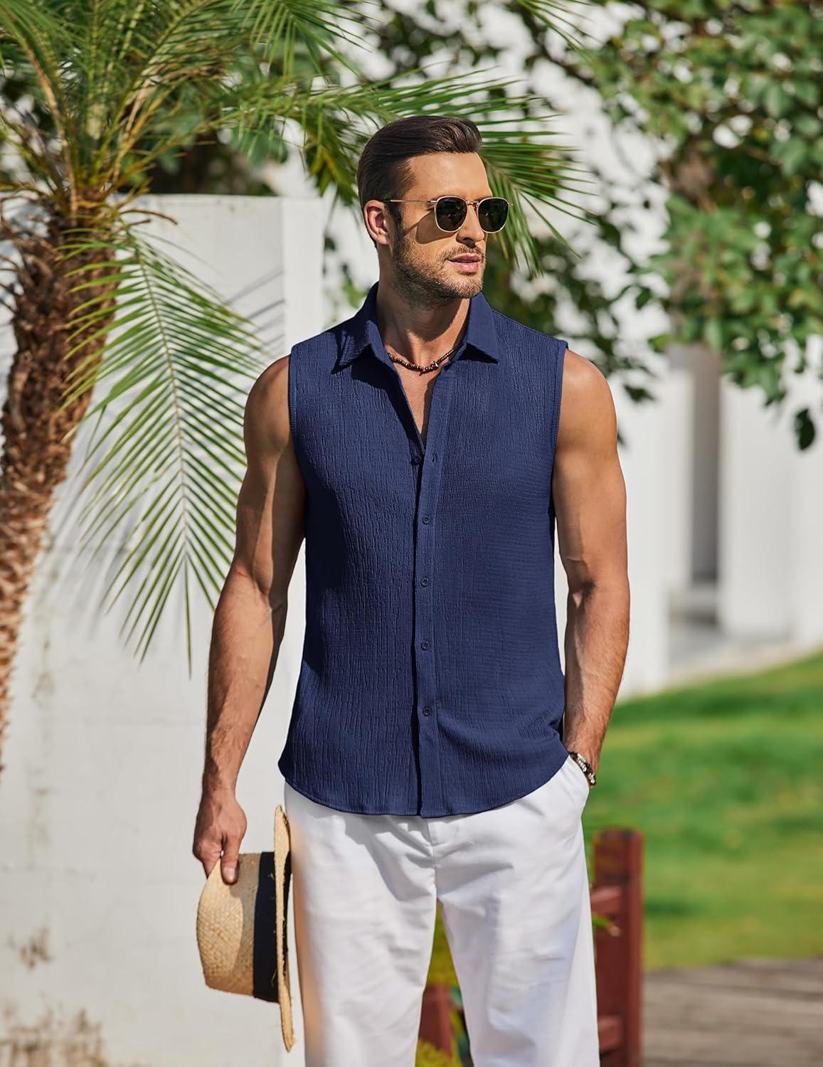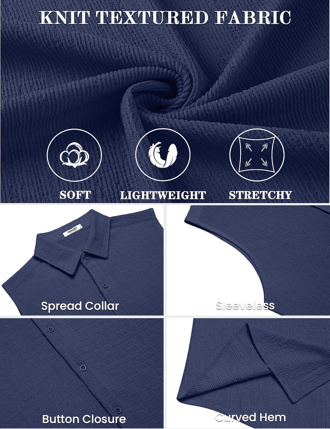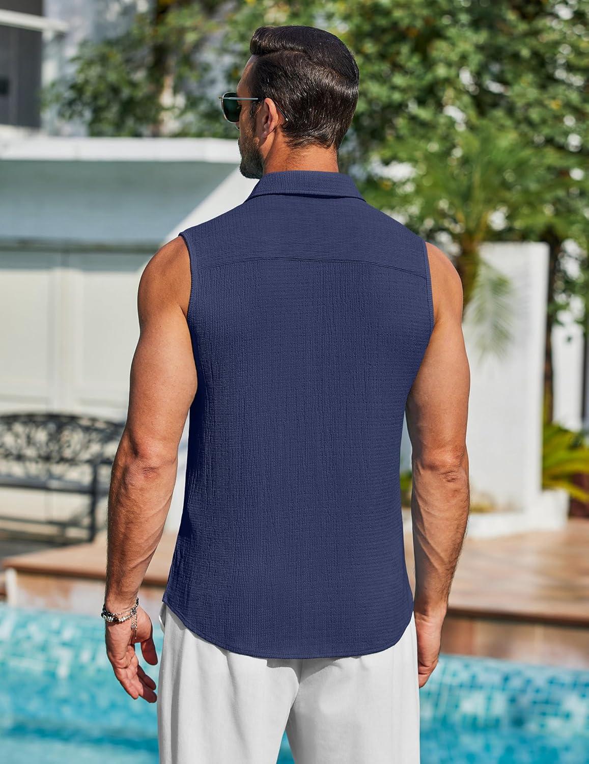 COOFANDY Mens Sleeveless Summer Shirts Beach Tank Tops Button Up Textured Tank Shirt for Vacation(Navy Blue)