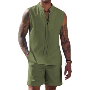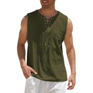 COOFANDY Men Tank Top Cotton Linen Beach Sleeveless Shirt Lace Up Bohemian Hippie Renaissance Pirate Kilt Medieval Tunic(Army Green)