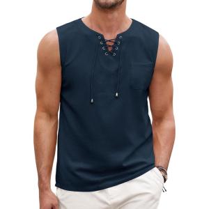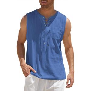 COOFANDY Men Tank Top Cotton Linen Beach Sleeveless Shirt Lace Up Bohemian Hippie Renaissance Pirate Kilt Medieval Tunic(Blue)
