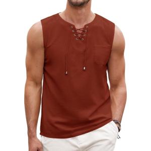 COOFANDY Men Tank Top Cotton Linen Beach Sleeveless Shirt Lace Up Bohemian Hippie Renaissance Pirate Kilt Medieval Tunic(Brick Red)