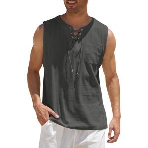 COOFANDY Men Tank Top Cotton Linen Beach Sleeveless Shirt Lace Up Bohemian Hippie Renaissance Pirate Kilt Medieval Tunic(Drak Gray)